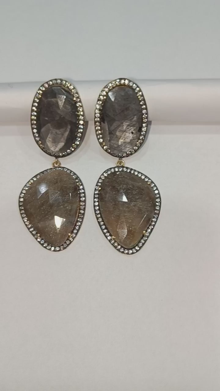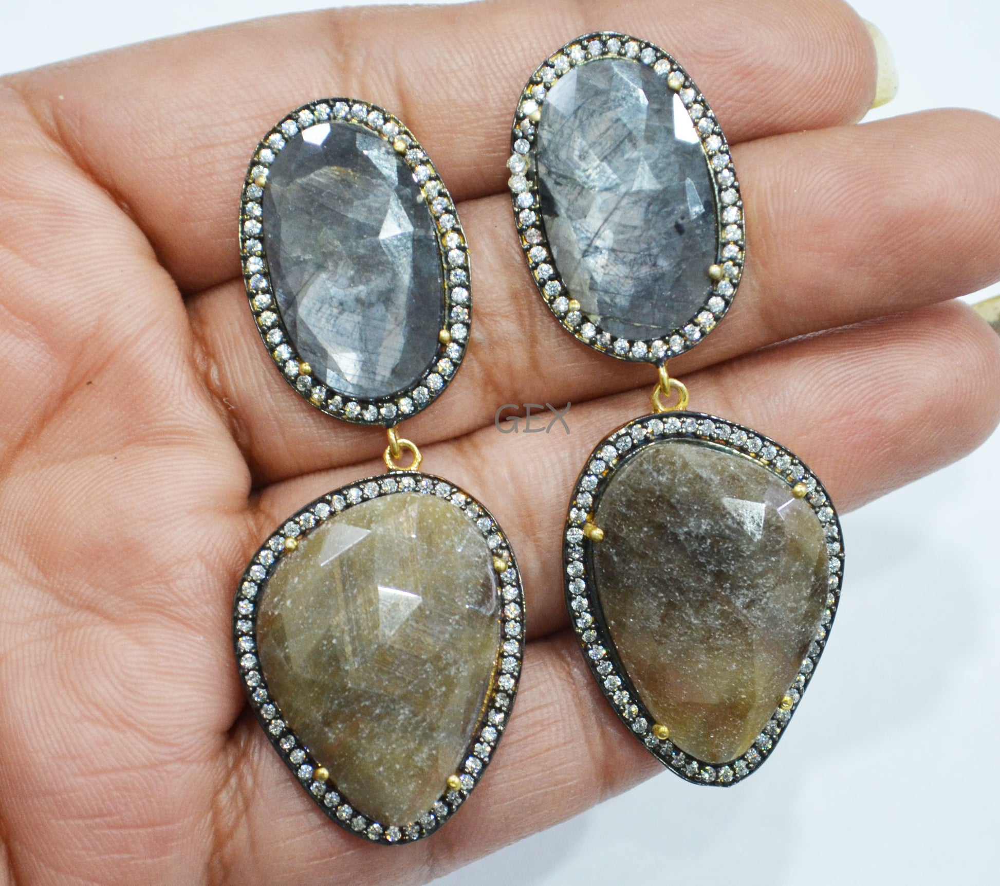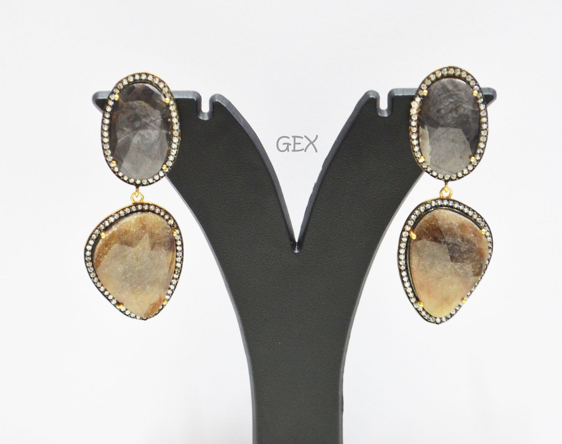 92.5 Sterling Silver Black And Brown Sapphire Faceted Fancy Shape Earring , Black And Brown Sapphire With Pave Cubic Zirconia Earring , 60 mm , E-056