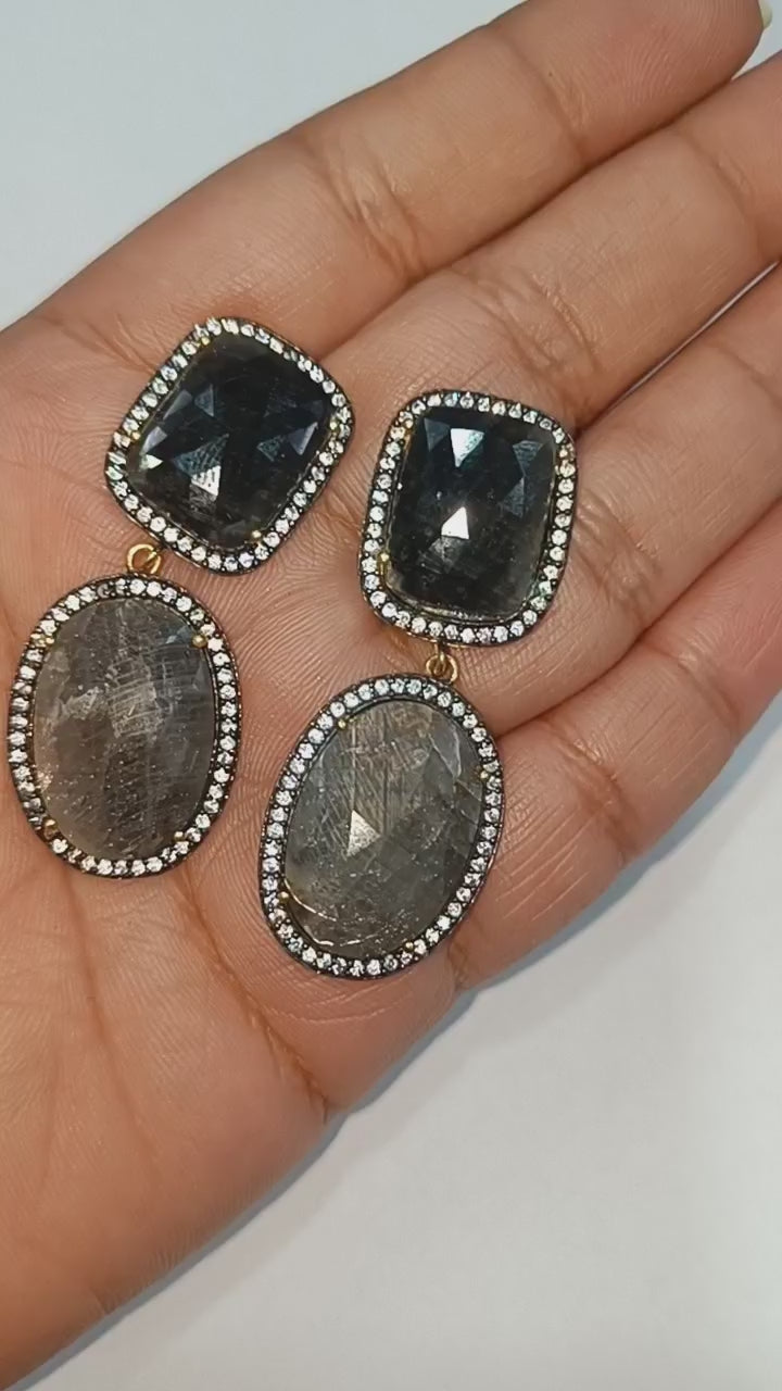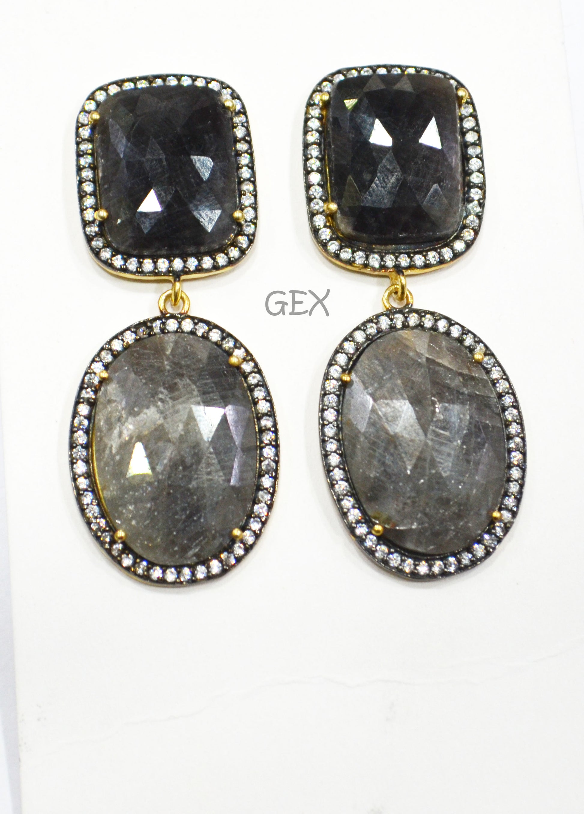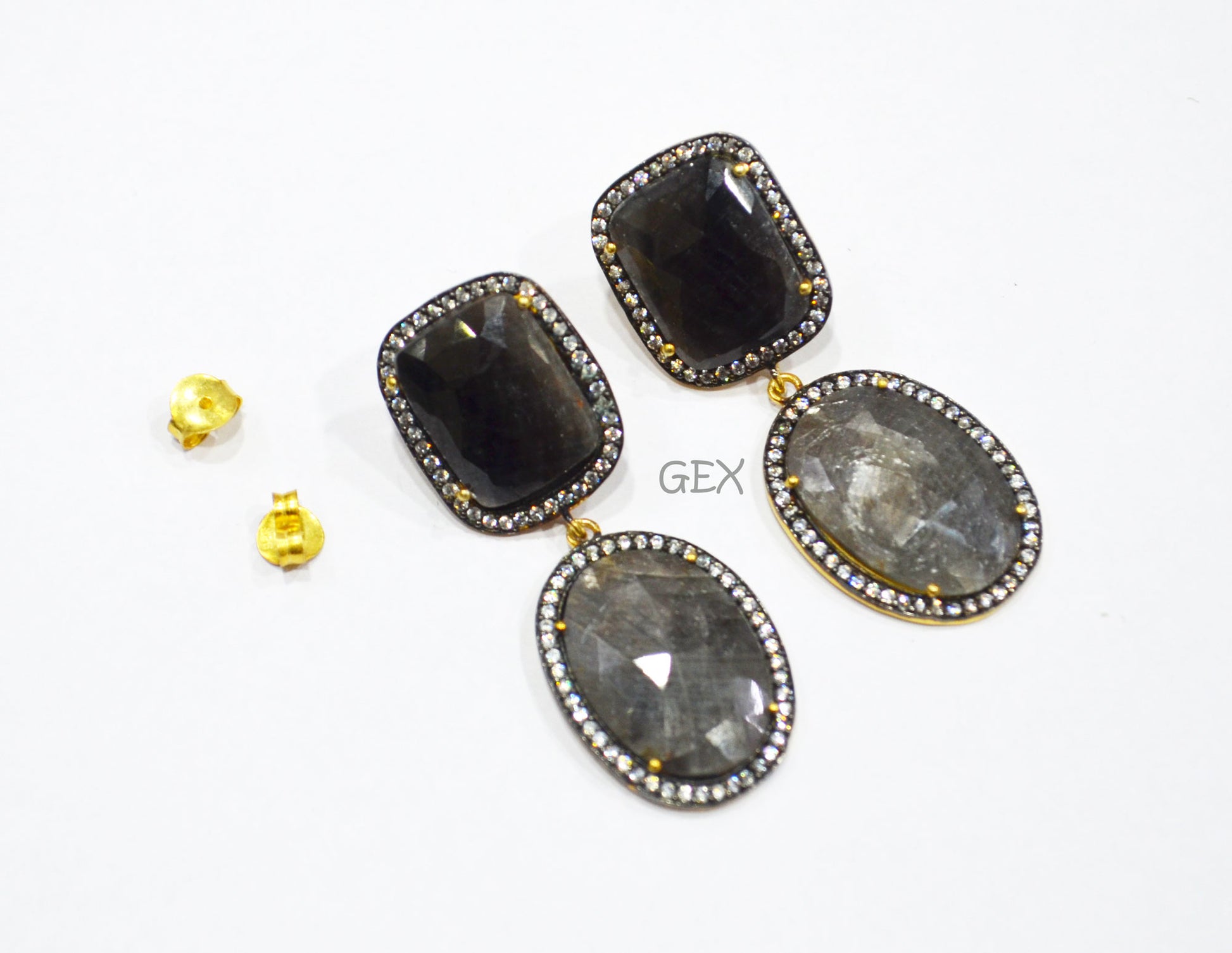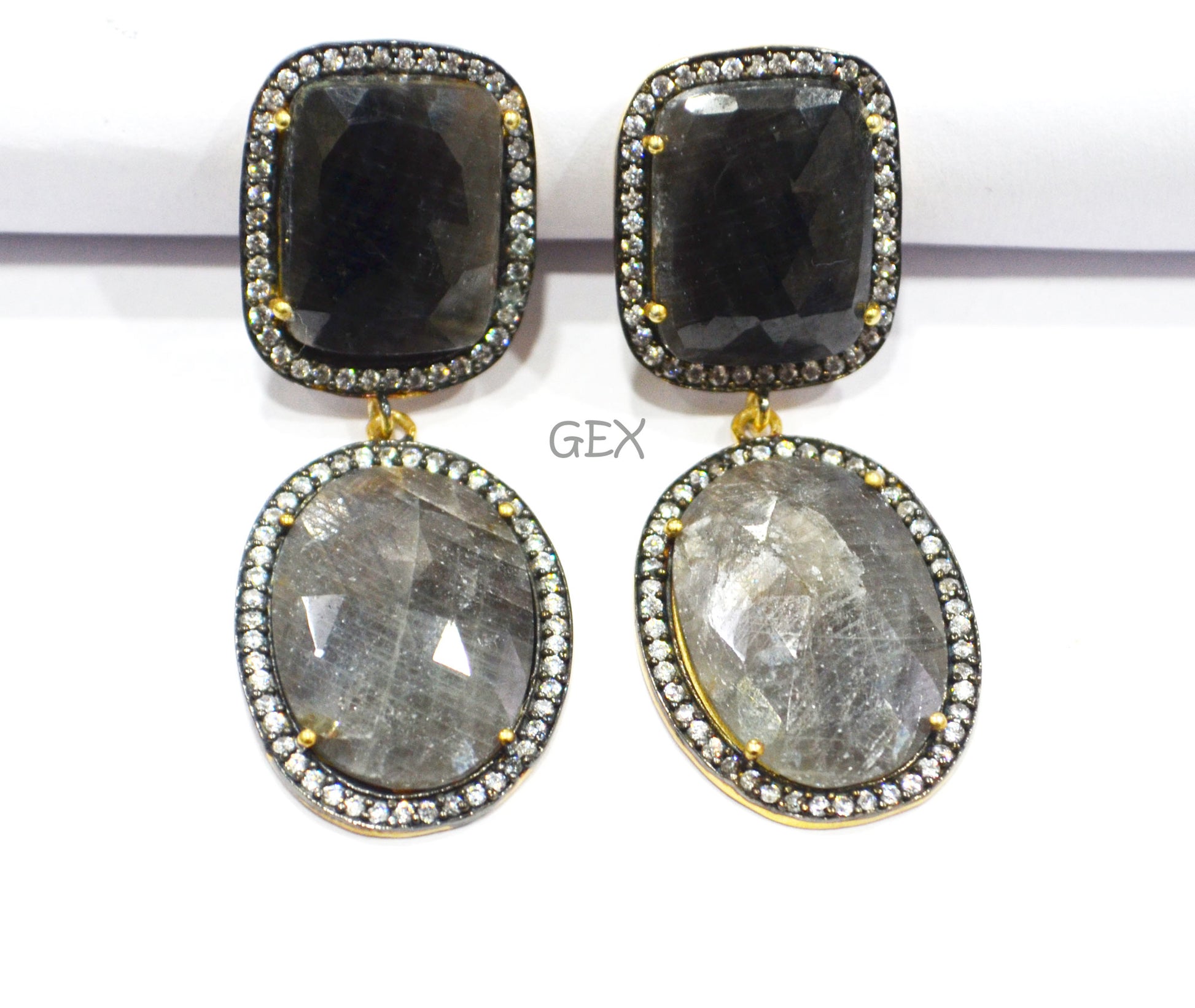 92.5 Sterling Silver Black Sapphire Faceted Fancy Shape Earring , Shiny Black Sapphire With Pave Cubic Zirconia Earring , 55 mm , E-049