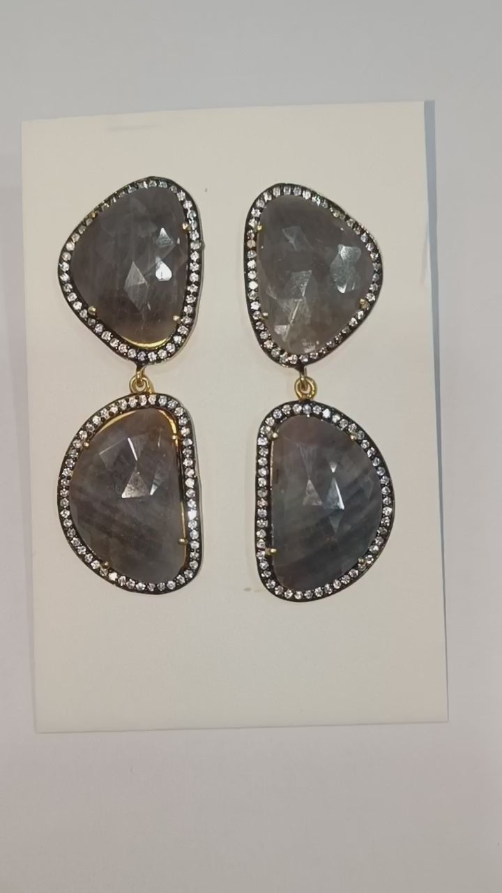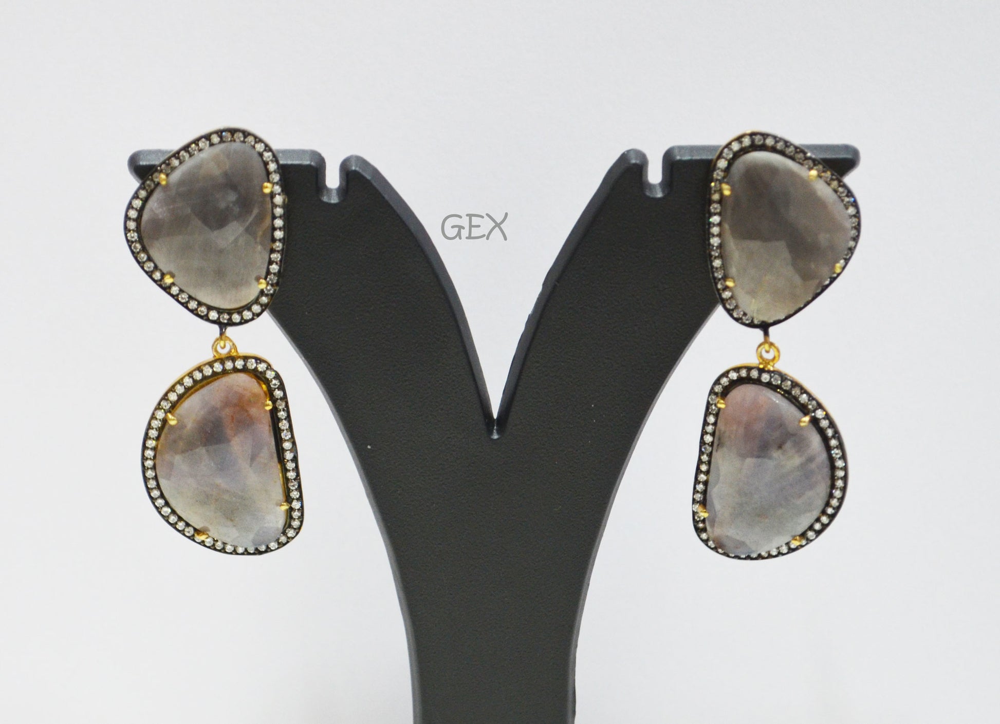 92.5 Sterling Silver Gray Sapphire Faceted Fancy Shape Earring , Gray Sapphire With Pave Cubic Zirconia Earring , 60 mm , E-076