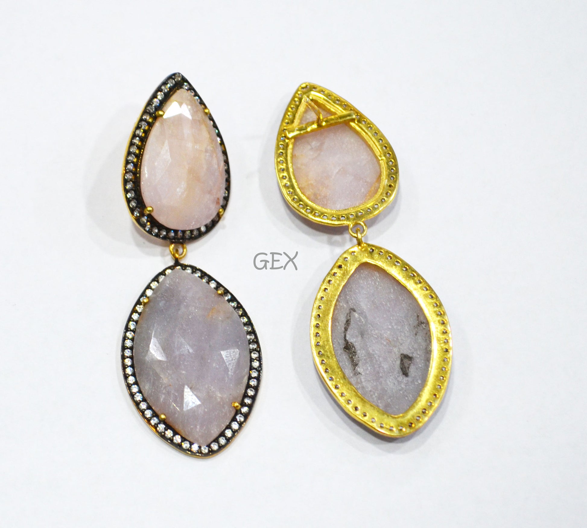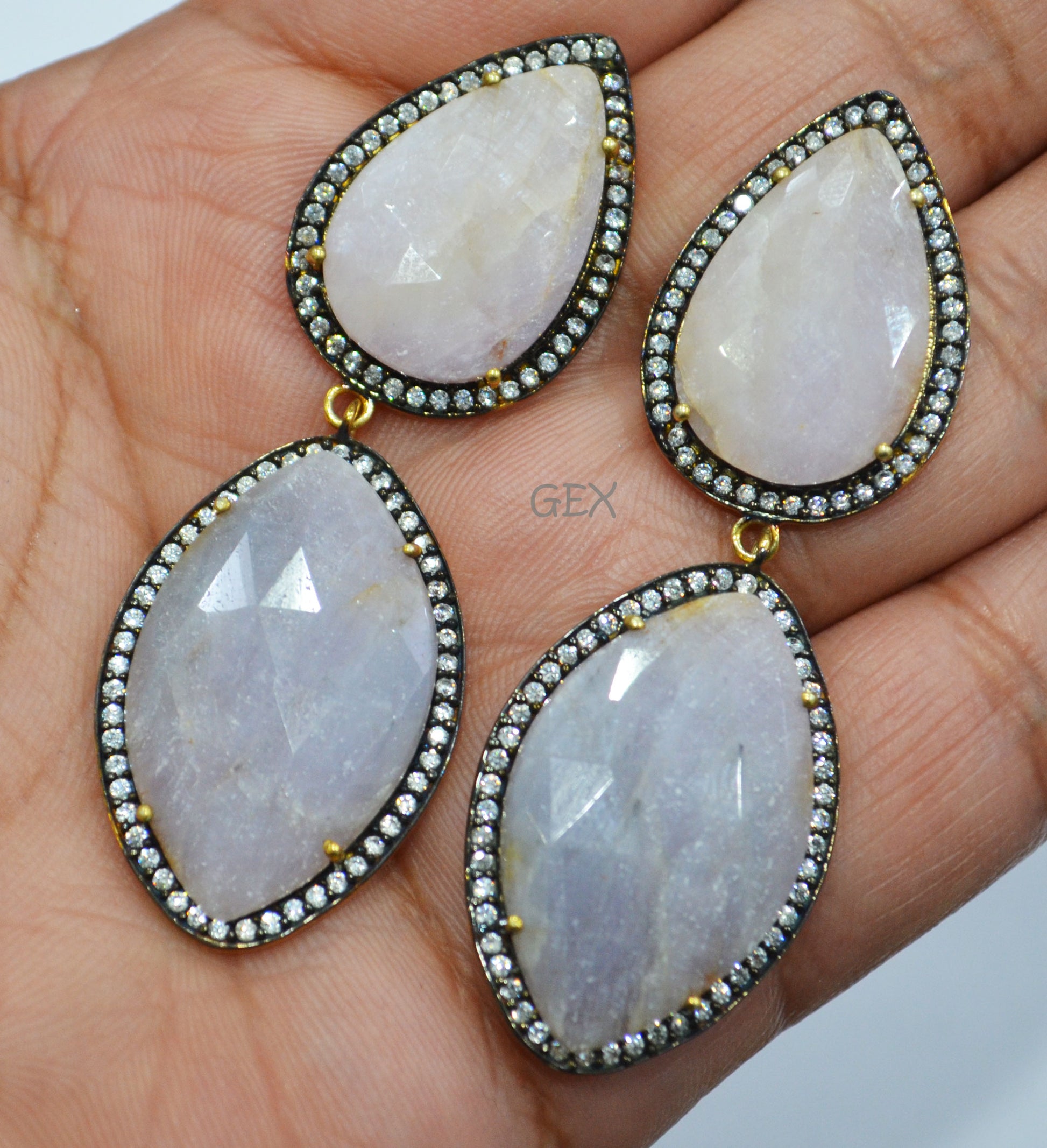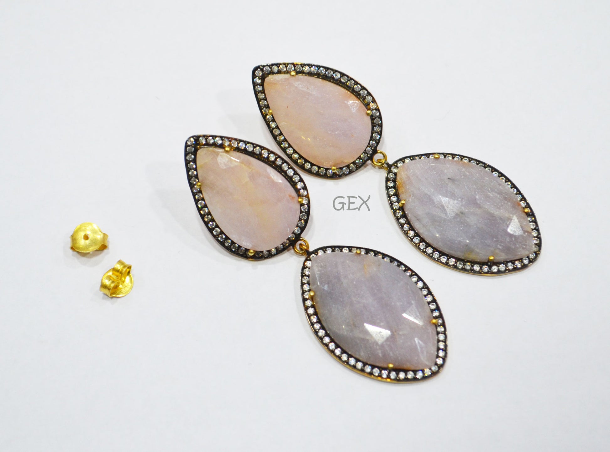 92.5 Sterling Silver Lavender And Baby Pink Sapphire Faceted Fancy Shape Earring , Lavender And Baby Pink Sapphire With Pave Cubic Zirconia Earring , 62 mm , E-066