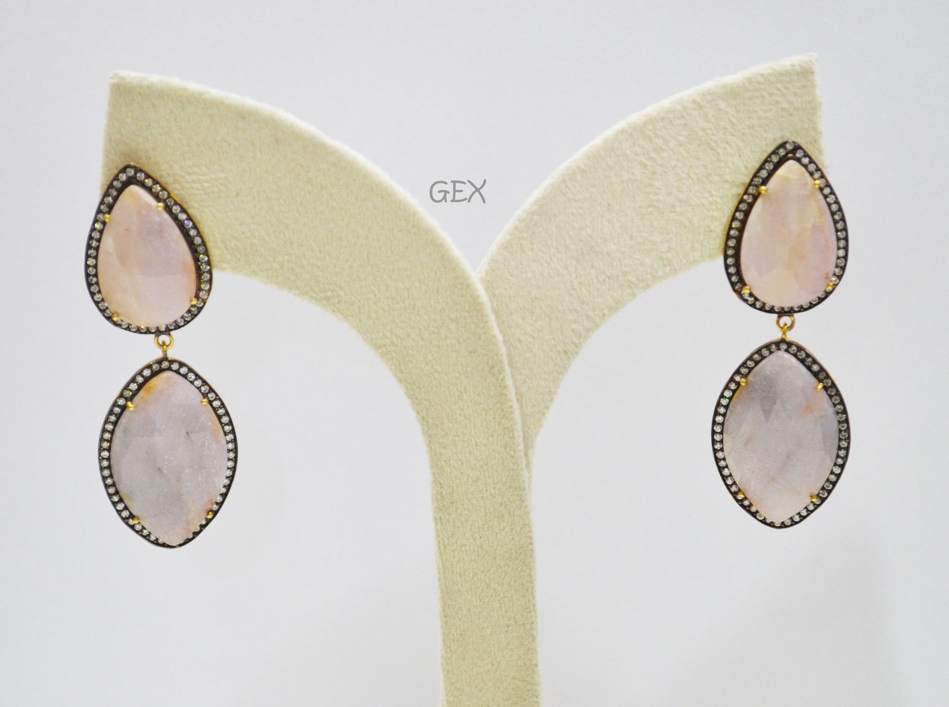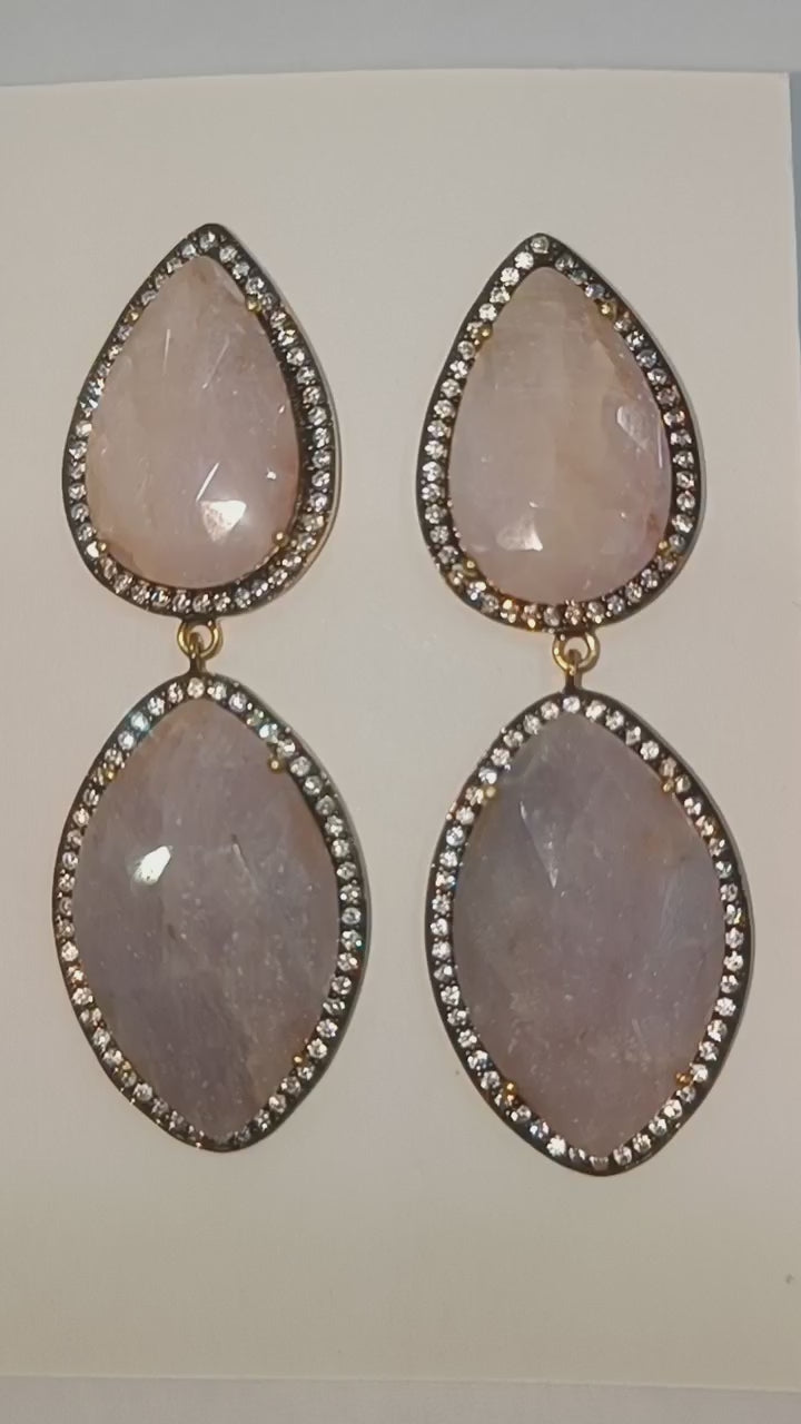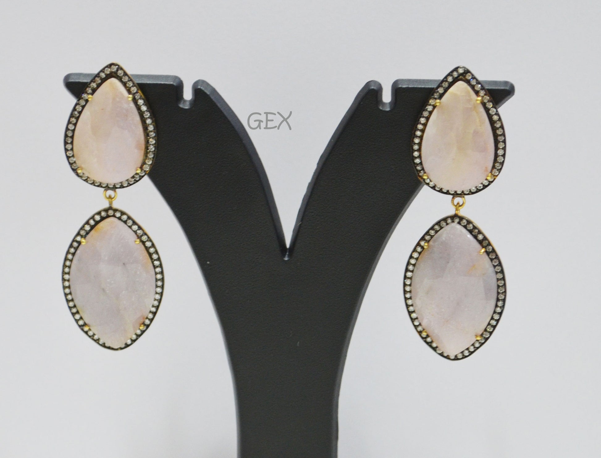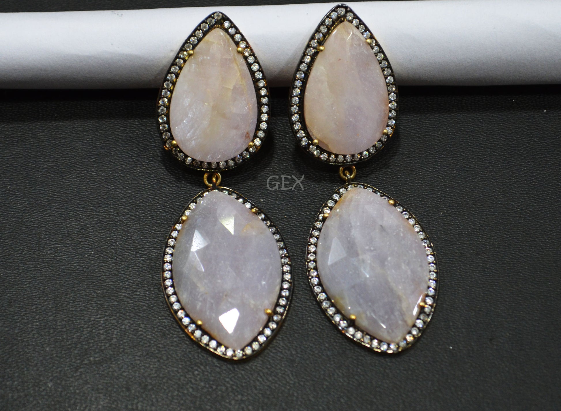 92.5 Sterling Silver Lavender And Baby Pink Sapphire Faceted Fancy Shape Earring , Lavender And Baby Pink Sapphire With Pave Cubic Zirconia Earring , 62 mm , E-066