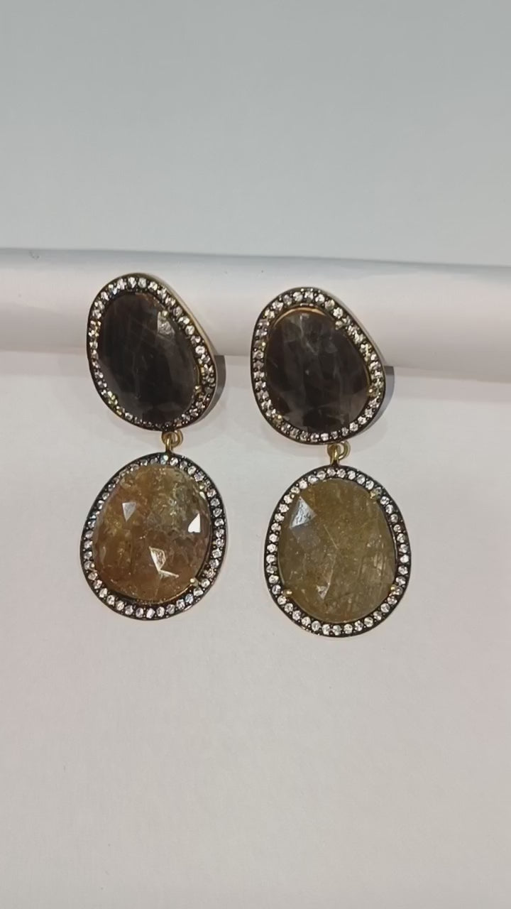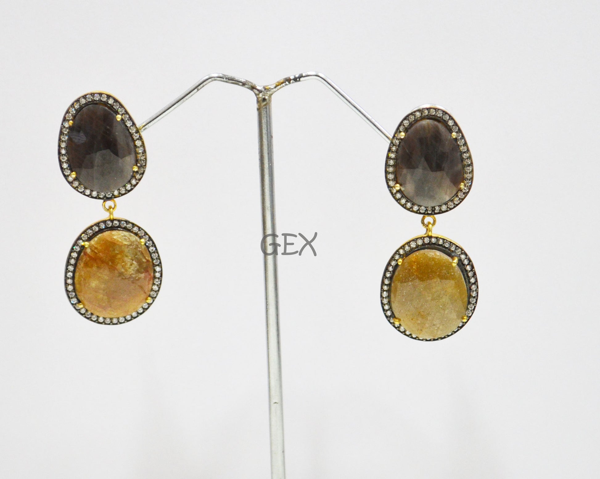 92.5 Sterling Silver Shaded Black And Yellow Sapphire Faceted Fancy Shape Earring , Shaded Black And Yellow Sapphire With Pave Cubic Zirconia Earring , 50 mm , E-002