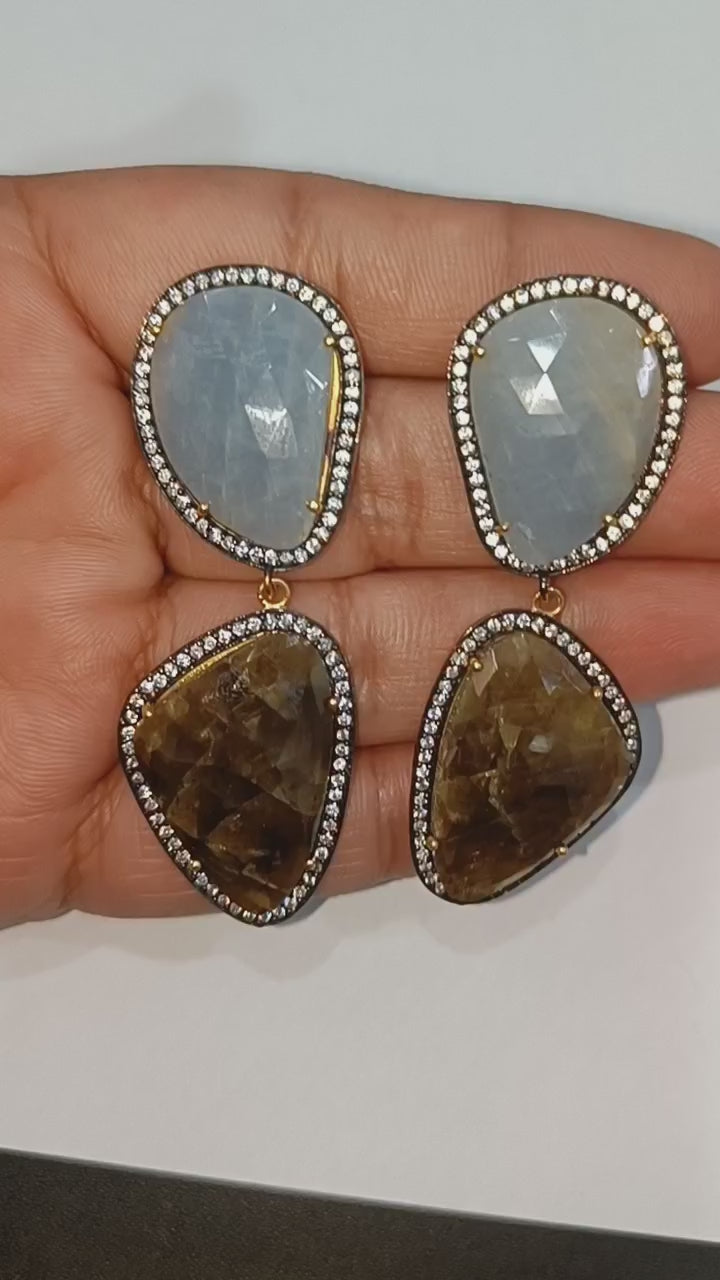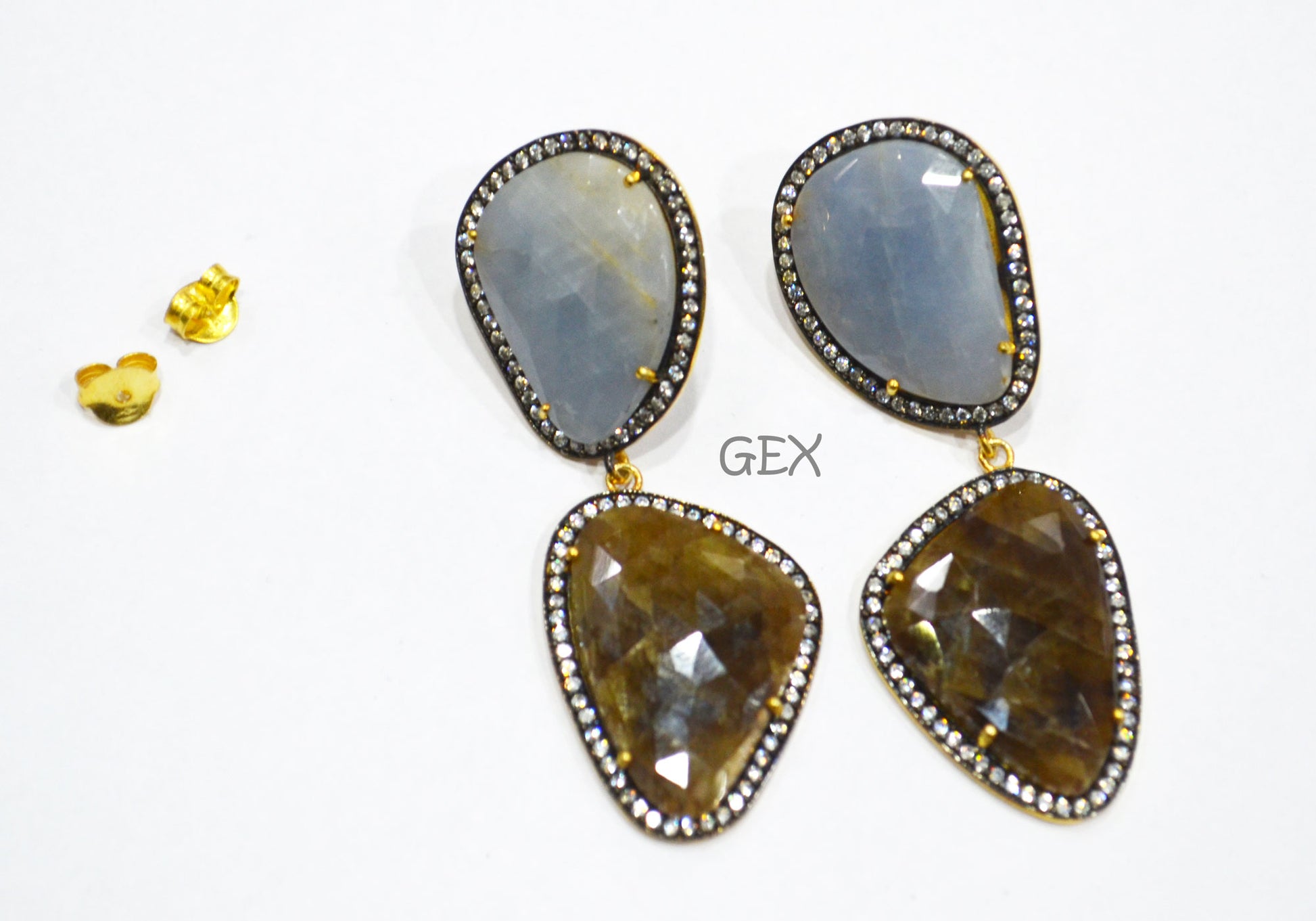 92.5 Sterling Silver Shaded Brown And Blue Sapphire Faceted Fancy Shape Earring , Shaded Brown And Blue Sapphire With Pave Cubic Zirconia Earring , 63 mm , E-003