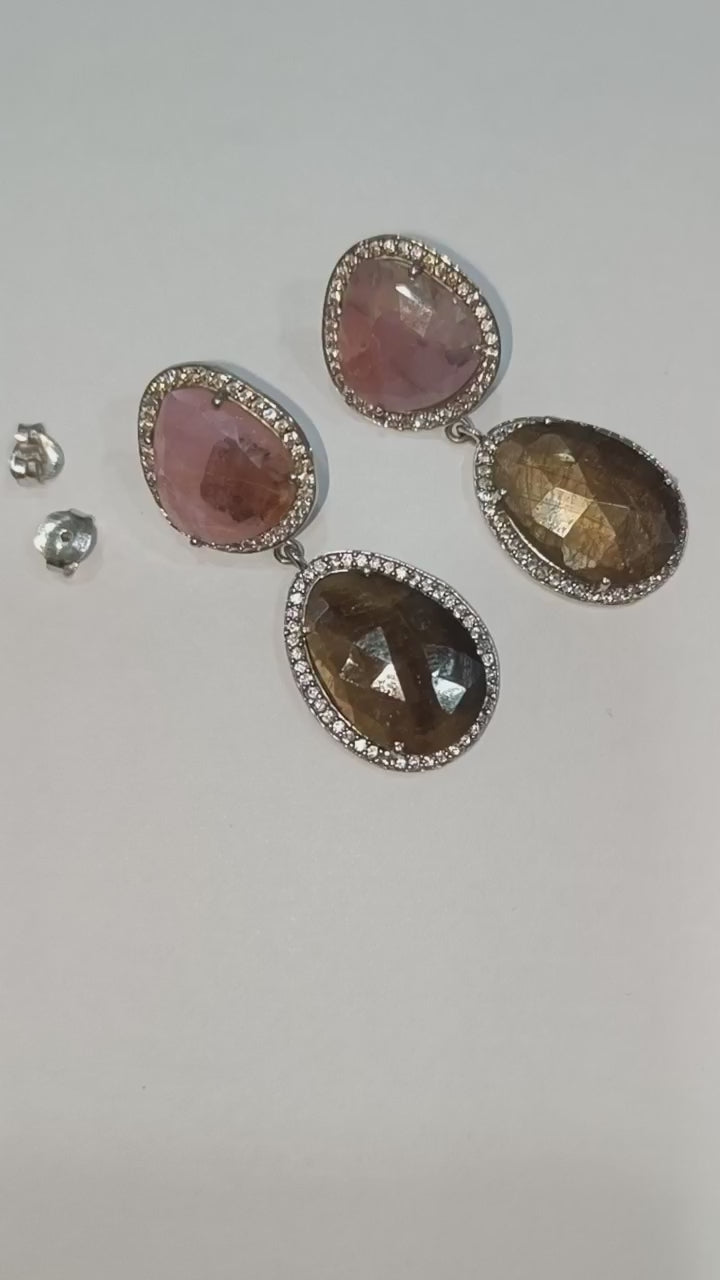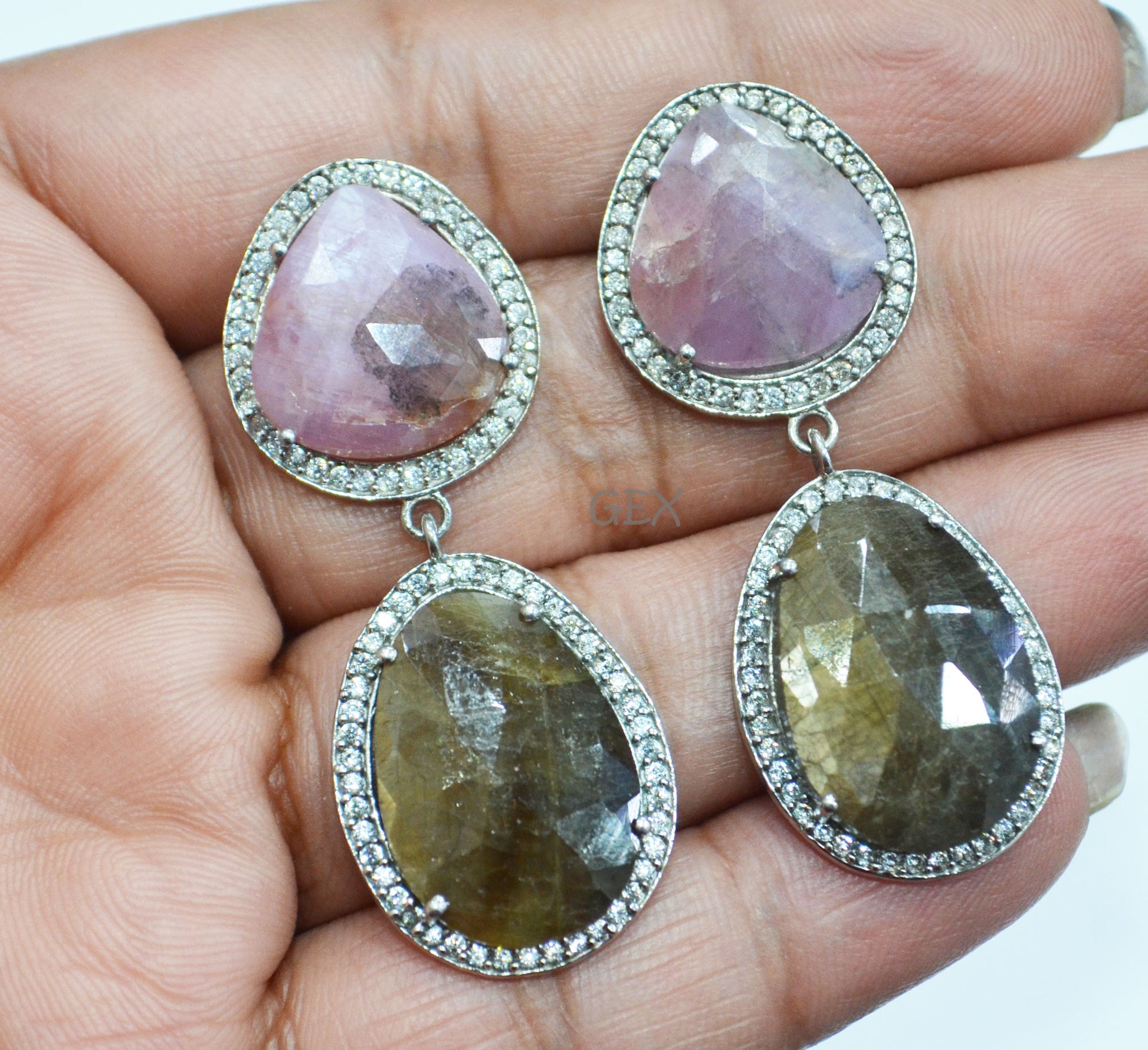 92.5 Sterling Silver Pink And Brown Sapphire Faceted Fancy Shape Earring , Pink And Brown Sapphire With Pave Cubic Zirconia Earring , 48 mm , E-080