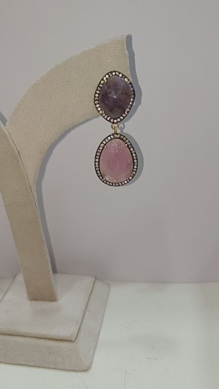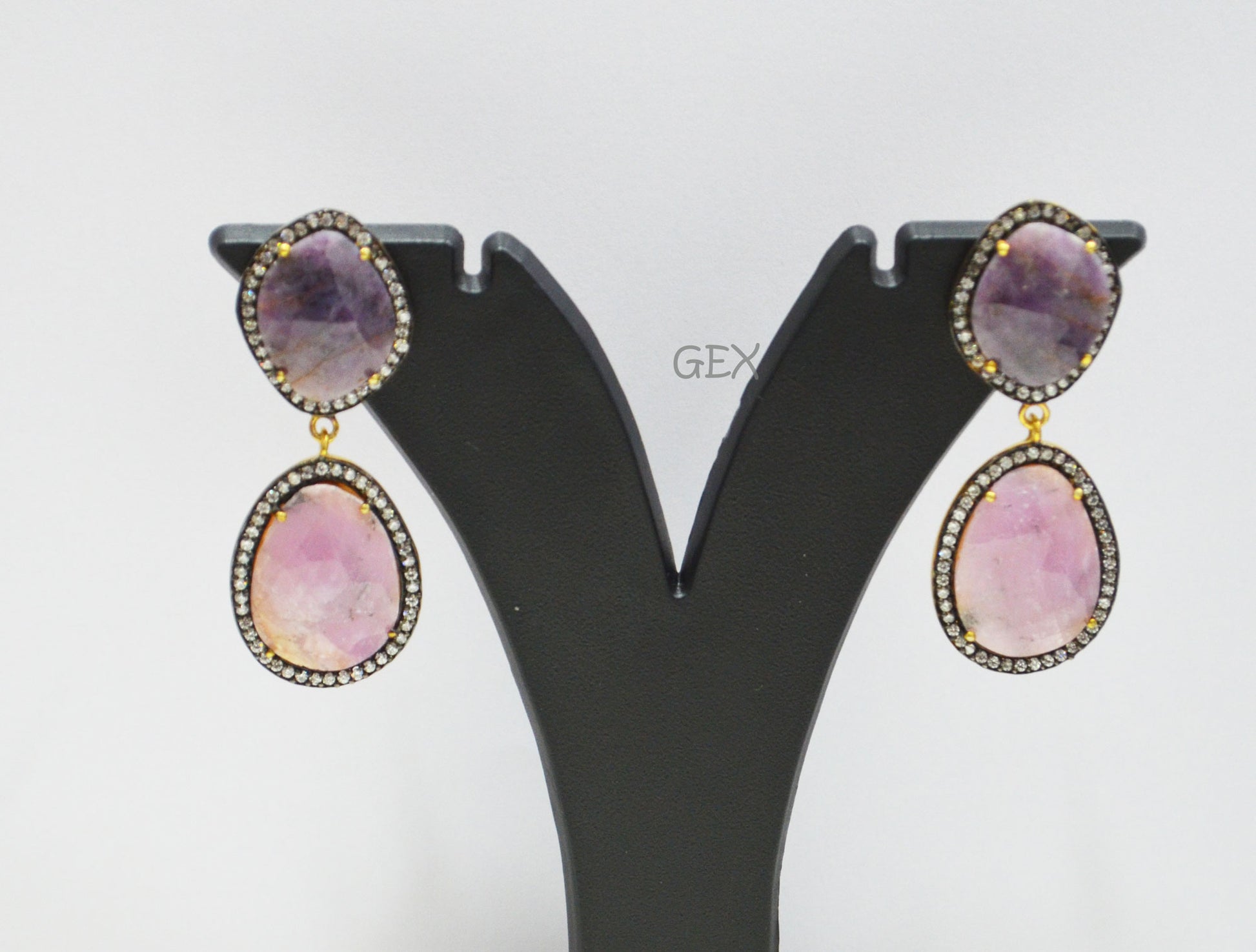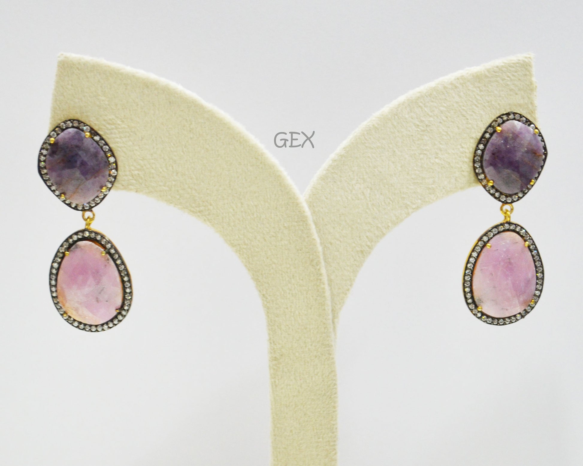92.5 Sterling Silver Pink And Purple Sapphire Faceted Fancy Shape Earring , Pink And Purple Sapphire With Pave Cubic Zirconia Earring , 48 mm , E-072
