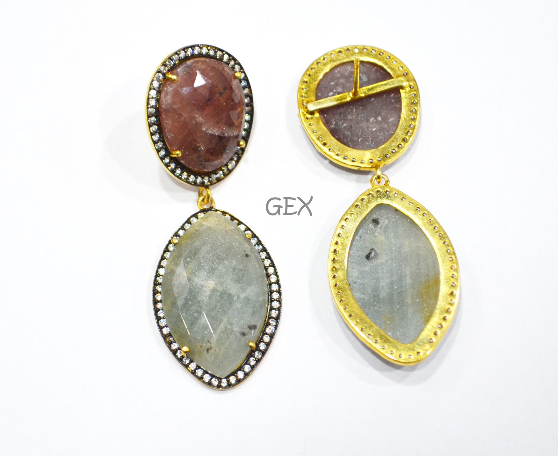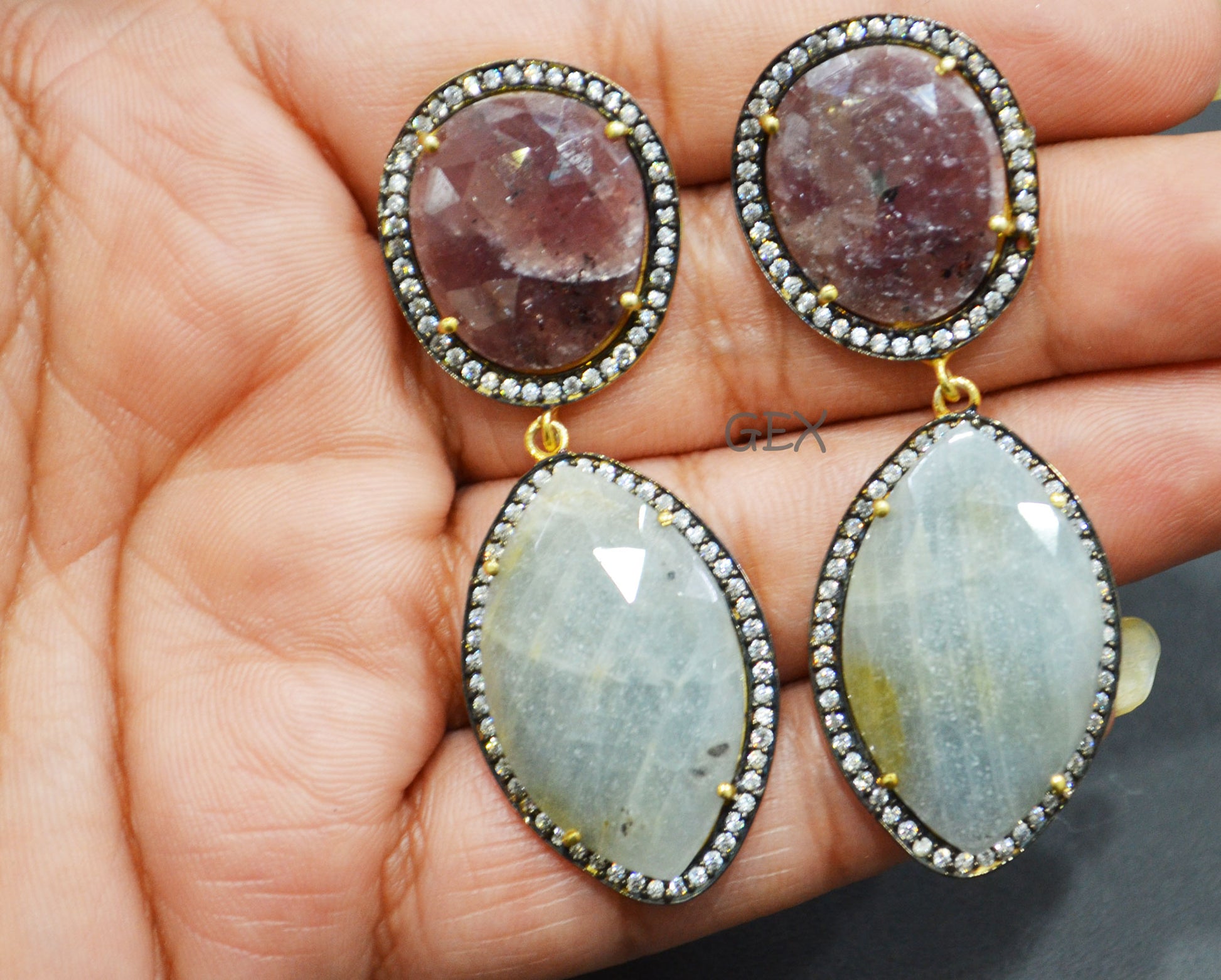 92.5 Sterling Silver Ruby And Aqua Blue Sapphire Faceted Fancy Shape Earring , Ruby And Aqua Blue Sapphire With Pave Cubic Zirconia Earring , 58 mm , E-023