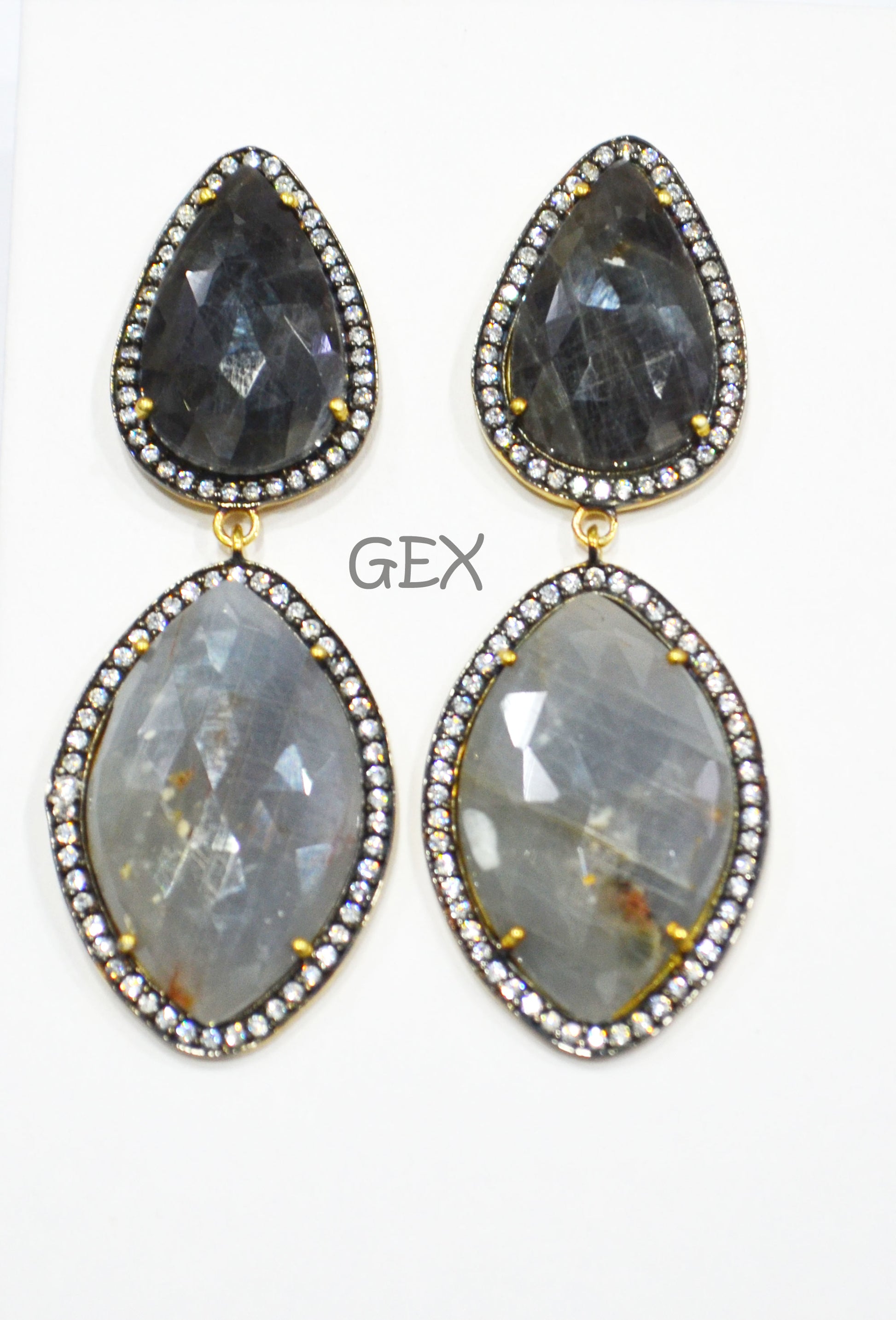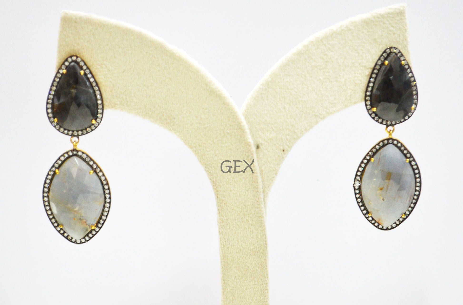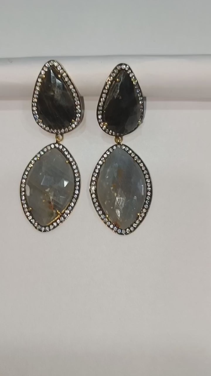 92.5 Sterling Silver Shaded Black And Gray Sapphire Faceted Fancy Shape Earring , Shaded Black And Gray Sapphire With Pave Cubic Zirconia Earring , 59 mm , E-018
