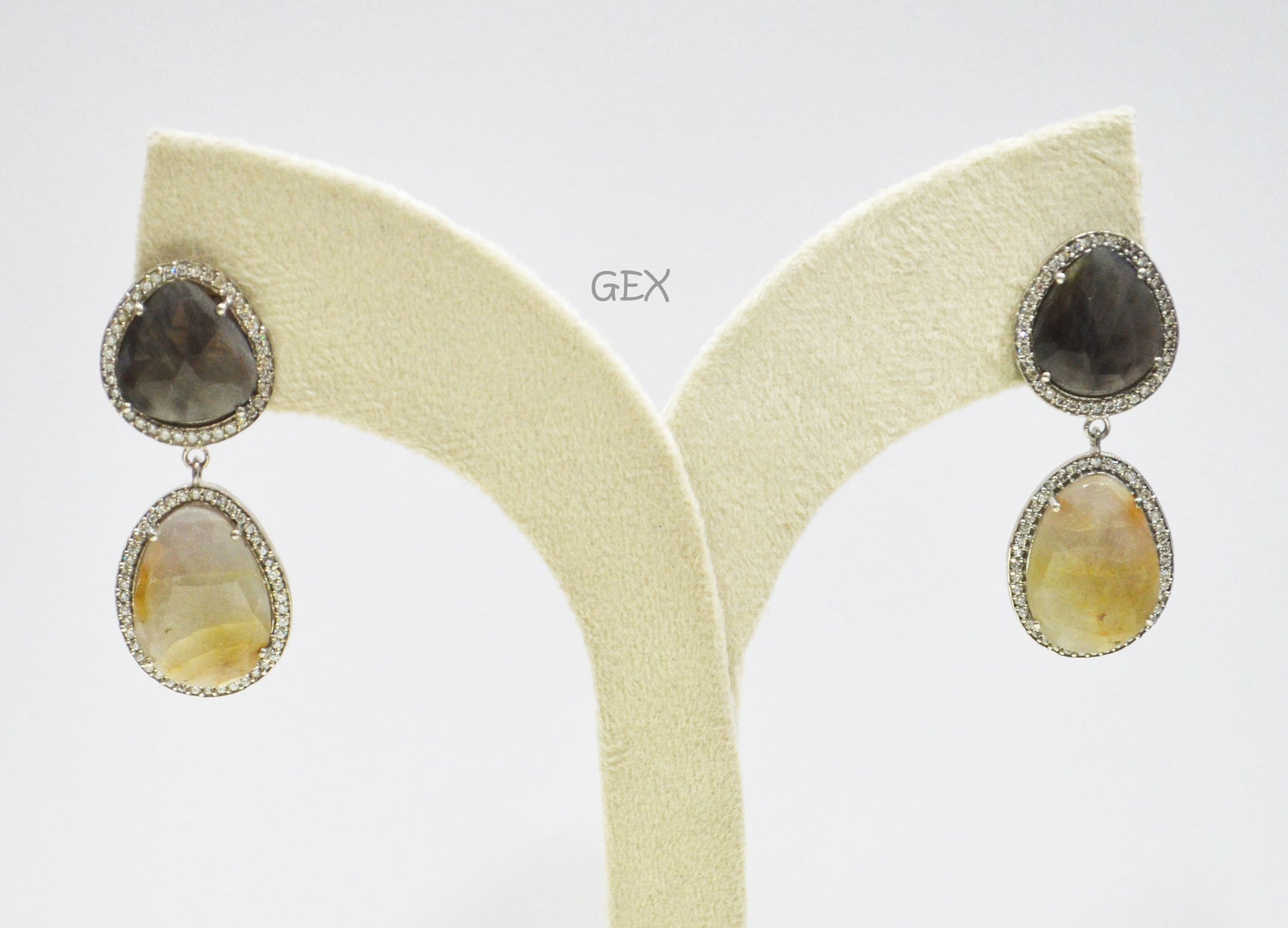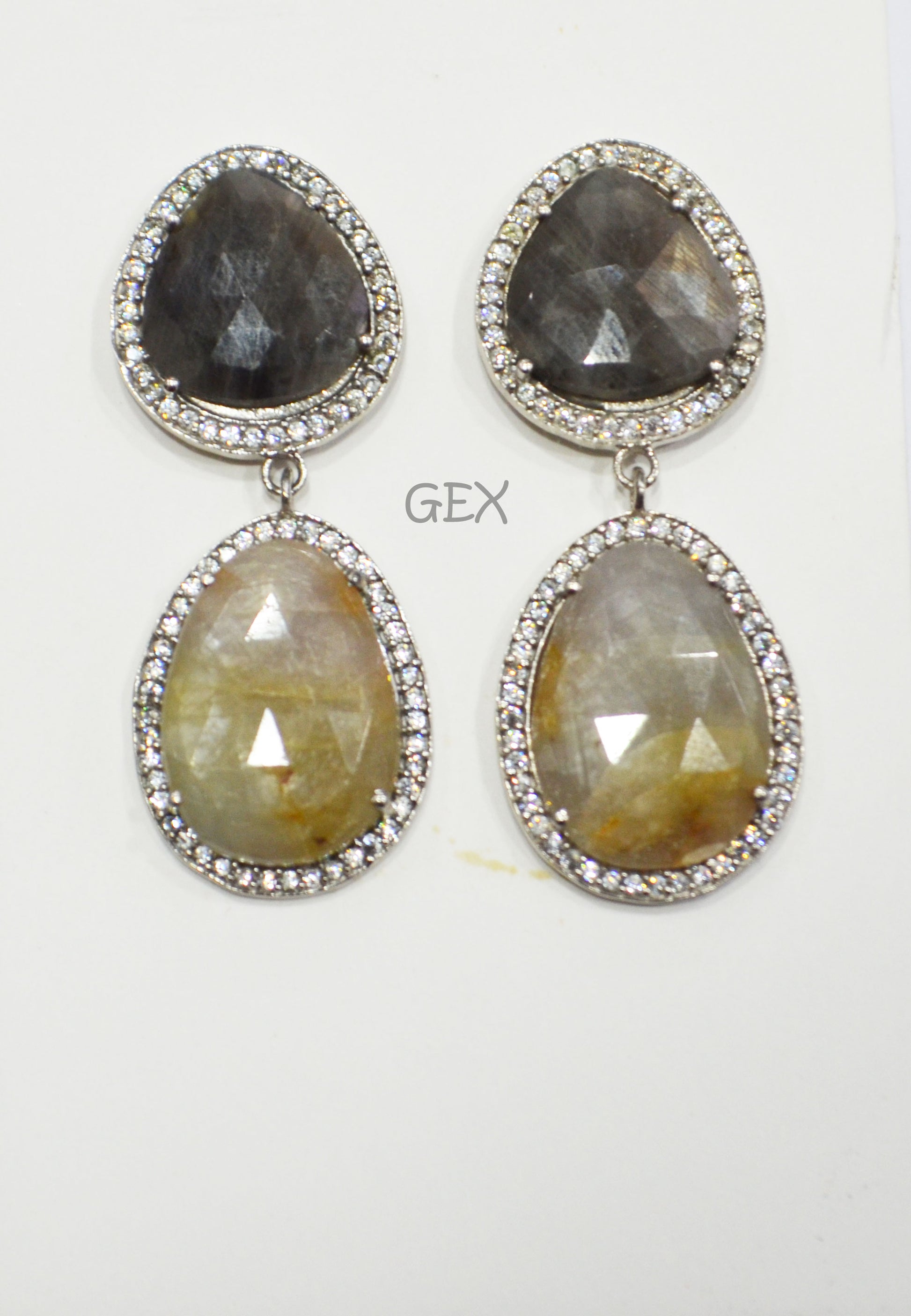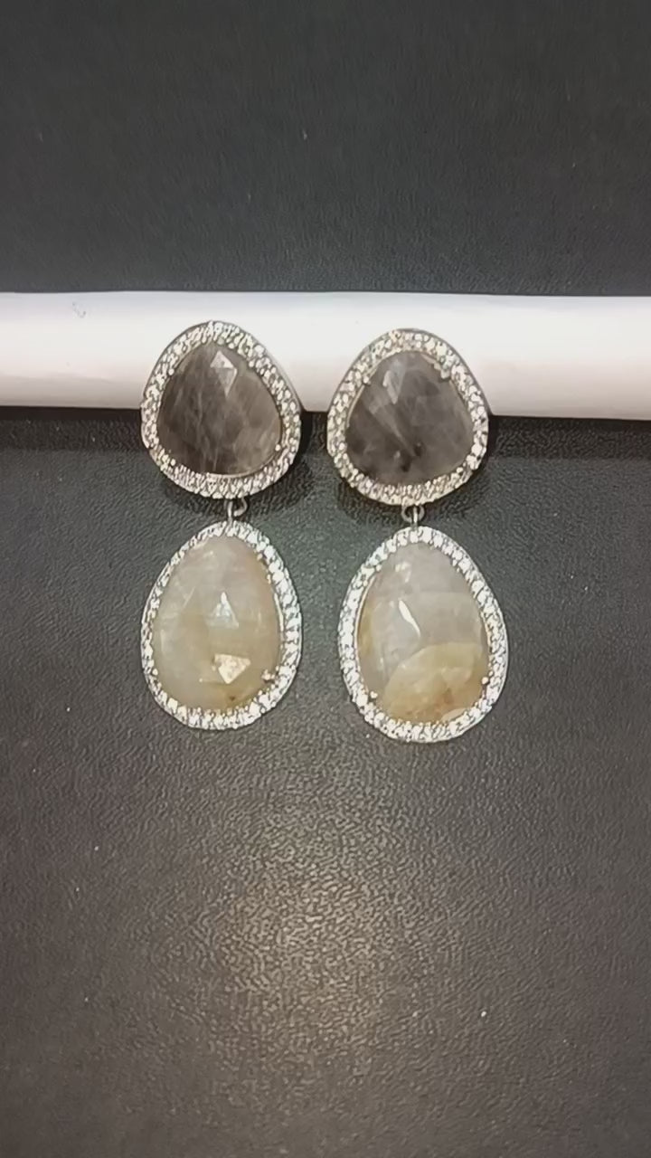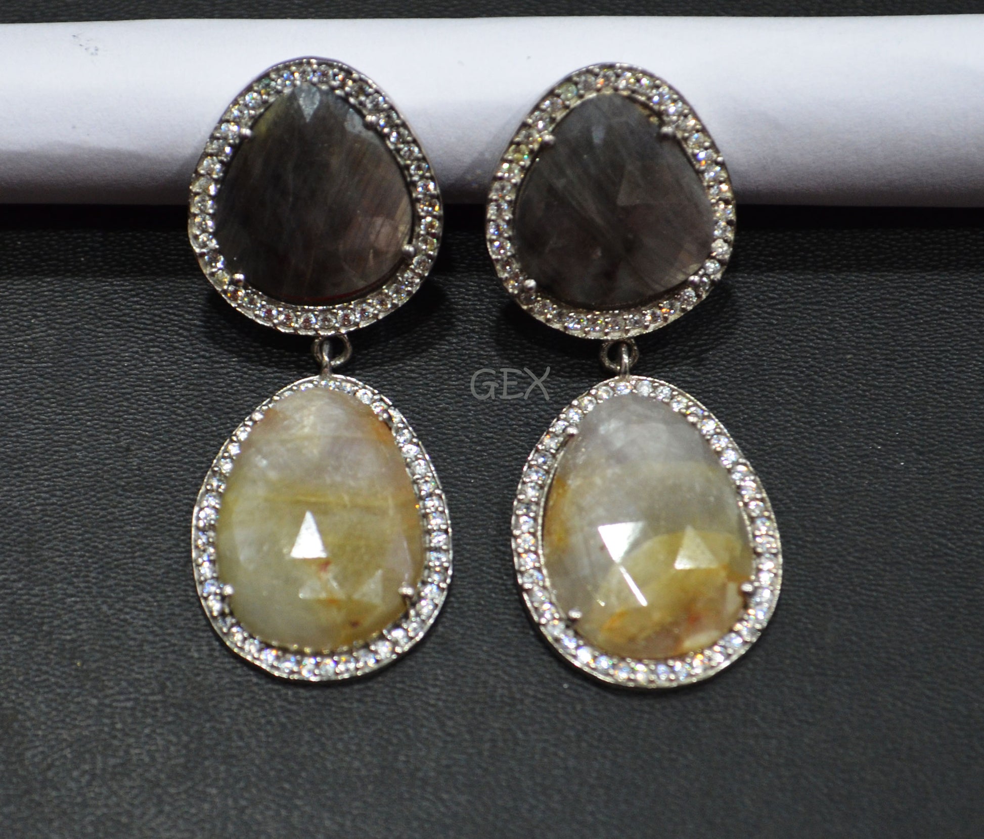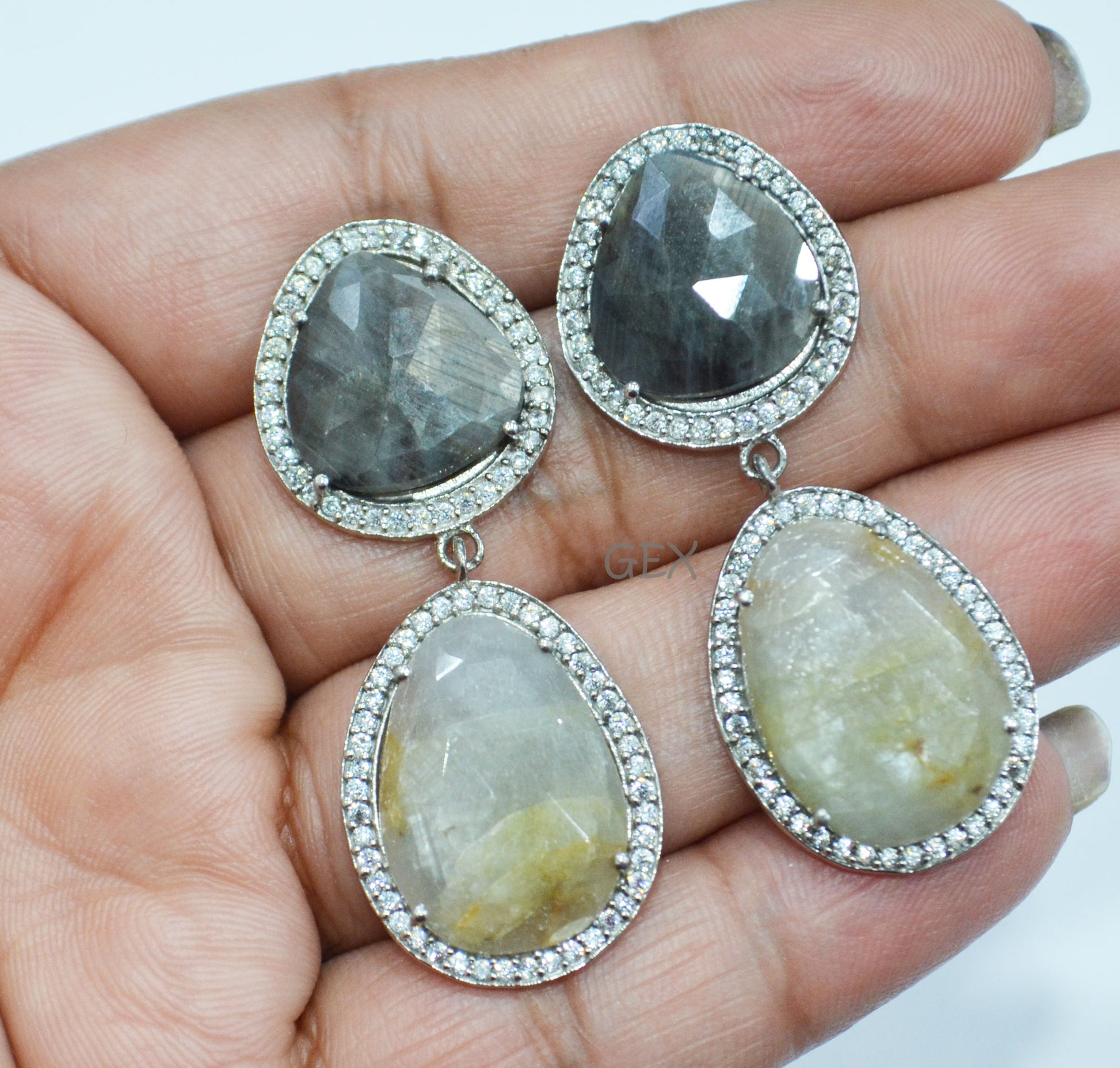 92.5 Sterling Silver Shaded Black And Gray Sapphire Faceted Fancy Shape Earring , Shaded Black And Gray Sapphire With Pave Cubic Zirconia Earring , 50 mm , E-077
