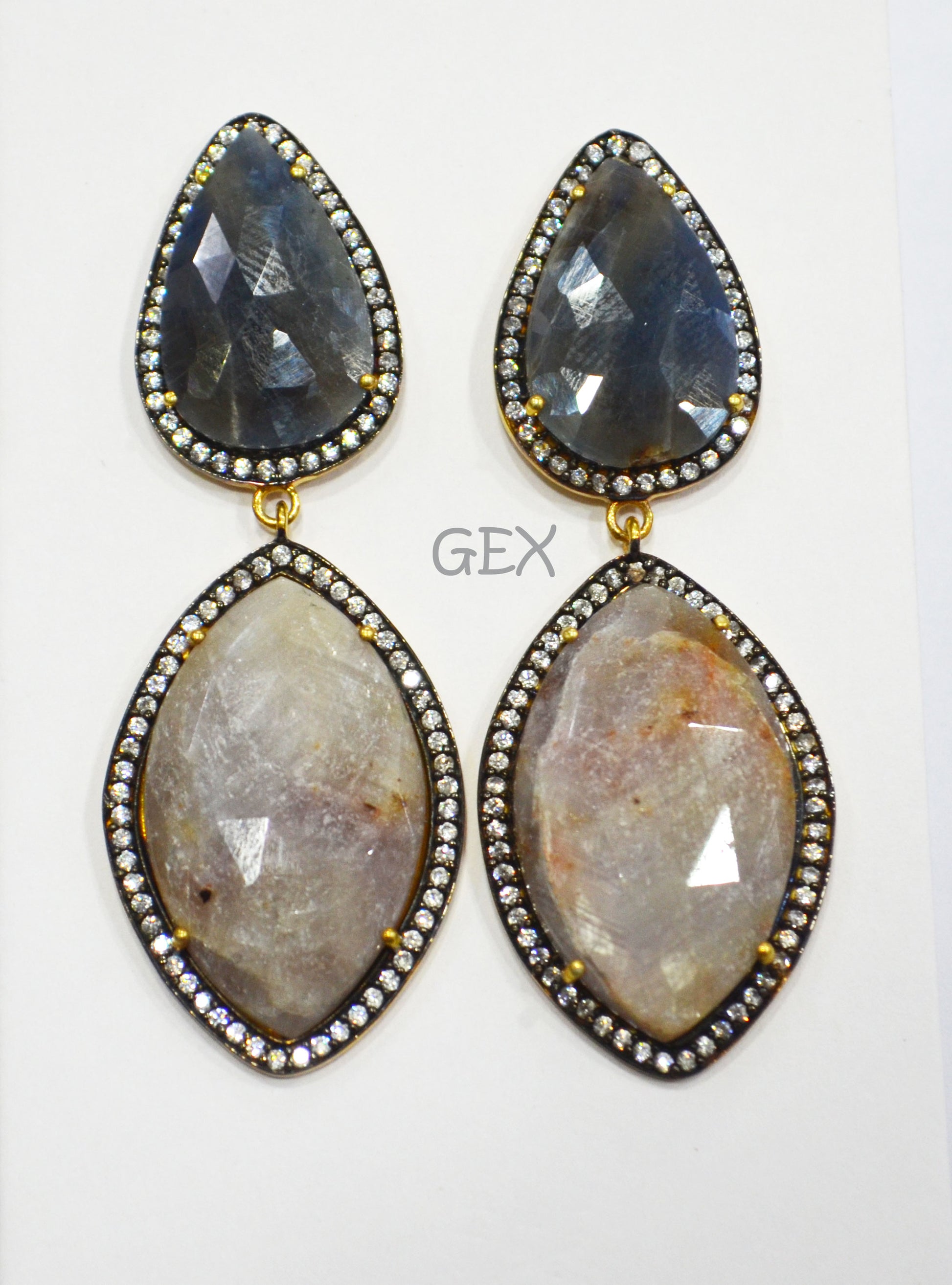 92.5 Sterling Silver Shaded Blue And Gray Sapphire Faceted Fancy Shape Earring , Shaded Blue And Gray Sapphire With Pave Cubic Zirconia Earring , 62 mm , E-032