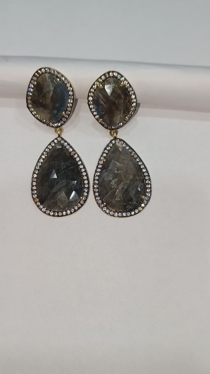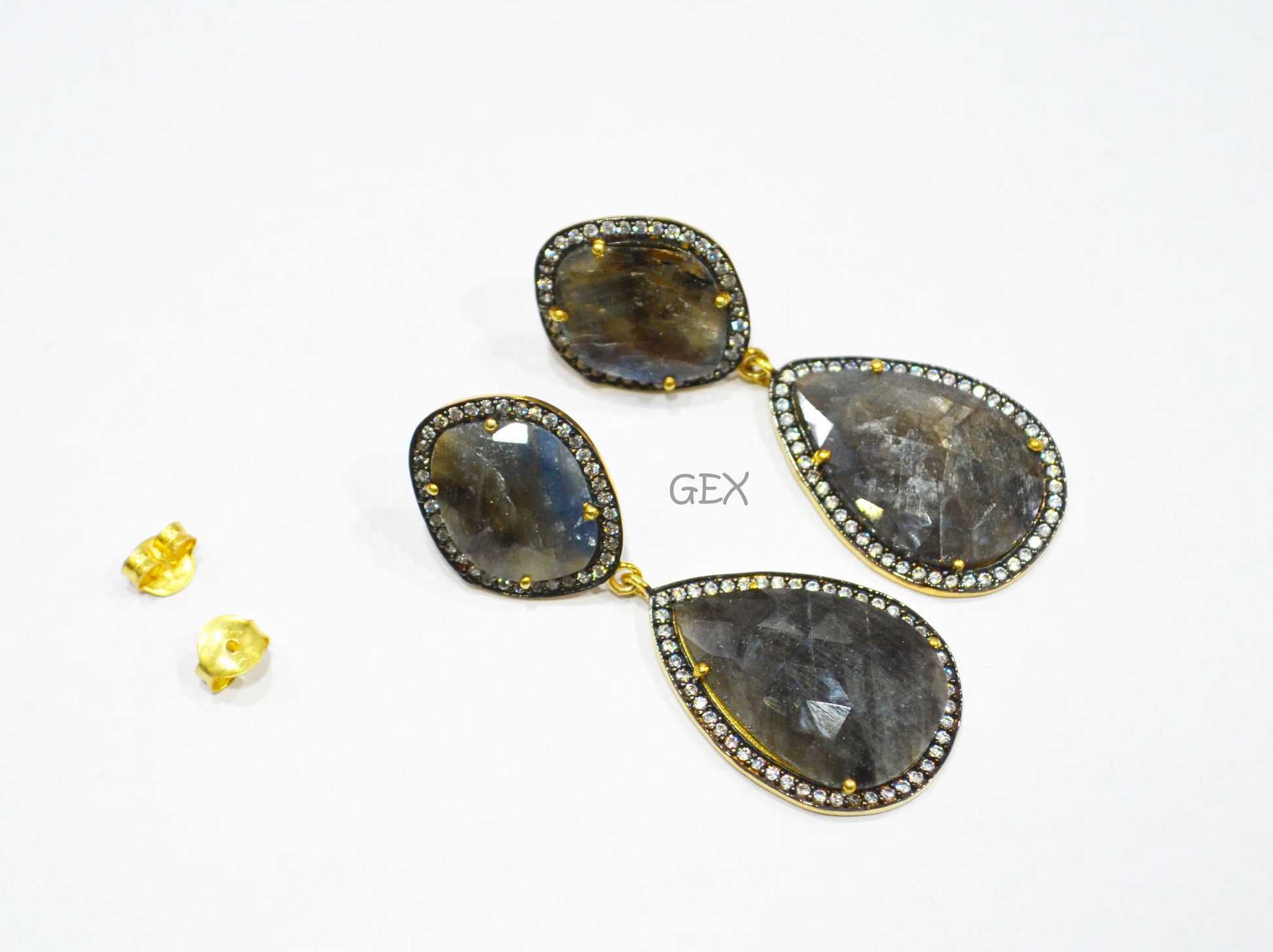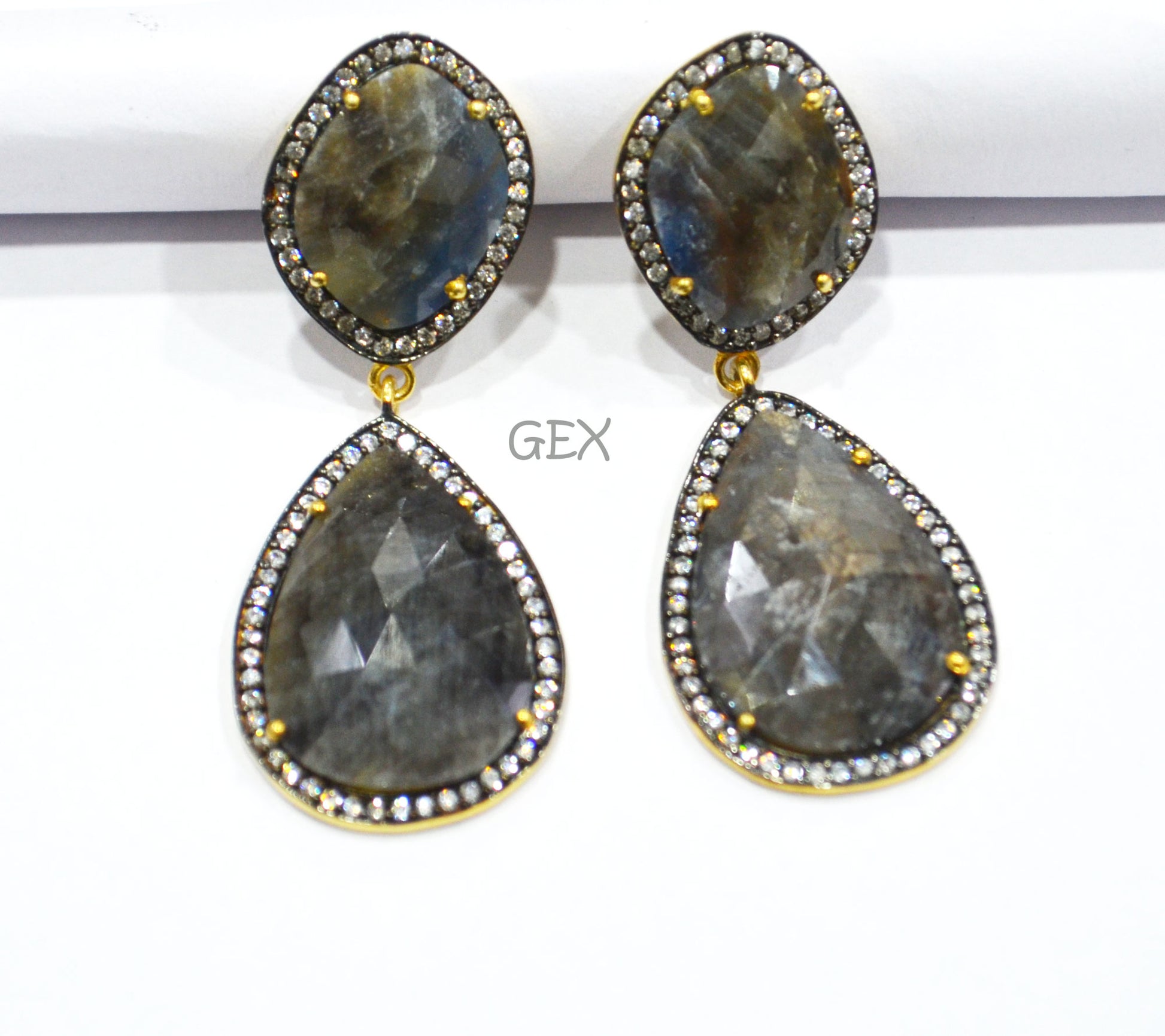 92.5 Sterling Silver Shaded Blue And Black Sapphire Faceted Fancy Shape Earring , Shaded Blue And Black Sapphire With Pave Cubic Zirconia Earring , 55 mm , E-065