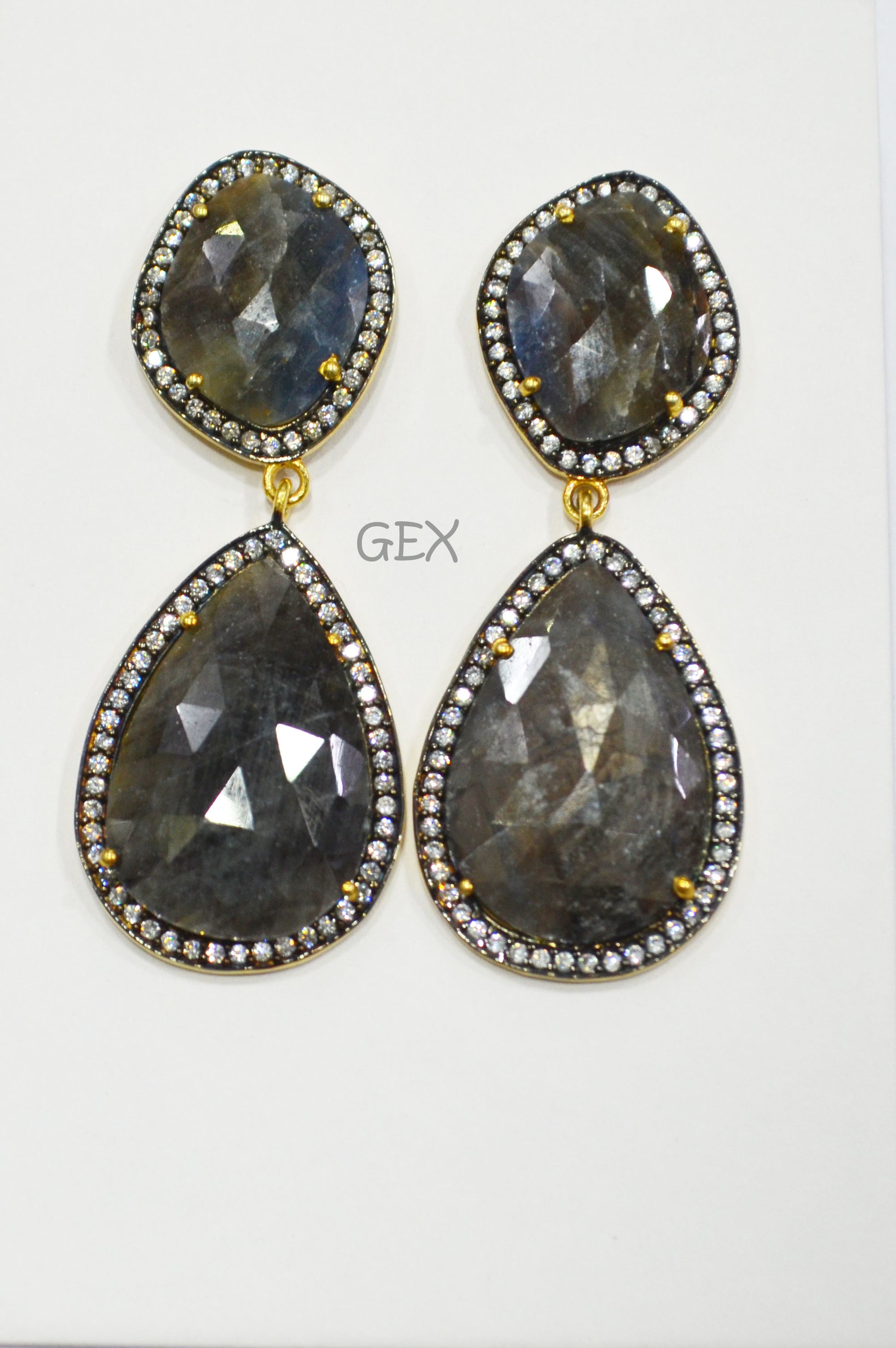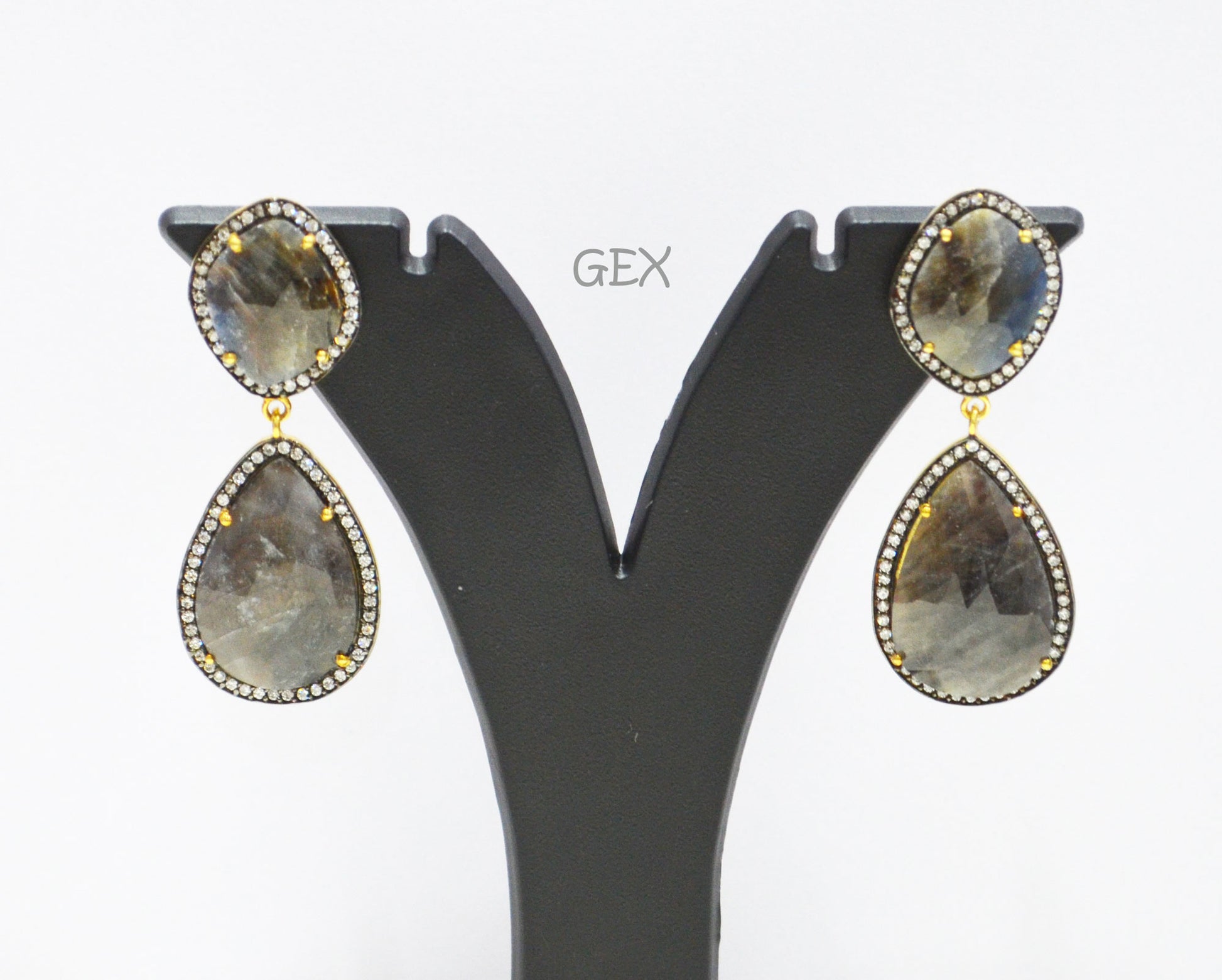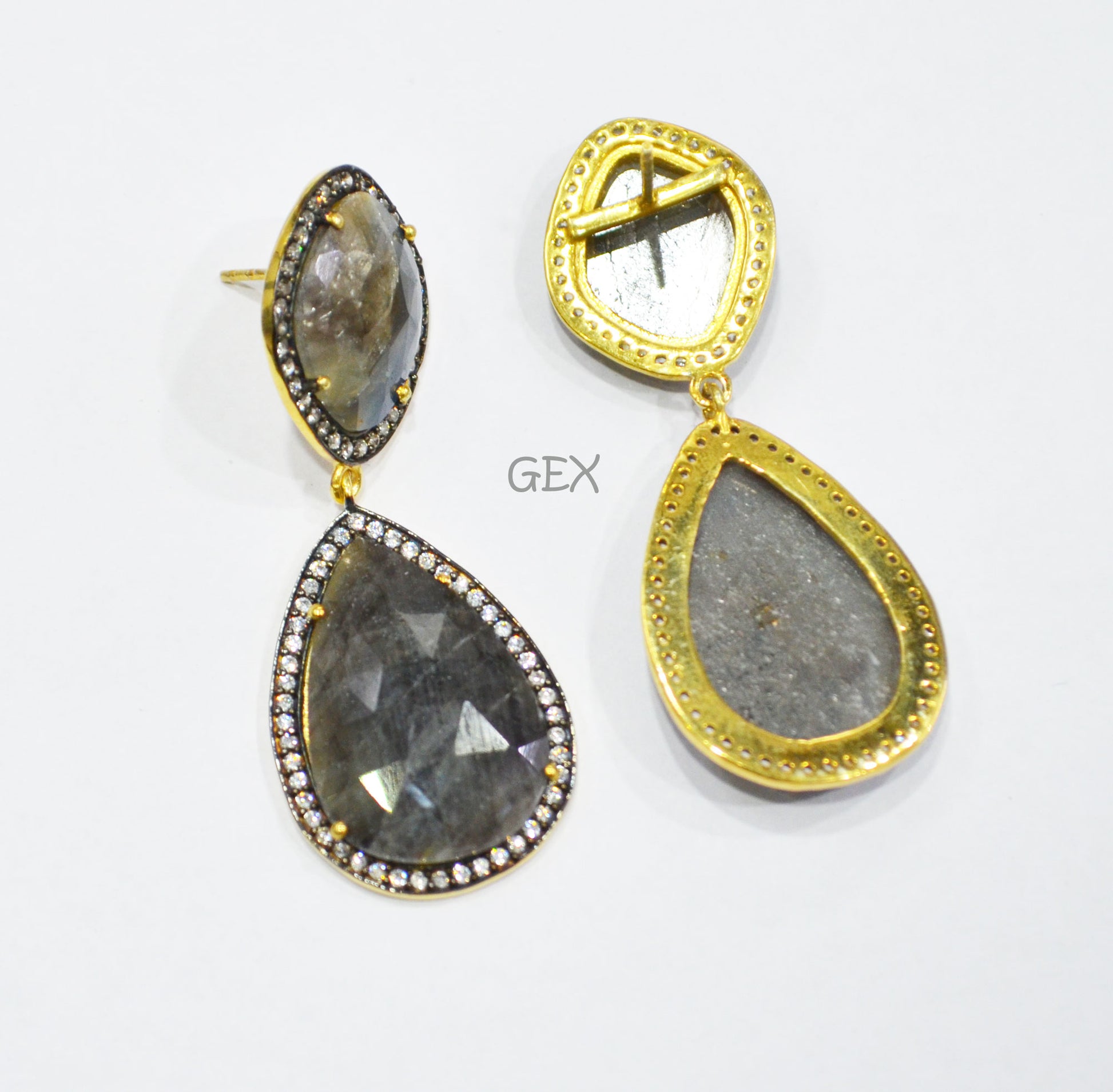 92.5 Sterling Silver Shaded Blue And Black Sapphire Faceted Fancy Shape Earring , Shaded Blue And Black Sapphire With Pave Cubic Zirconia Earring , 55 mm , E-065