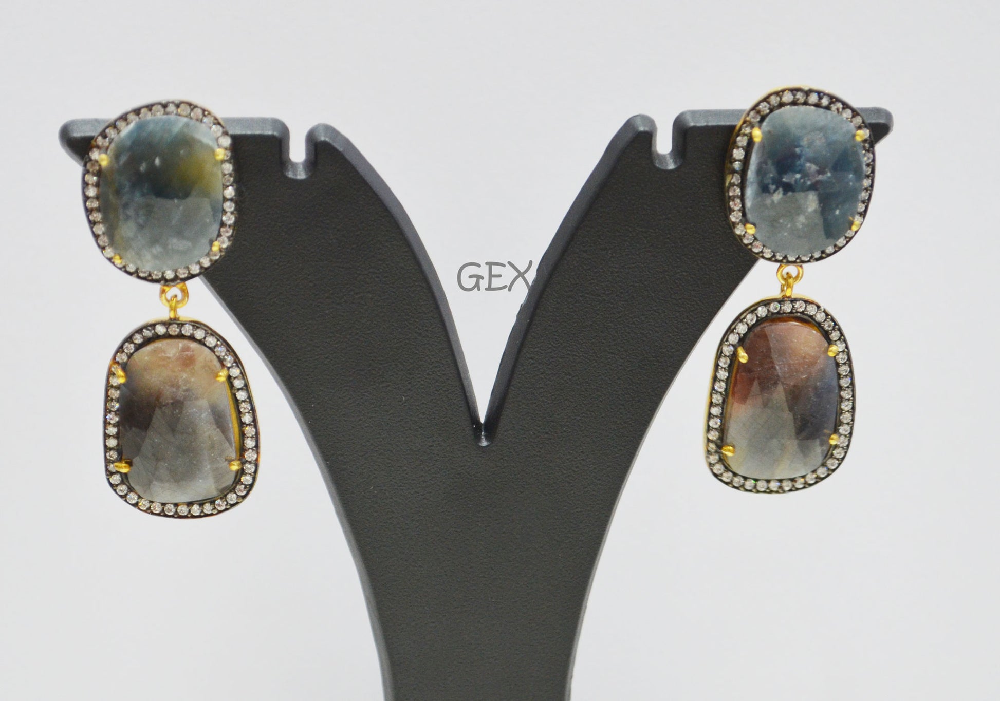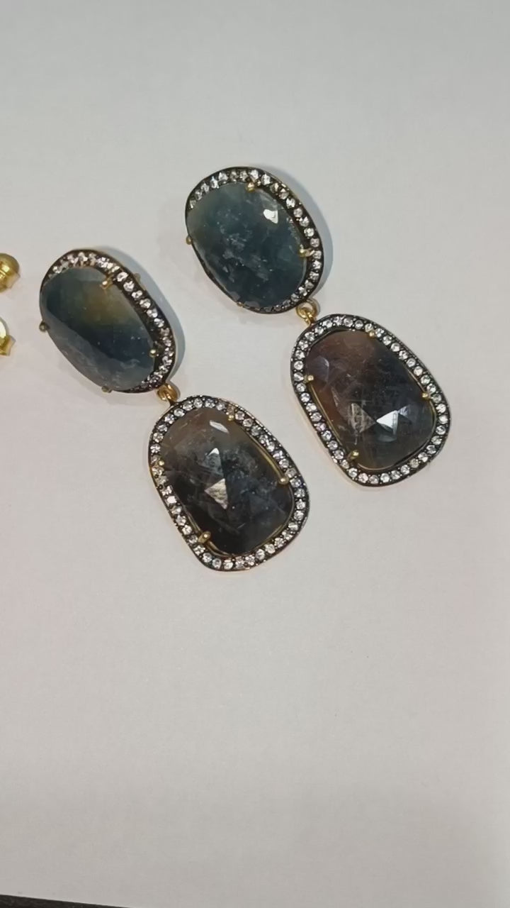 92.5 Sterling Silver Shaded Blue And Brown Sapphire Faceted Fancy Shape Earring , Shaded Blue And Brown Sapphire With Pave Cubic Zirconia Earring , 48 mm , E-026