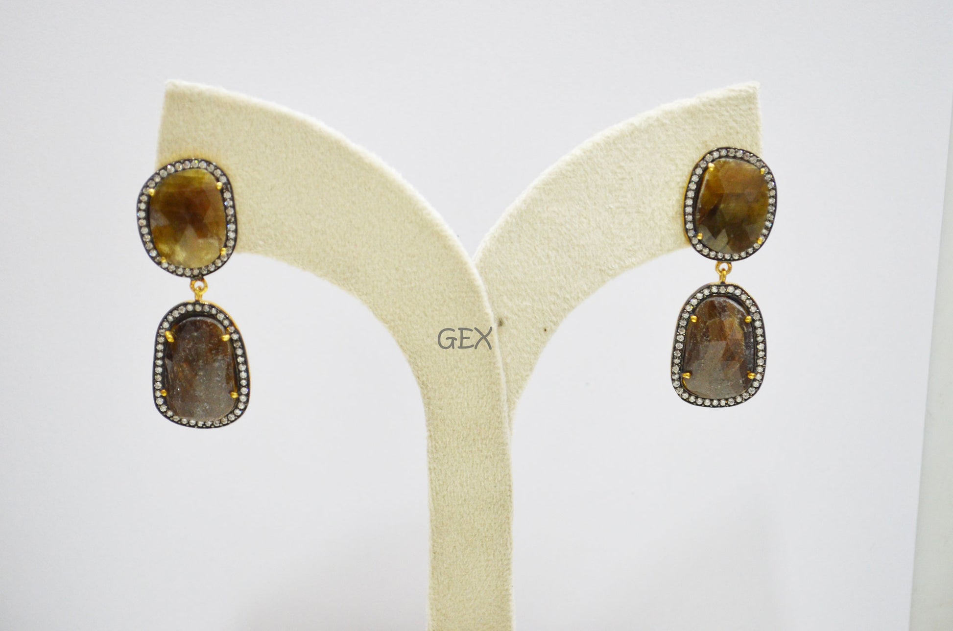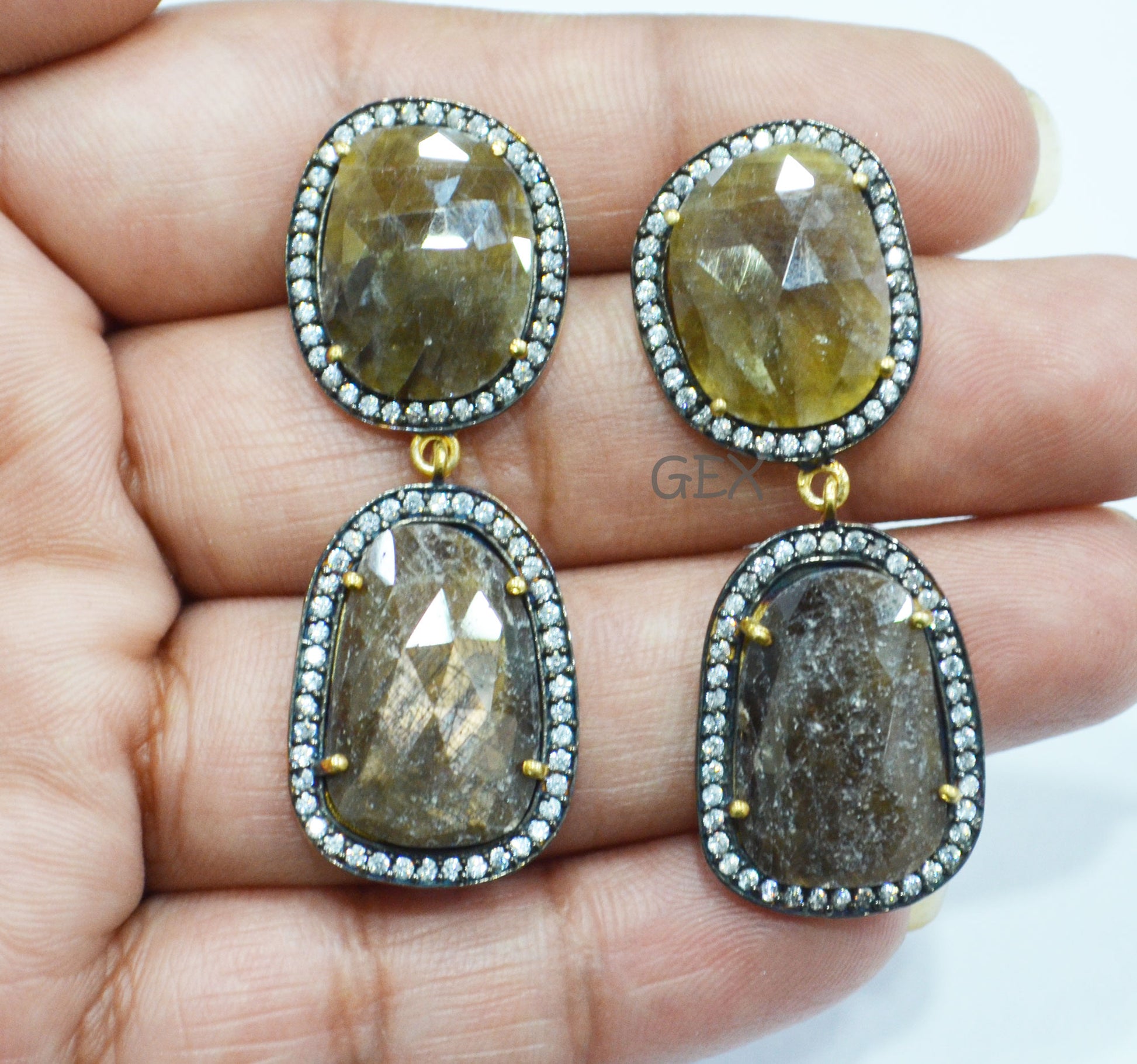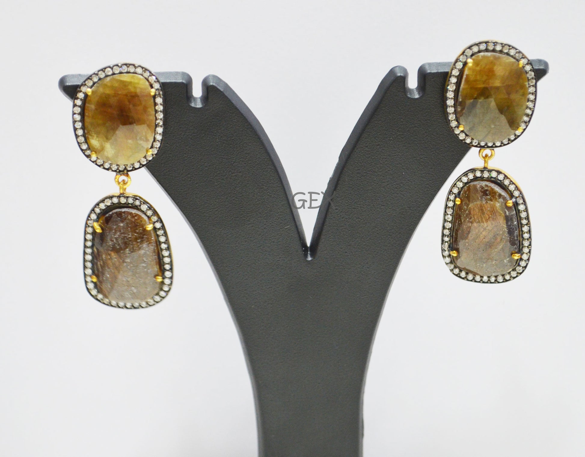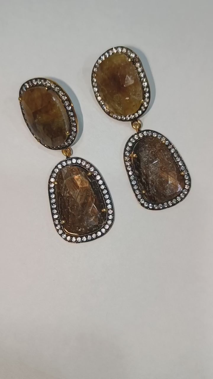 92.5 Sterling Silver Shaded Brown Sapphire Faceted Fancy Shape Earring , Shaded Brown Sapphire With Pave Cubic Zirconia Earring , 50 mm , E-019