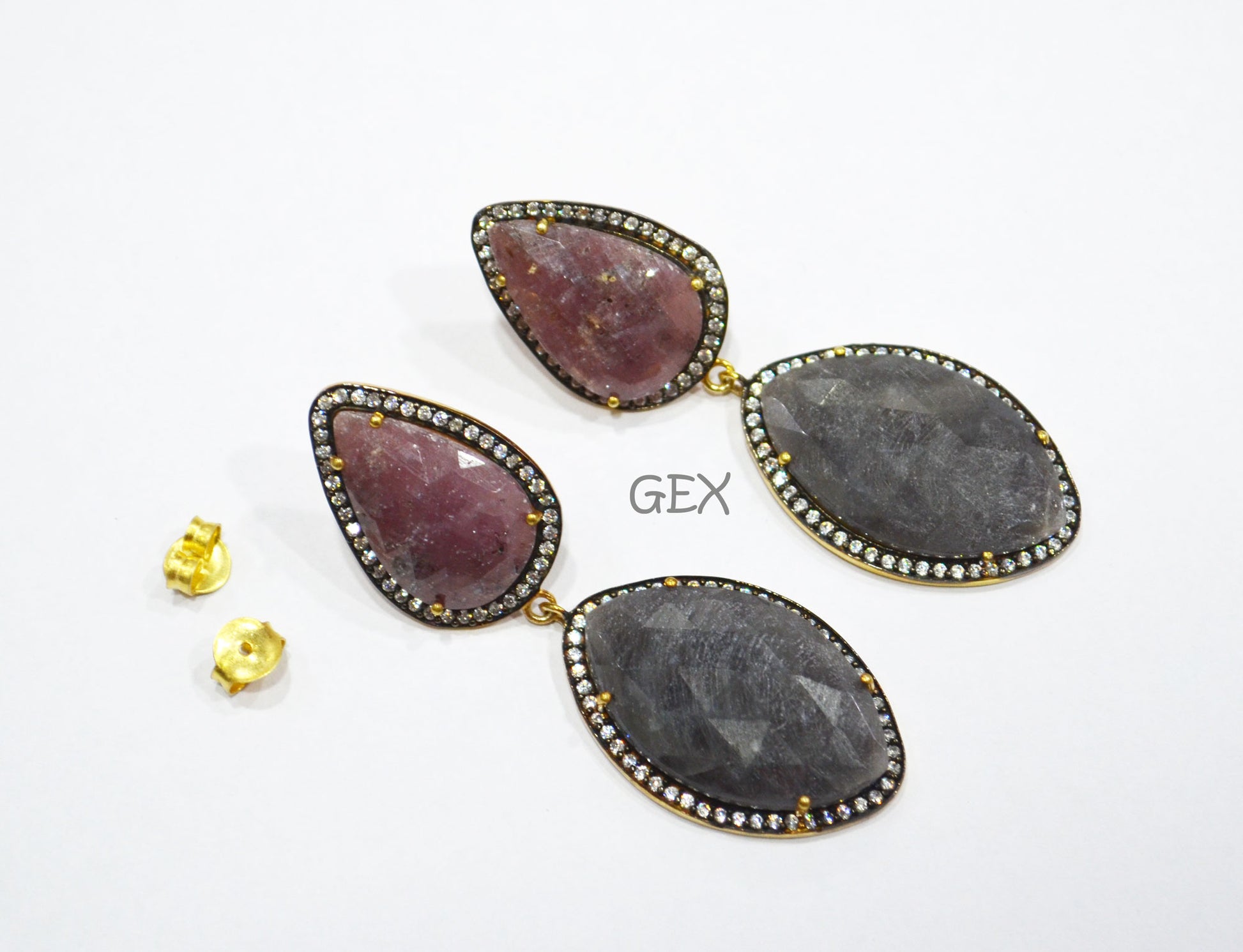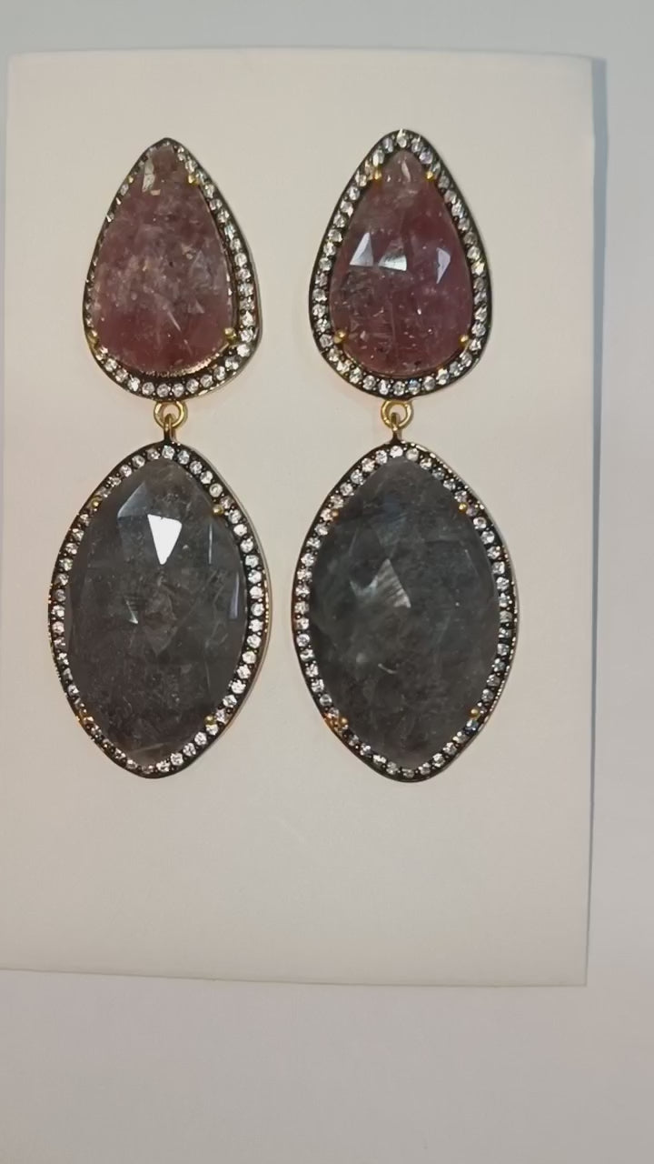 92.5 Sterling Silver Shaded Ruby And Gray Sapphire Faceted Fancy Shape Earring , Shaded Ruby And Gray Sapphire With Pave Cubic Zirconia Earring , 59 mm , E-029