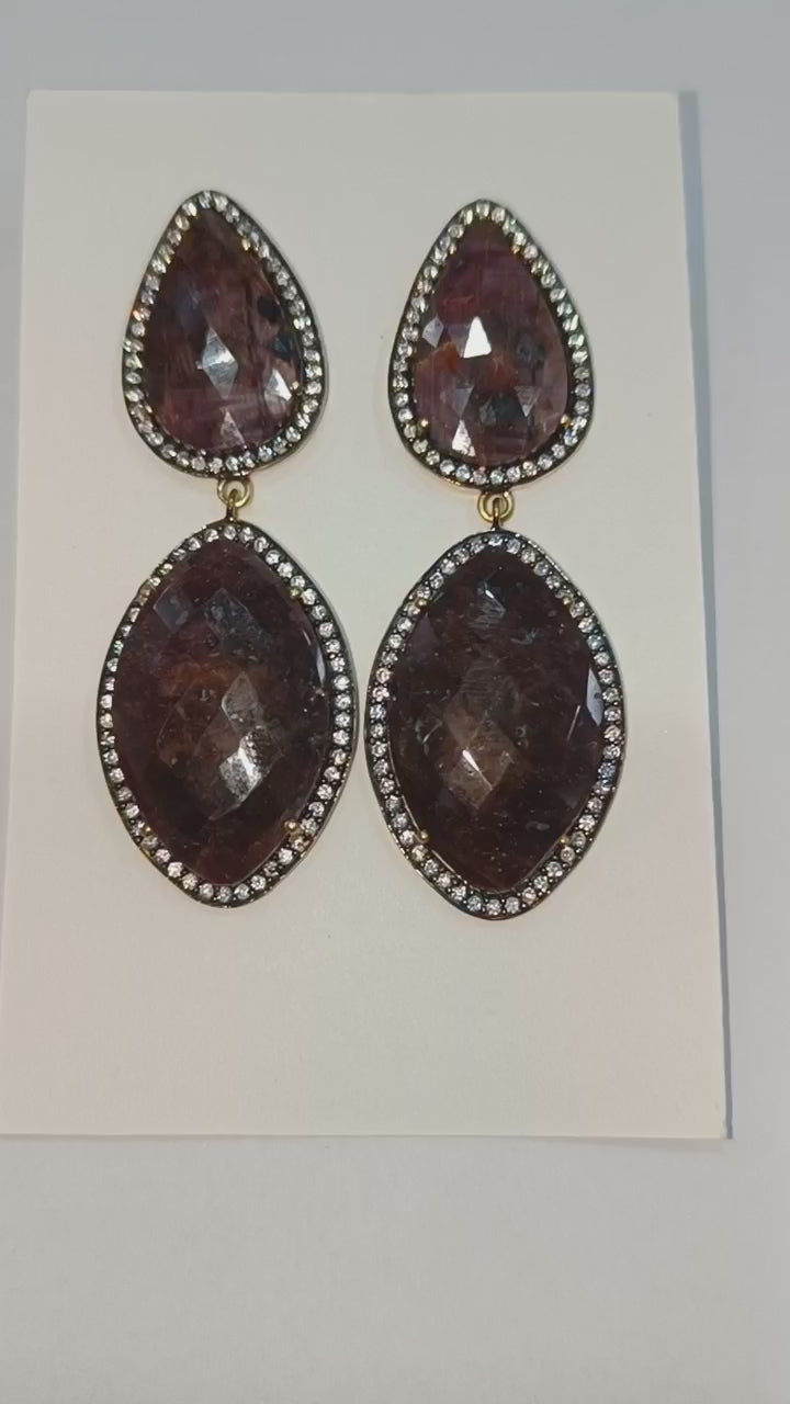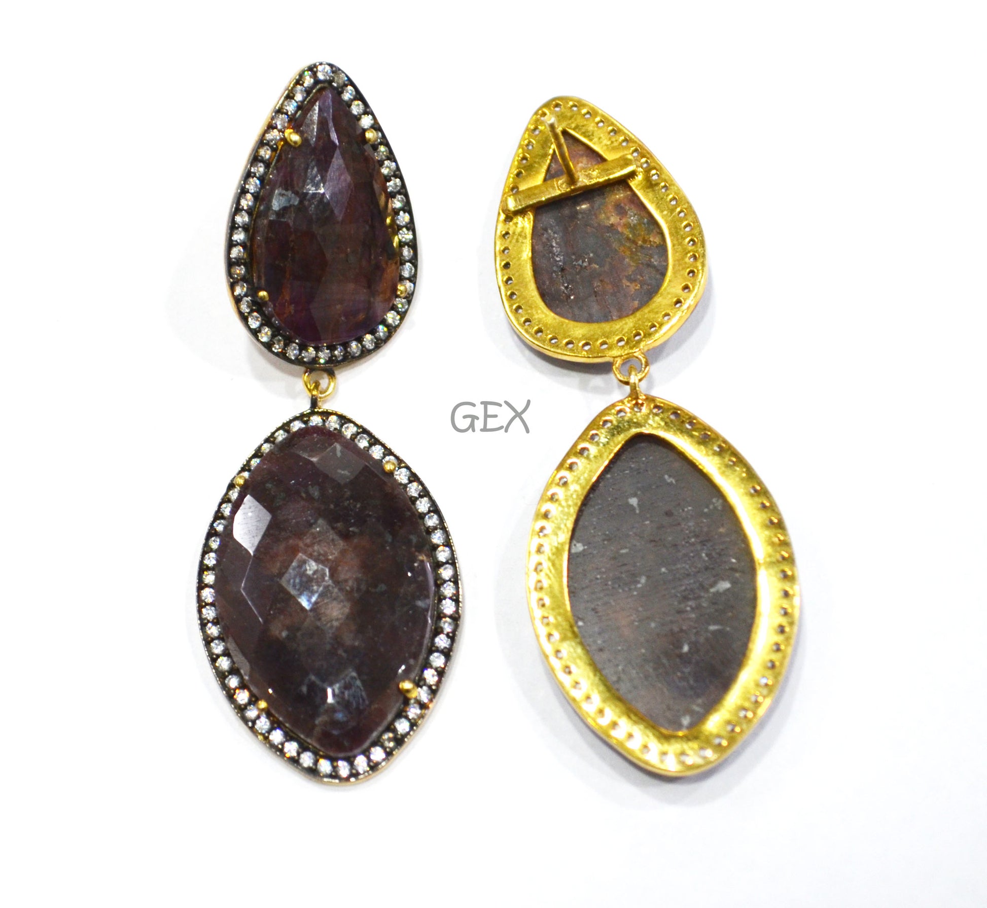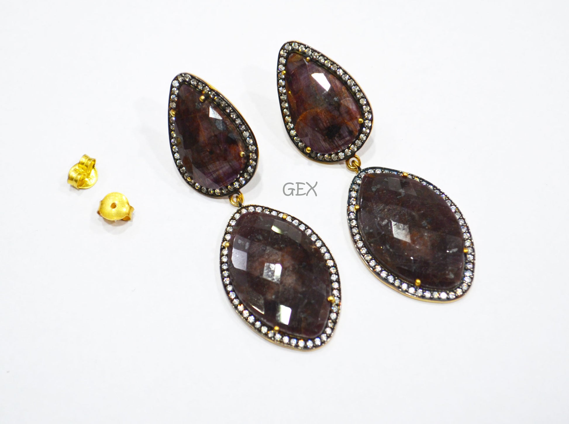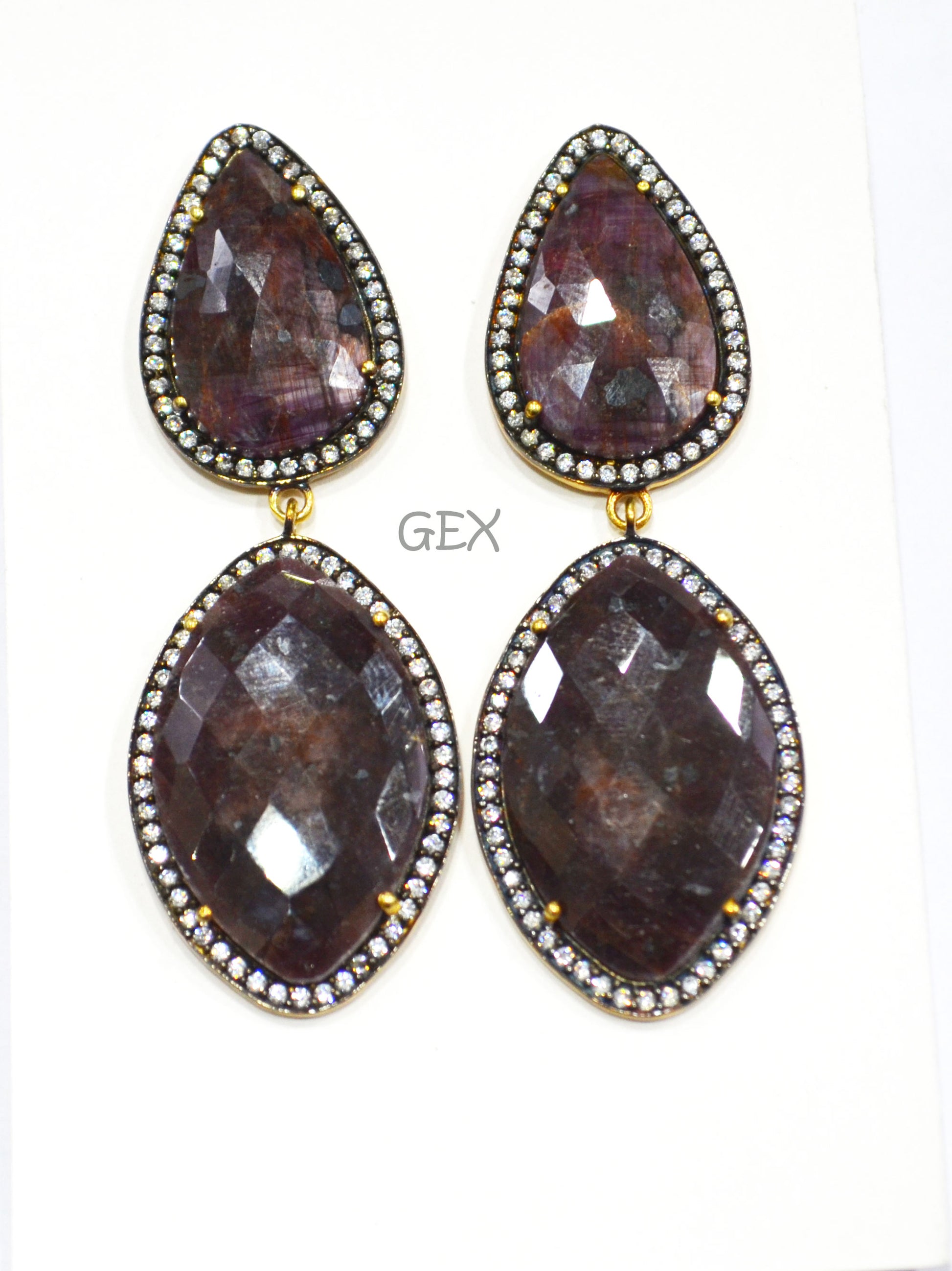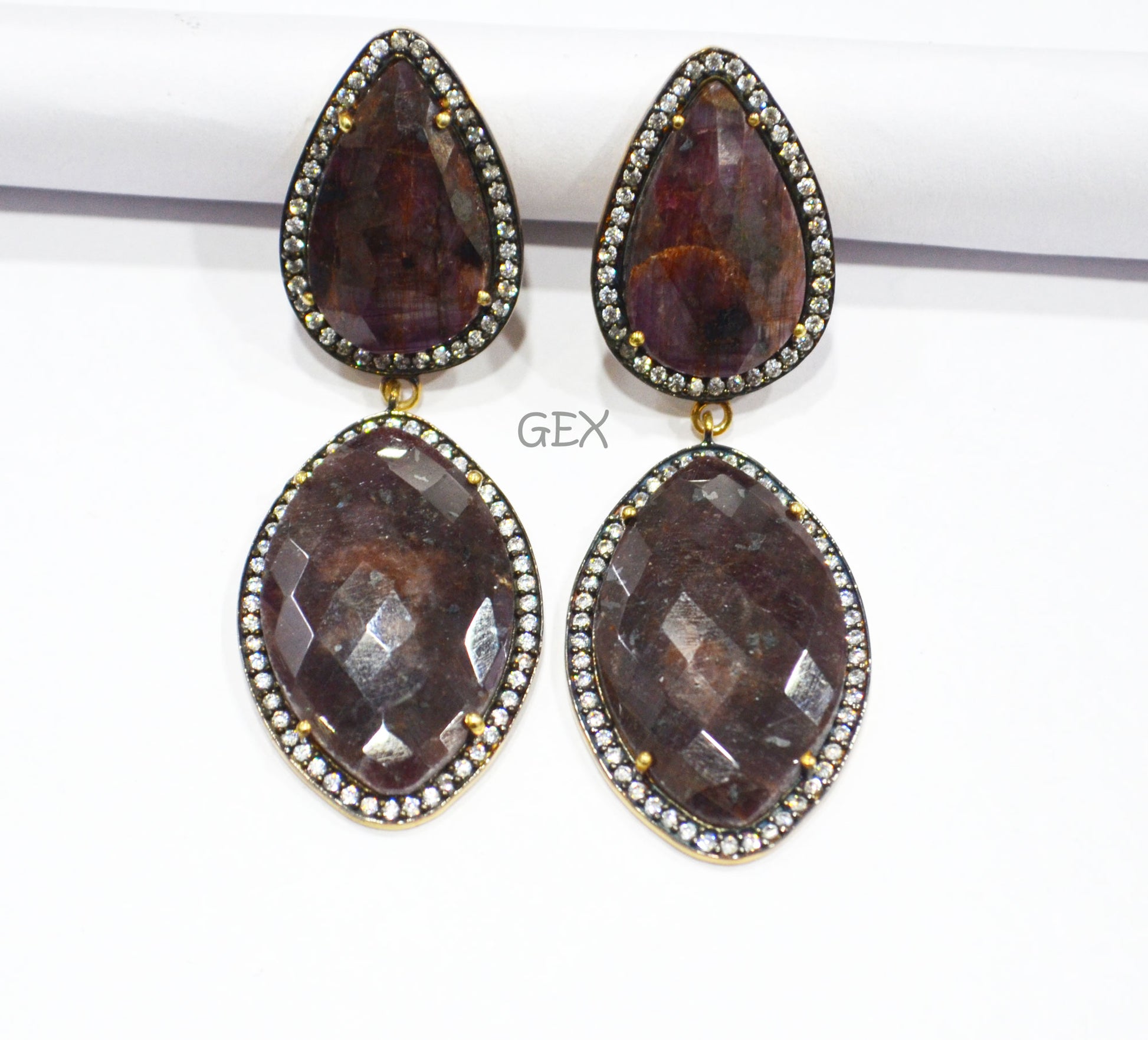 92.5 Sterling Silver Shaded Ruby Sapphire Faceted Fancy Shape Earring , Shaded Ruby Sapphire With Pave Cubic Zirconia Earring , 60 mm , E-053