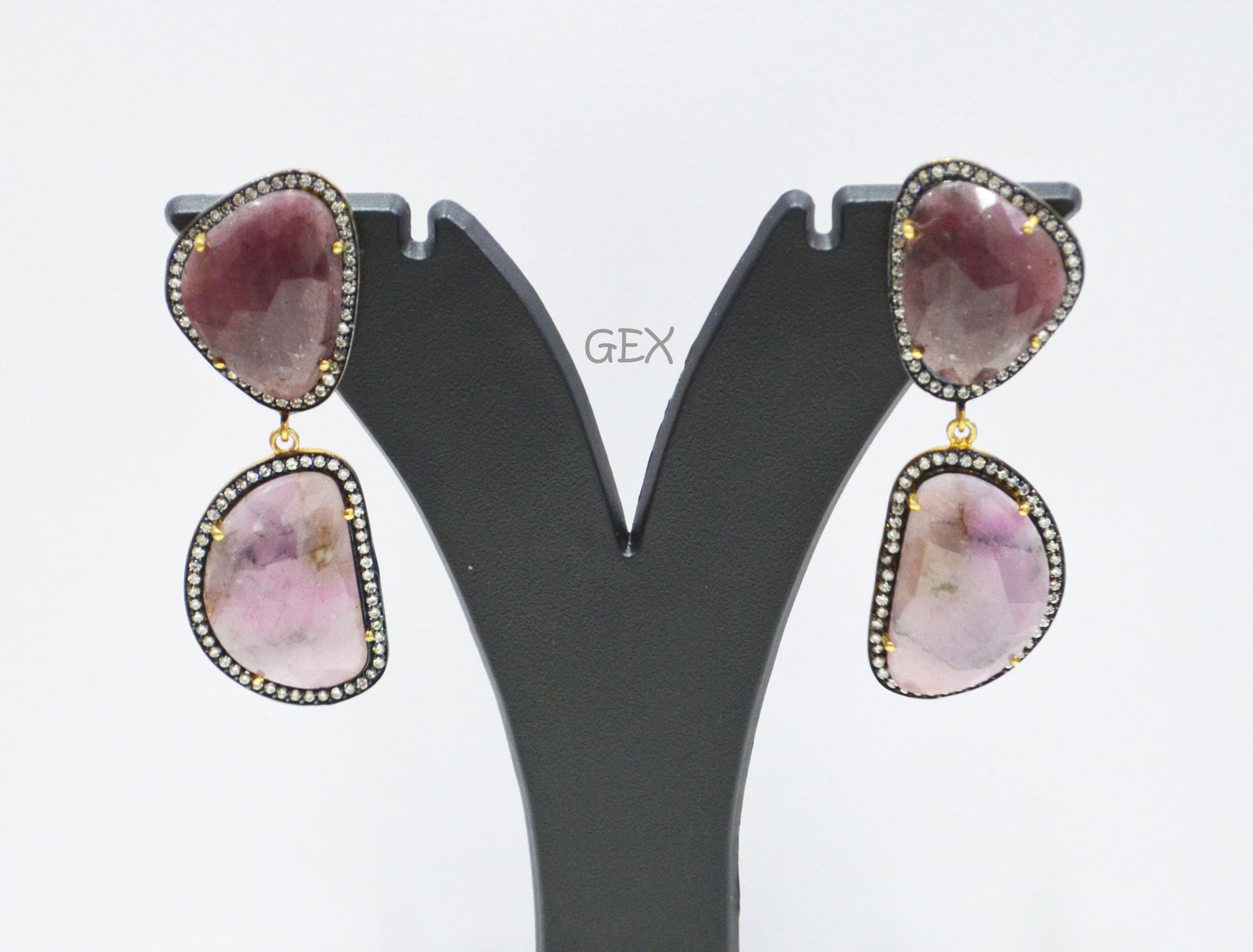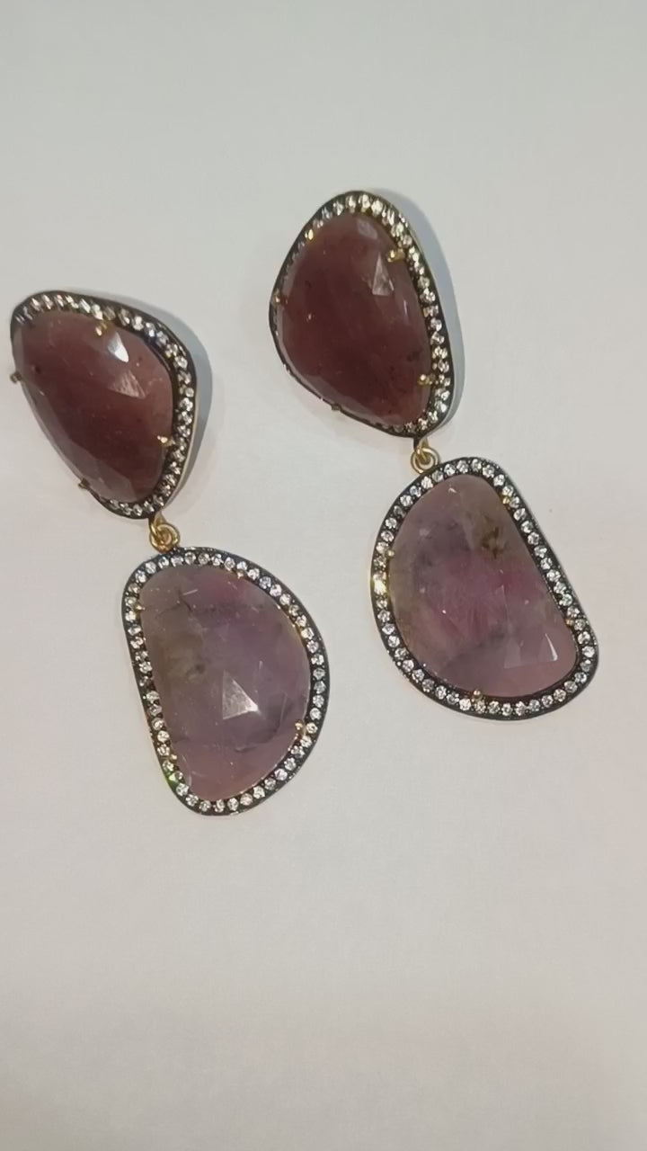 92.5 Sterling Silver Shaded Purple And Ruby Sapphire Faceted Fancy Shape Earring , Shaded Purple And Ruby Sapphire With Pave Cubic Zirconia Earring , 60 mm , E-070
