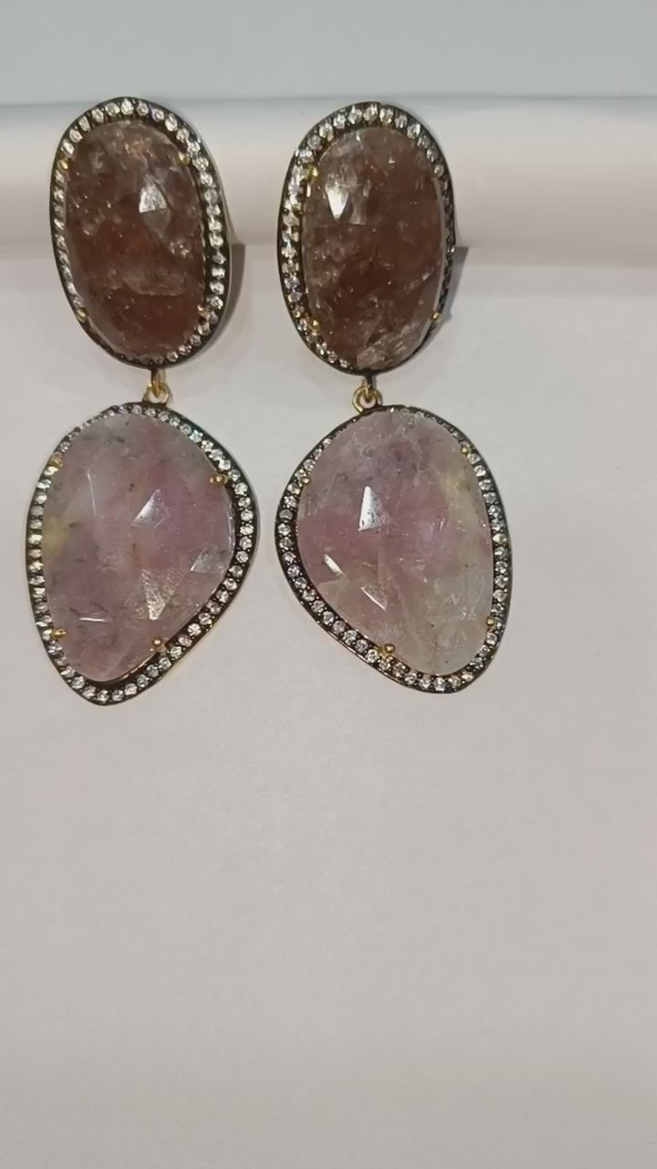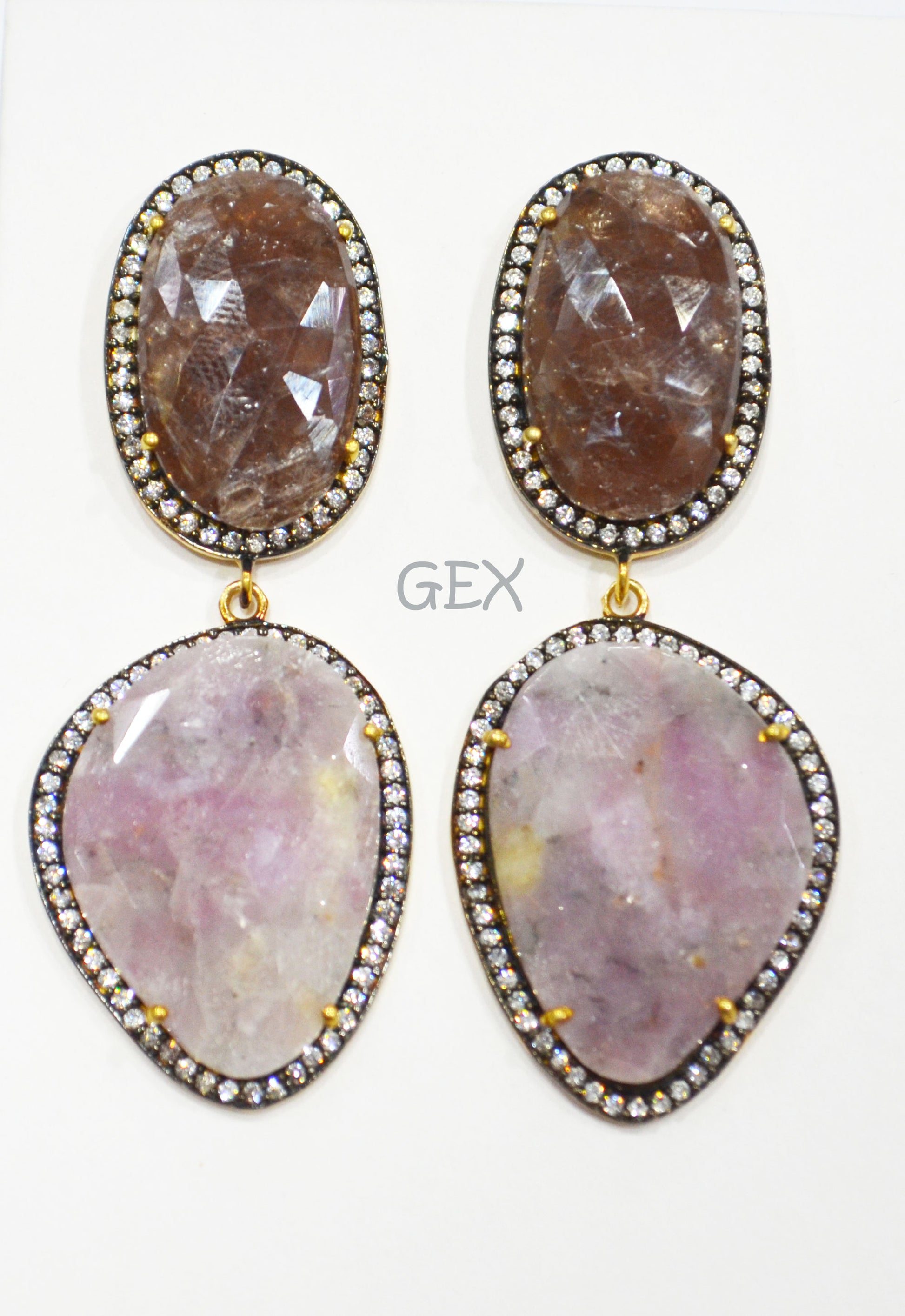 92.5 Sterling Silver Shaded White Purple And Brown Sapphire Faceted Fancy Shape Earring , Shaded White Purple And Brown Sapphire With Pave Cubic Zirconia Earring , 60 mm , E-030