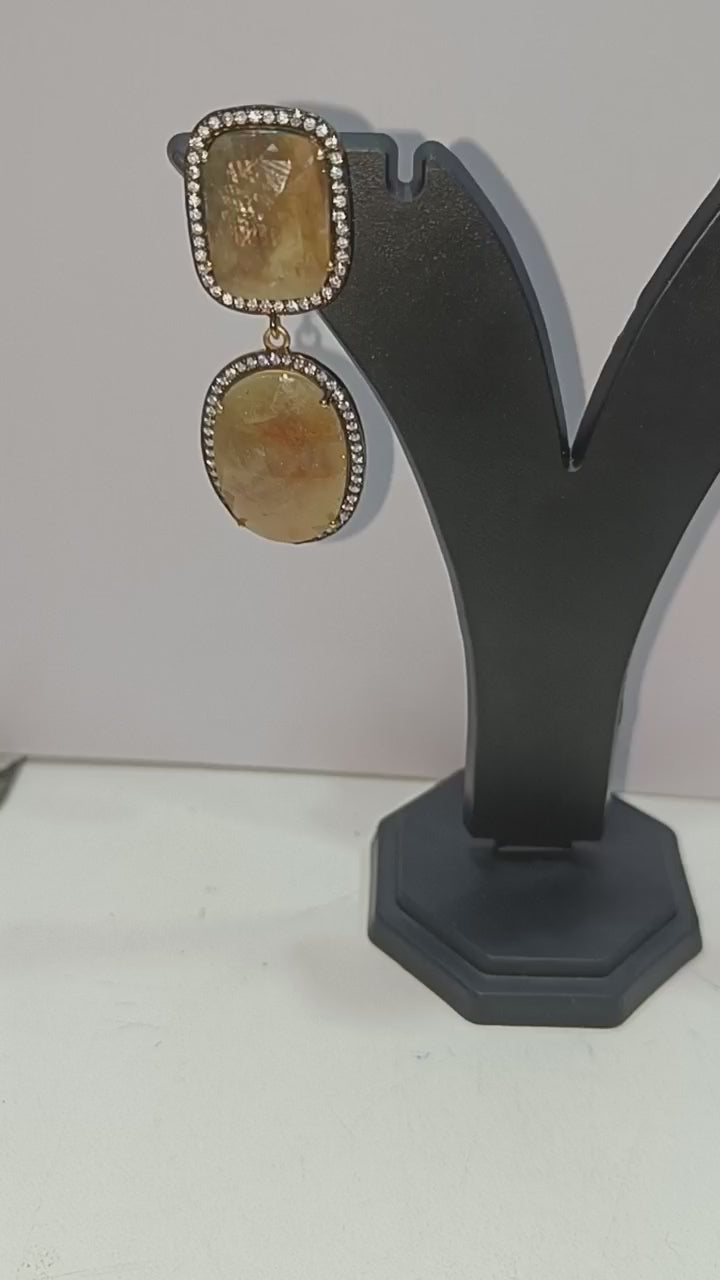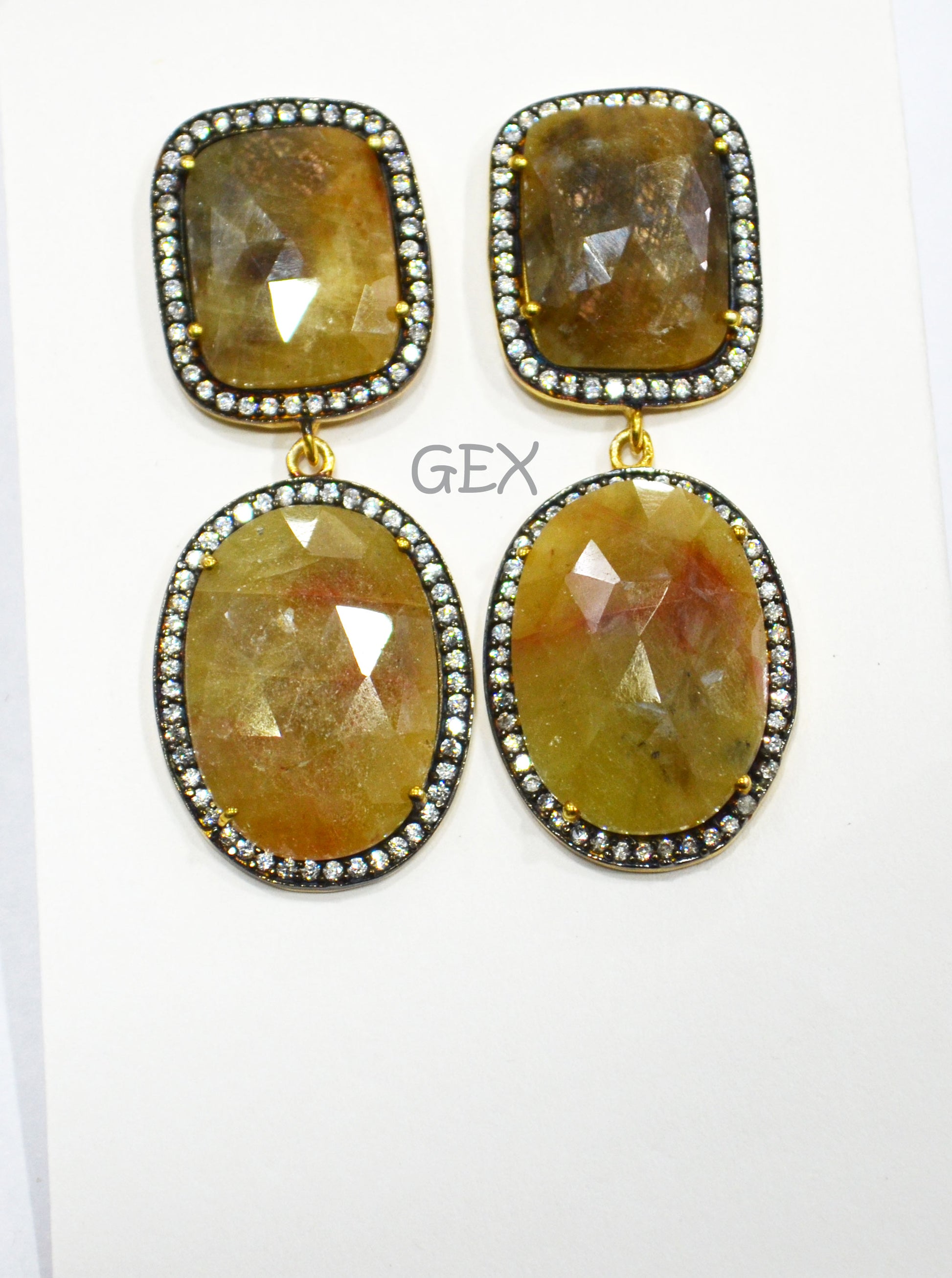 92.5 Sterling Silver Shaded Yellow Sapphire Faceted Fancy Shape Earring , Shaded Yellow Sapphire With Pave Cubic Zirconia Earring , 50 mm , E-035
