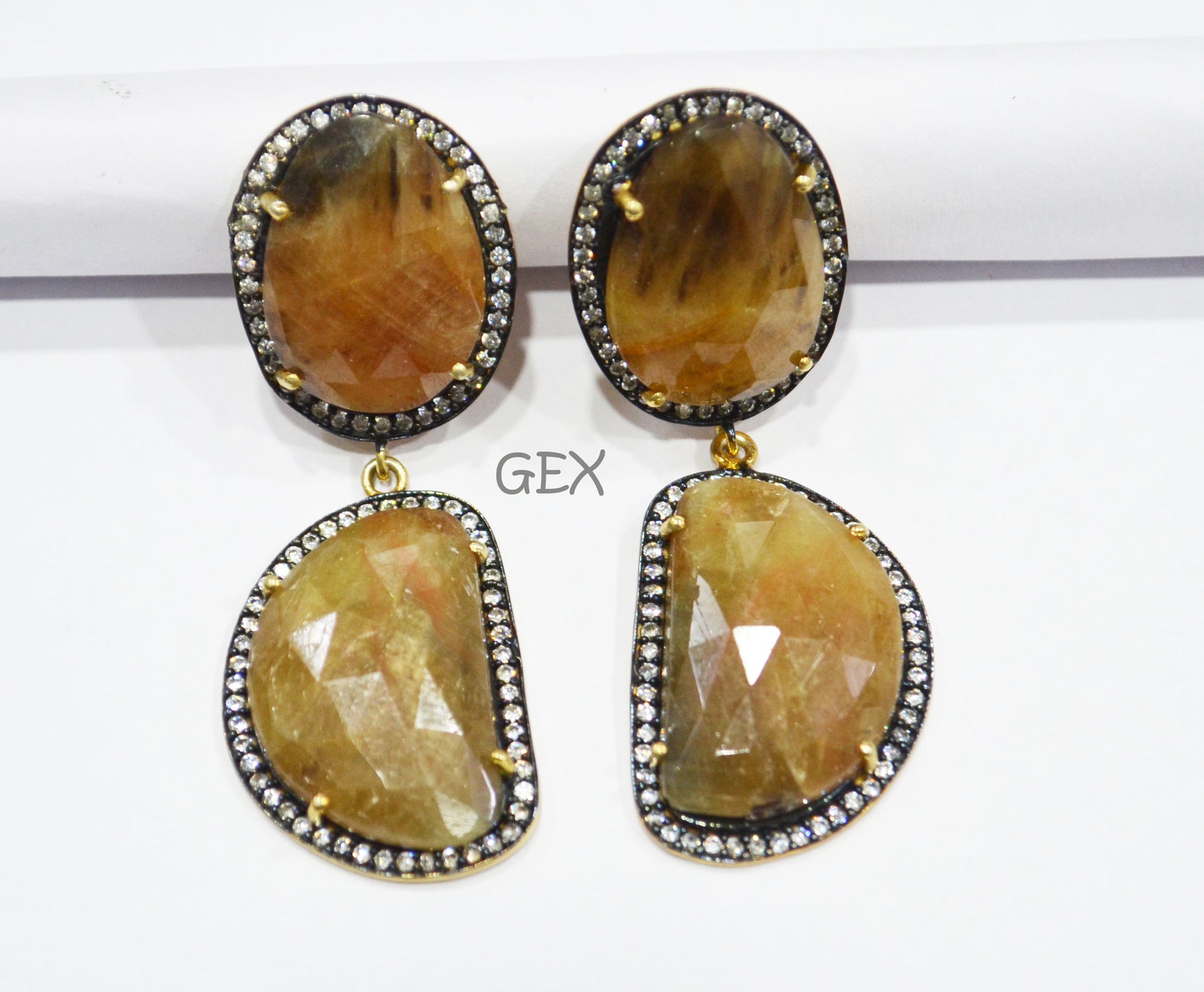92.5 Sterling Silver Shaded Yellow Sapphire Faceted Fancy Shape Earring , Shaded Yellow Sapphire With Pave Cubic Zirconia Earring , 60 mm , E-005