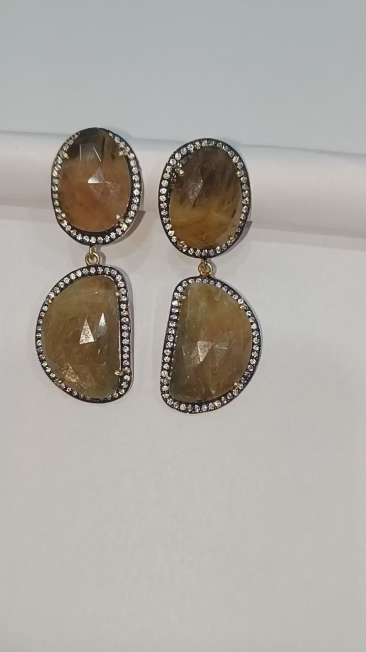 92.5 Sterling Silver Shaded Yellow Sapphire Faceted Fancy Shape Earring , Shaded Yellow Sapphire With Pave Cubic Zirconia Earring , 55 mm , E-017