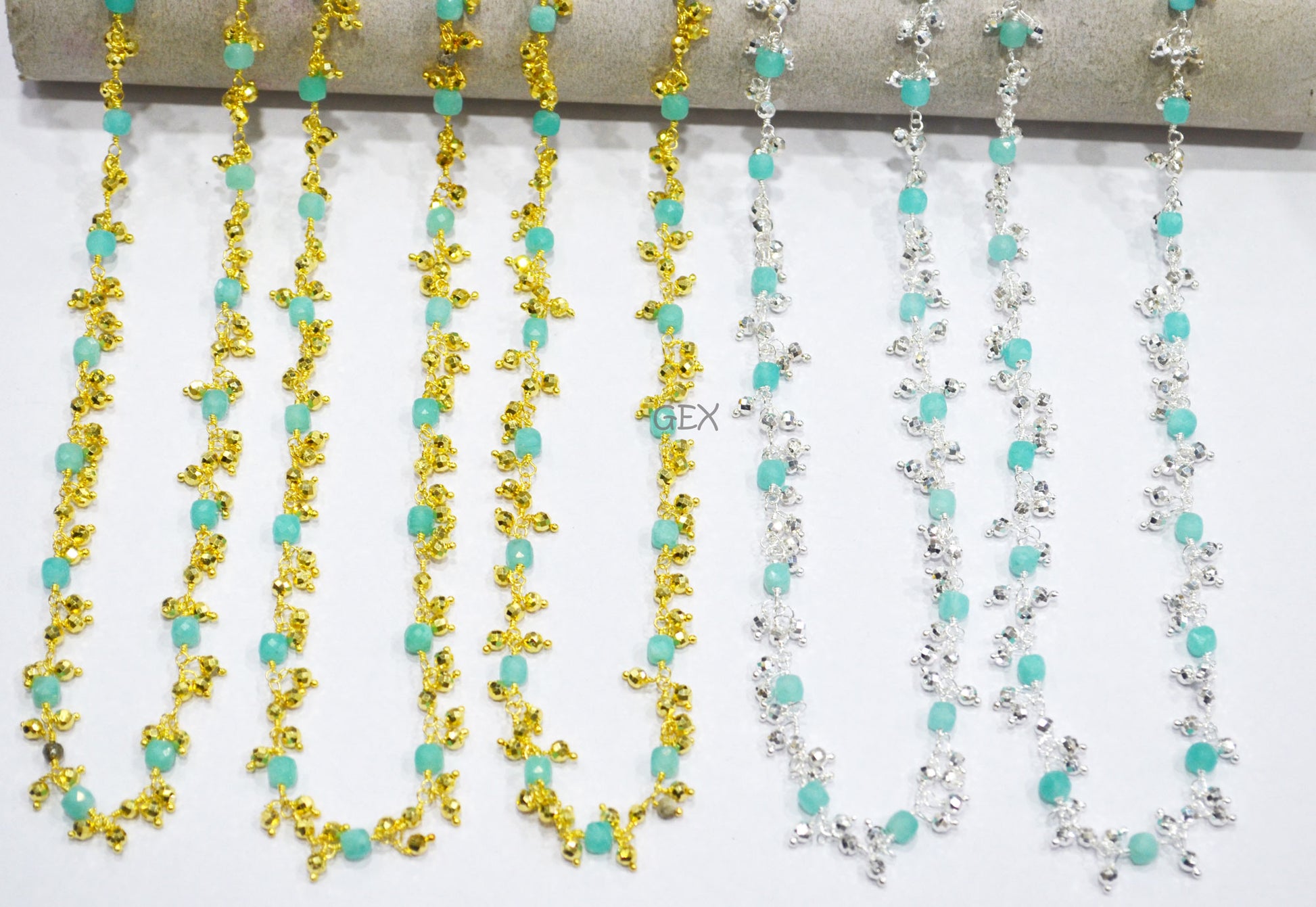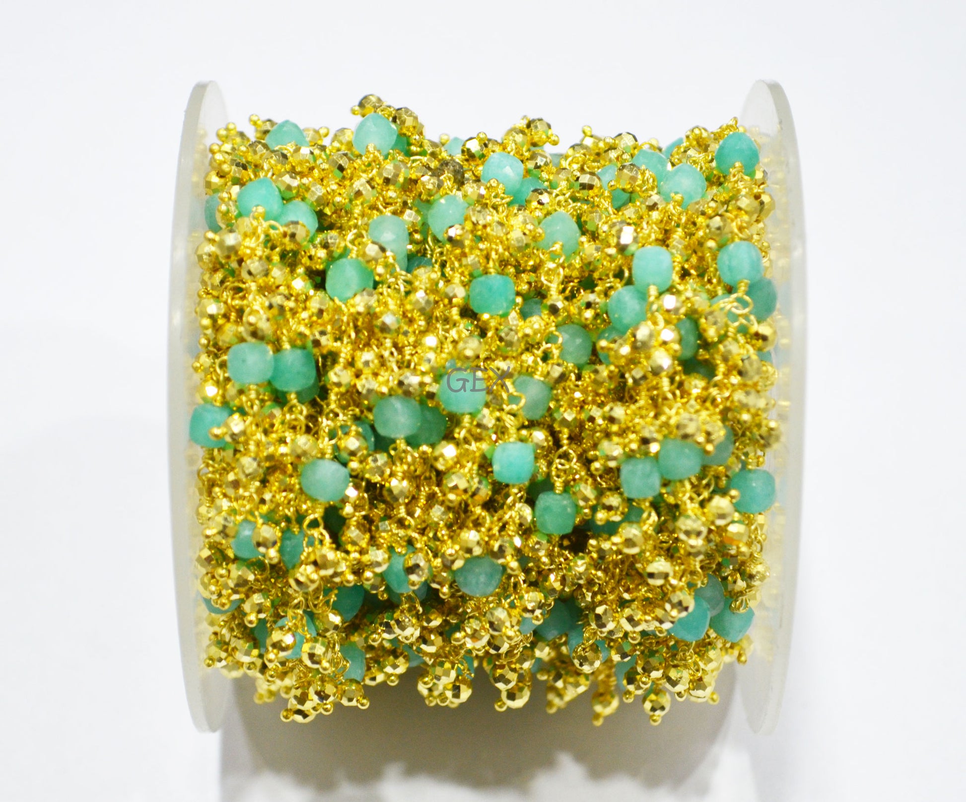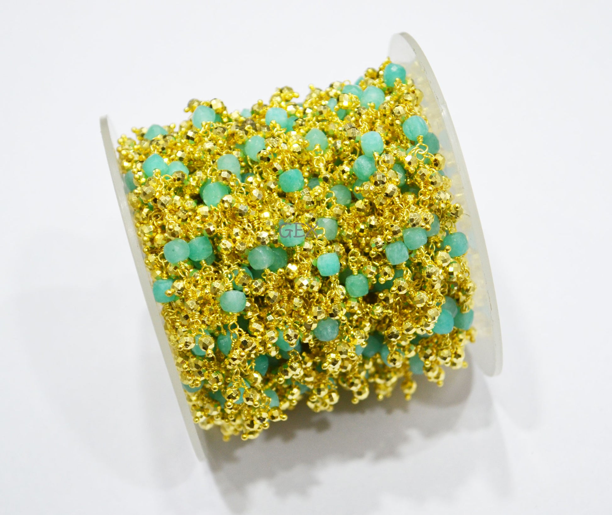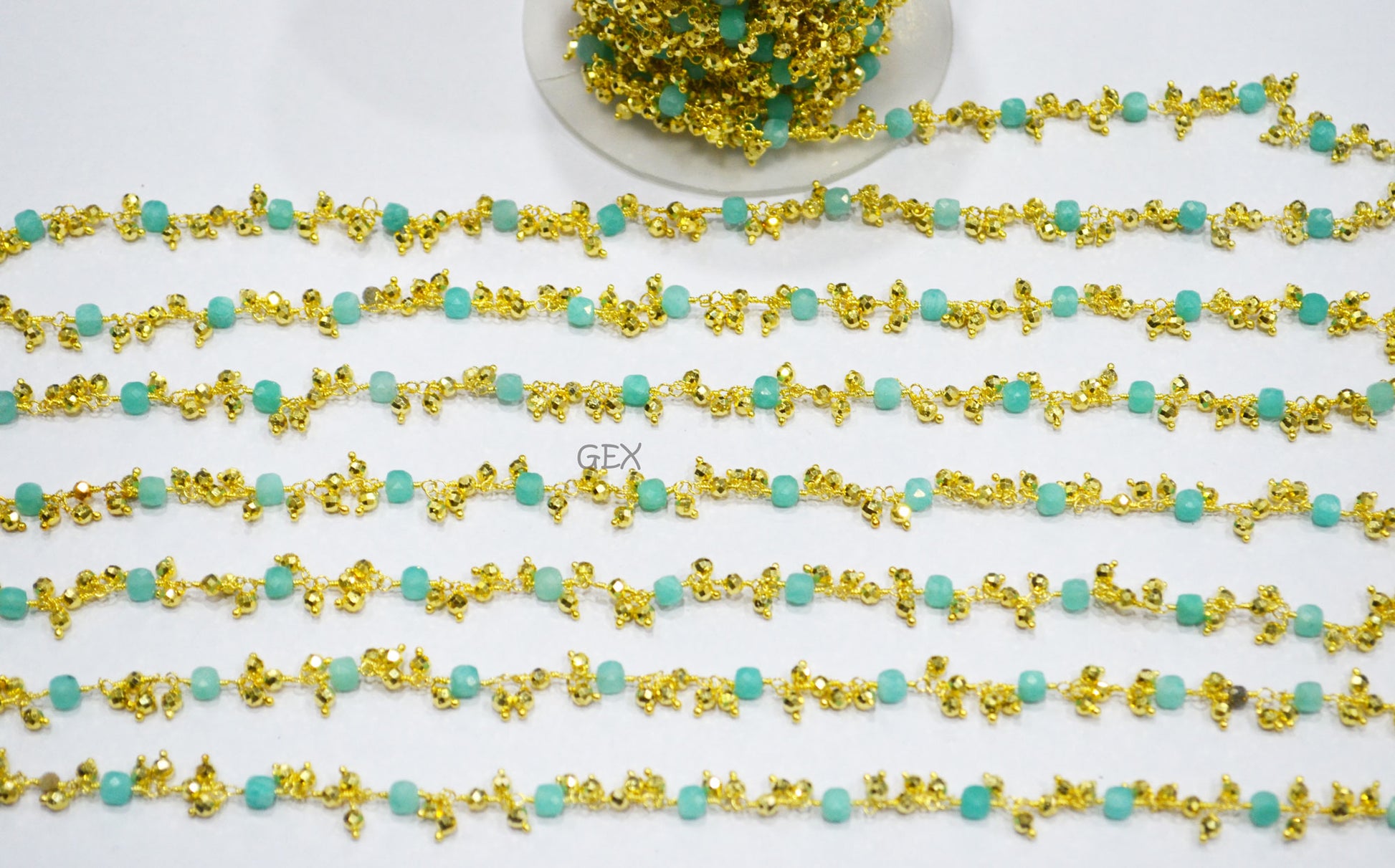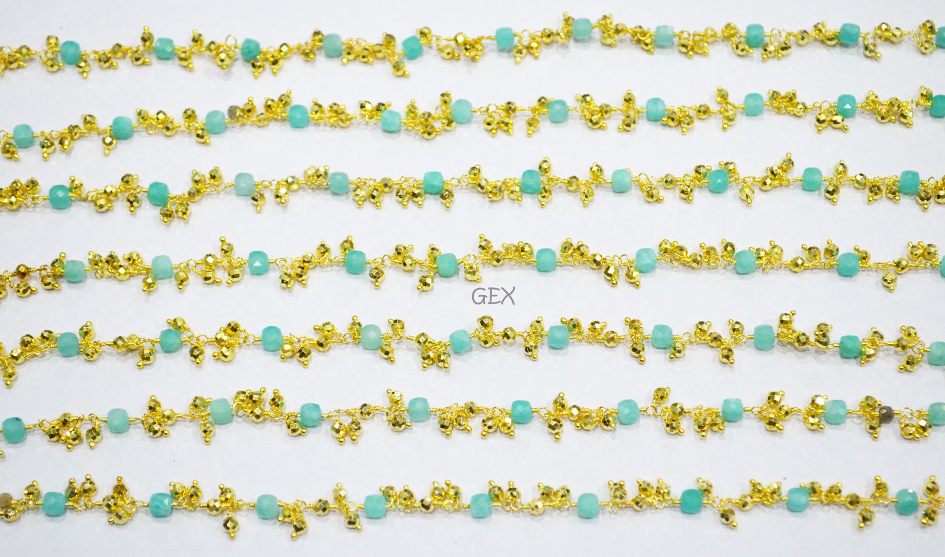 Amazonite Faceted 3D Box Shape Angoori Cluster Chain , Amazonite Cube With Pyrite Round Shape Beaded Dangling Chain , 3 - 4 mm , 7251
