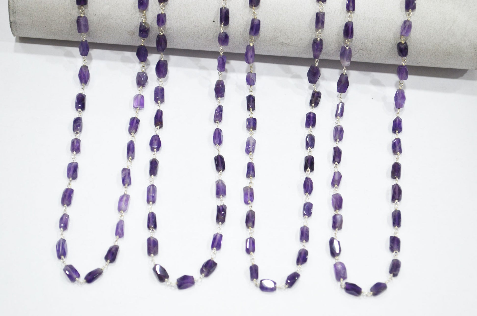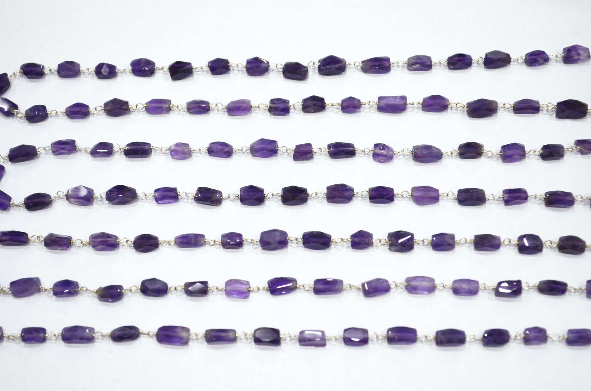 Amethyst Faceted Barrel Shape Rosary Beaded Chain , Amethyst Wire Wrapped Chain , 5 - 9 mm , RB-5743