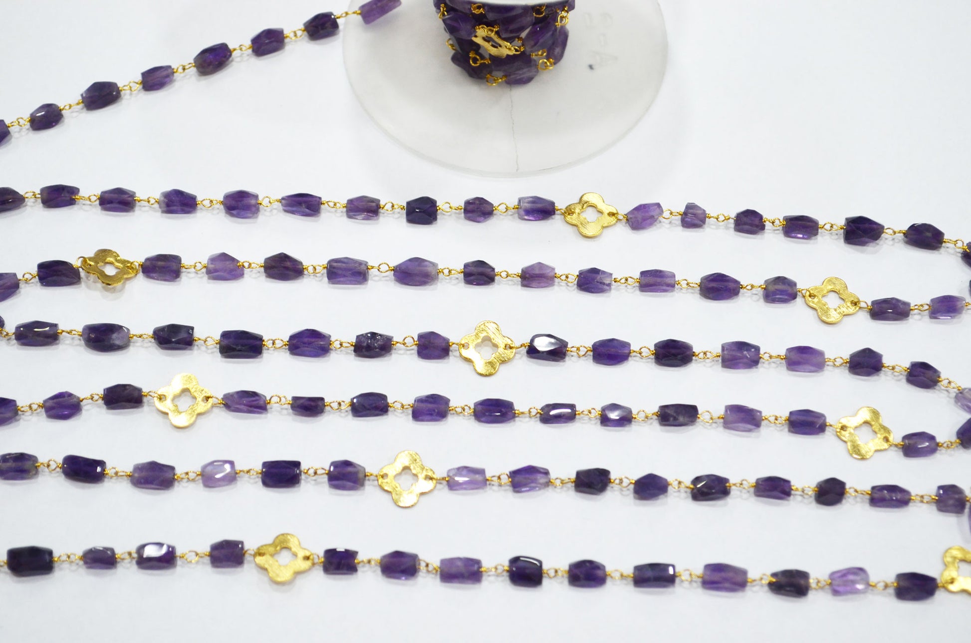 Amethyst Faceted Barrel Shape Rosary Beaded Chain , Amethyst Barrel Shape With Quatrefoil Clover Wire Wrapped Chain , 5 - 9 mm , RB-5728