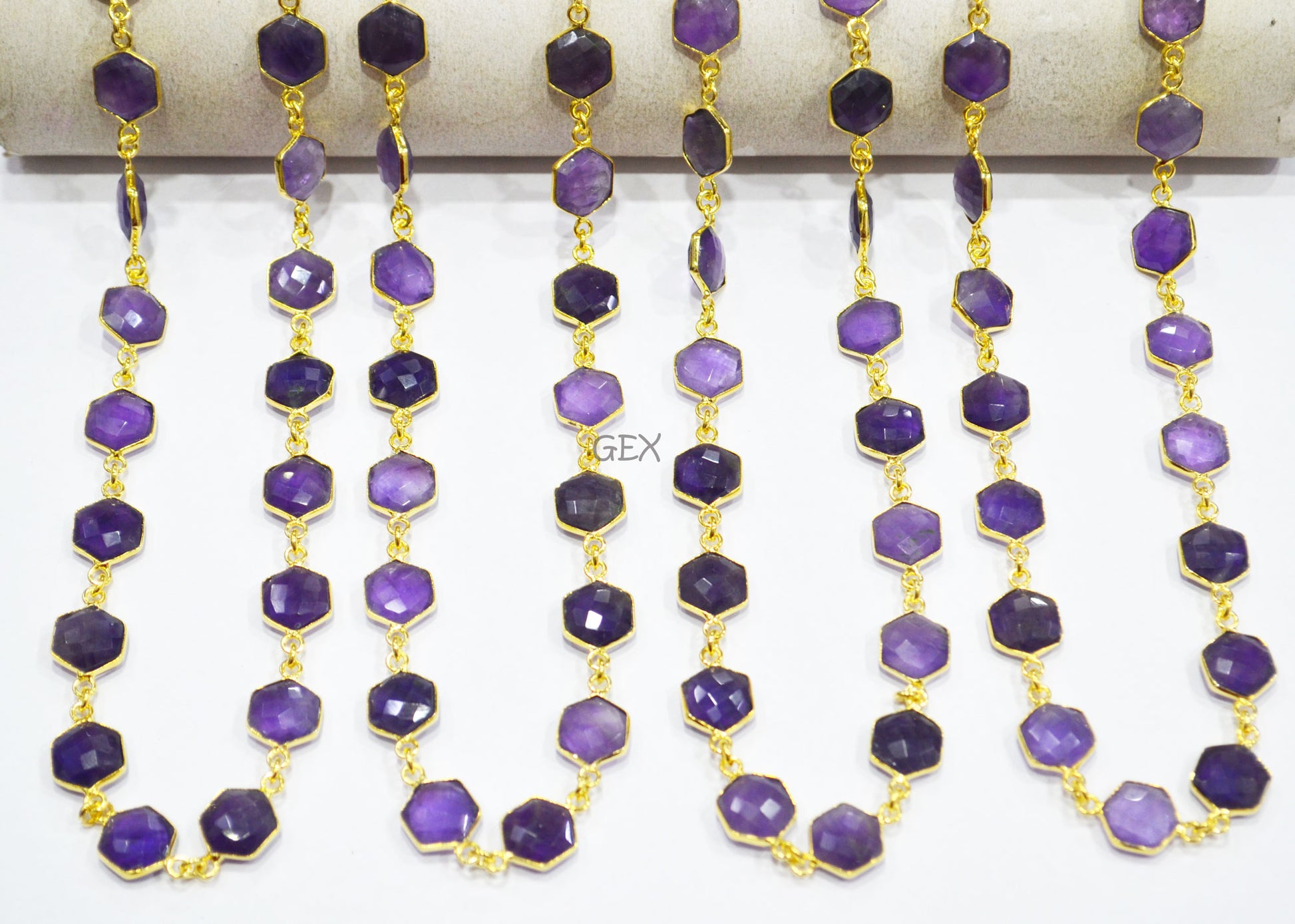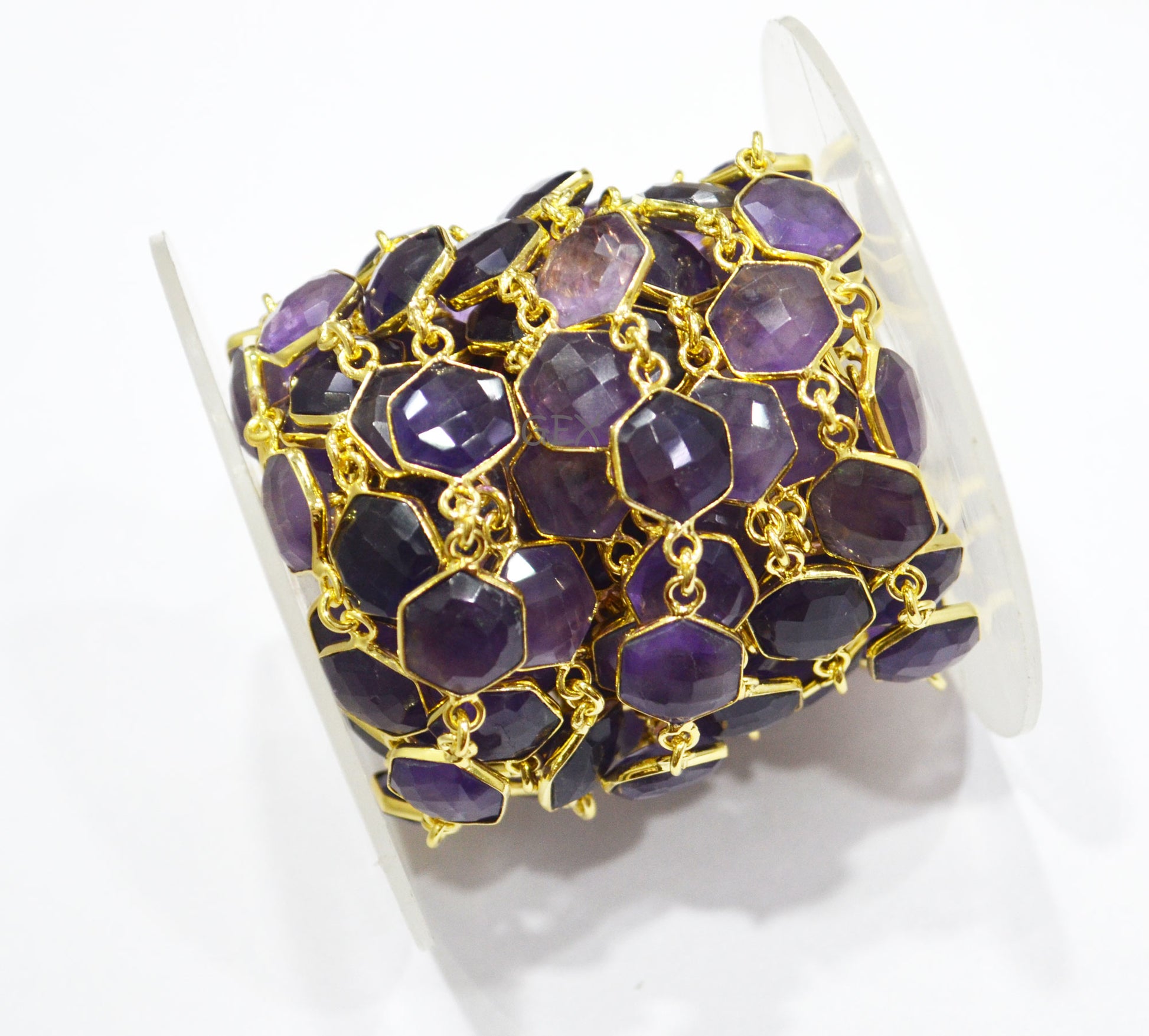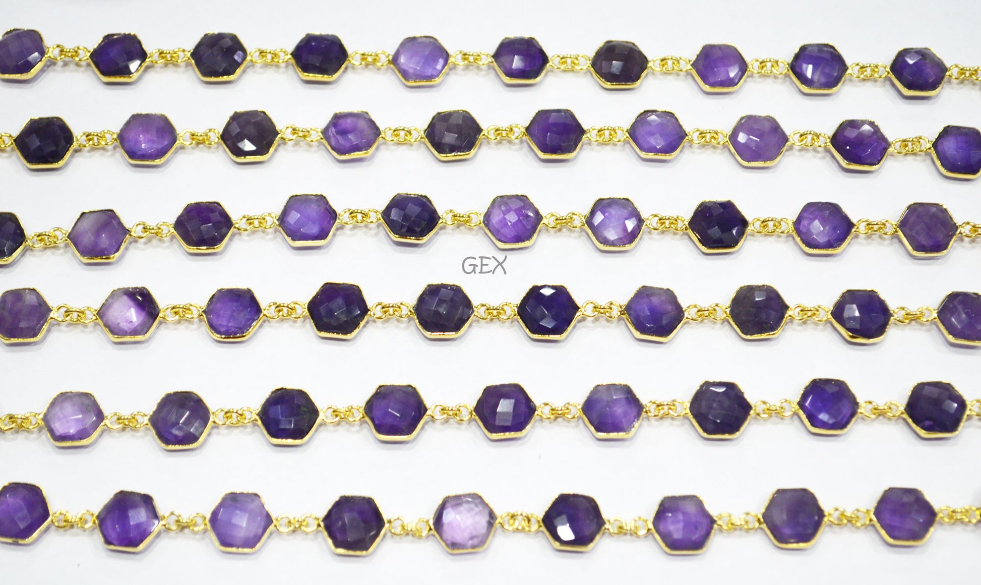 Amethyst Faceted Hexagon Shape Connector Chain , Amethyst Hexagon Shape Bezel Link Chain , 10 - 11 mm , RB-7211