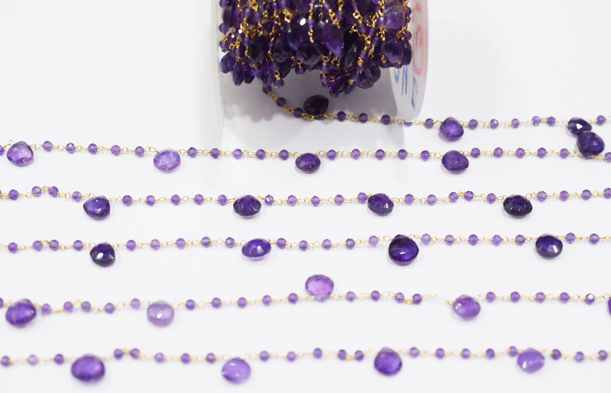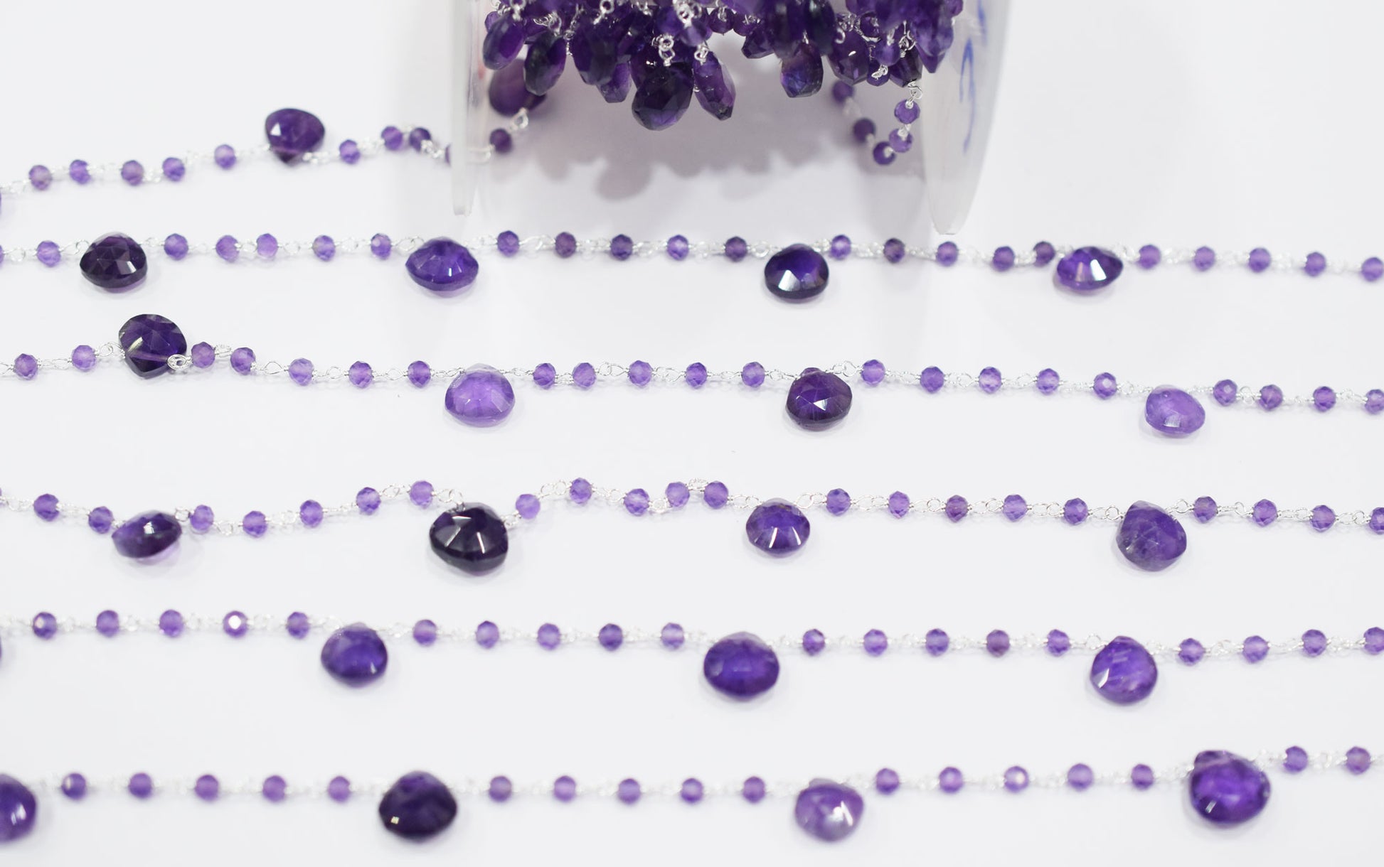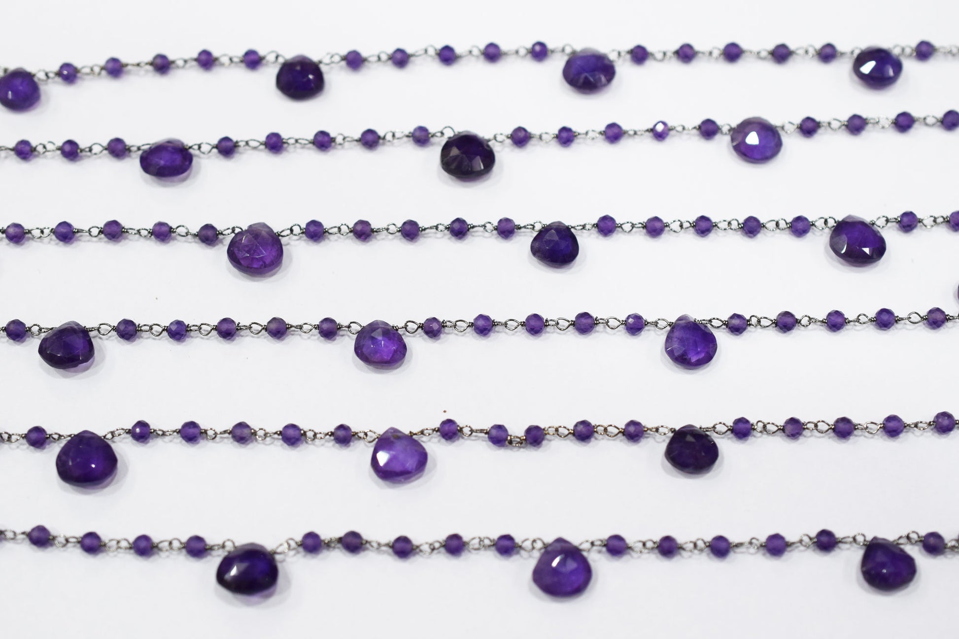 Amethyst Faceted Rondelle Shape Rosary Beaded Chain , Amethyst Tear Drops Shape Wire Wrapped Chain , Sold By Foot , 2.75 - 8 mm , RB-6665