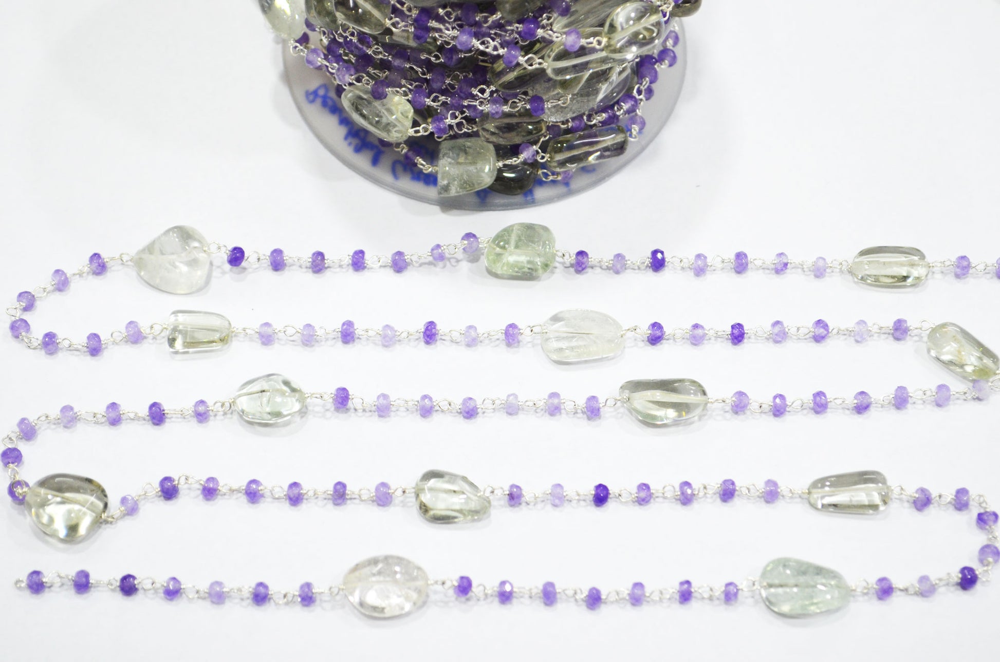 Amethyst Jade Faceted Rondelle Shape Rosary Chain , Green Amethyst Smooth Nuggets Wire Wrapped Chain , 4 - 4.50 mm , RB-6049