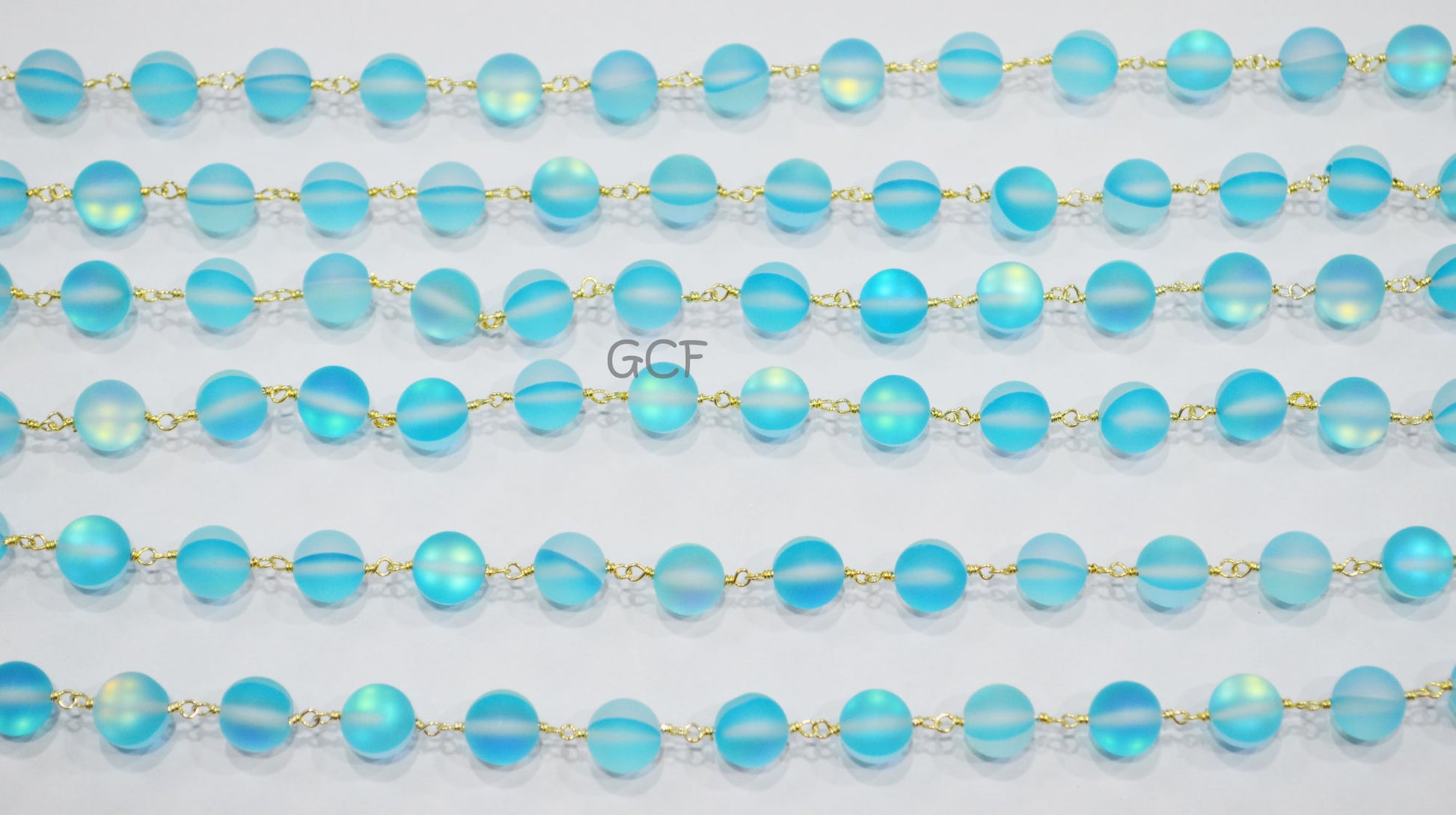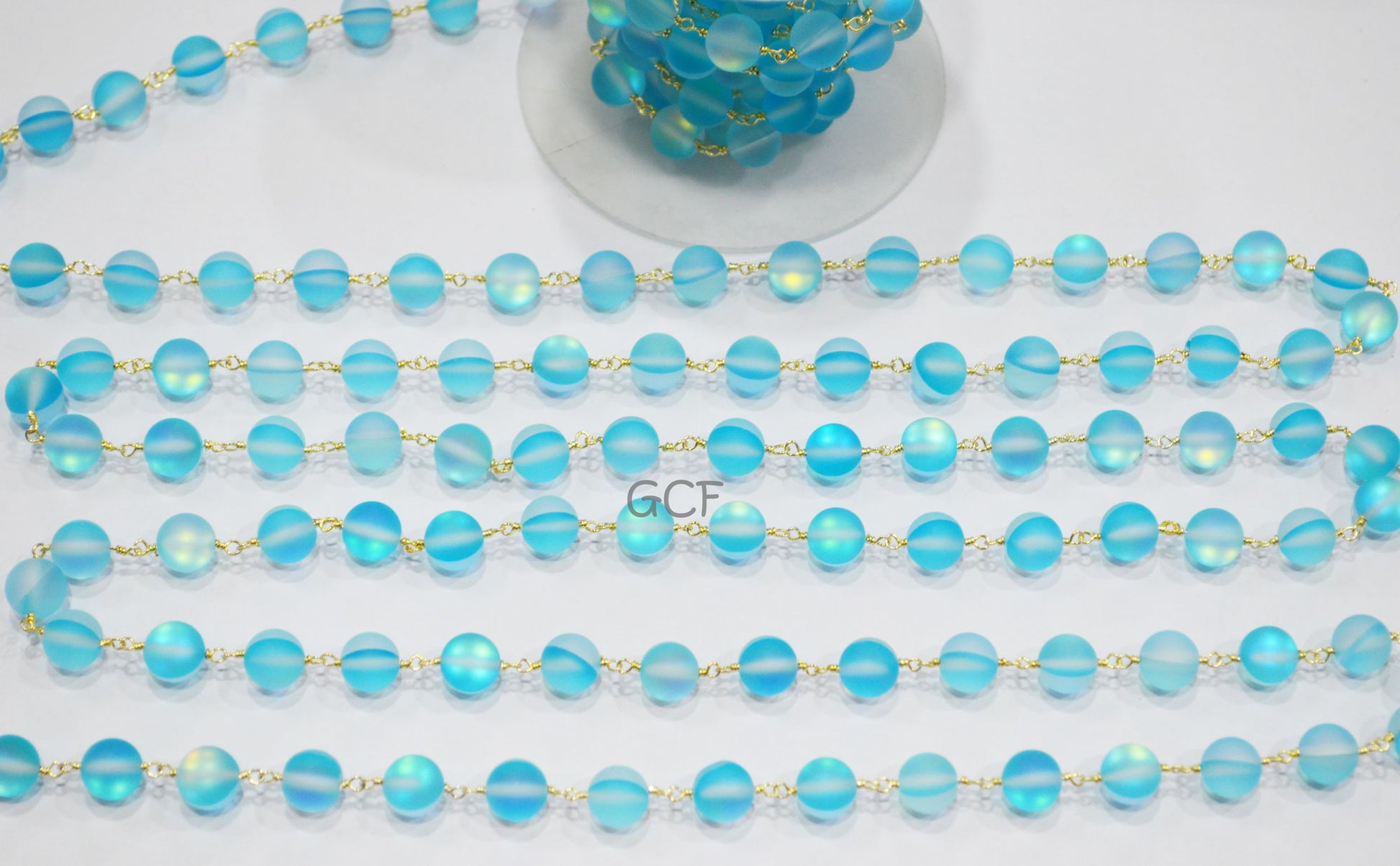 Aqua Blue Doublet Hydro Glass Smooth Rosary Beaded Chain , Aqua Blue Doublet Hydro Glass Round Shape Wire Wrapped Chain , 8 mm , RB-7107