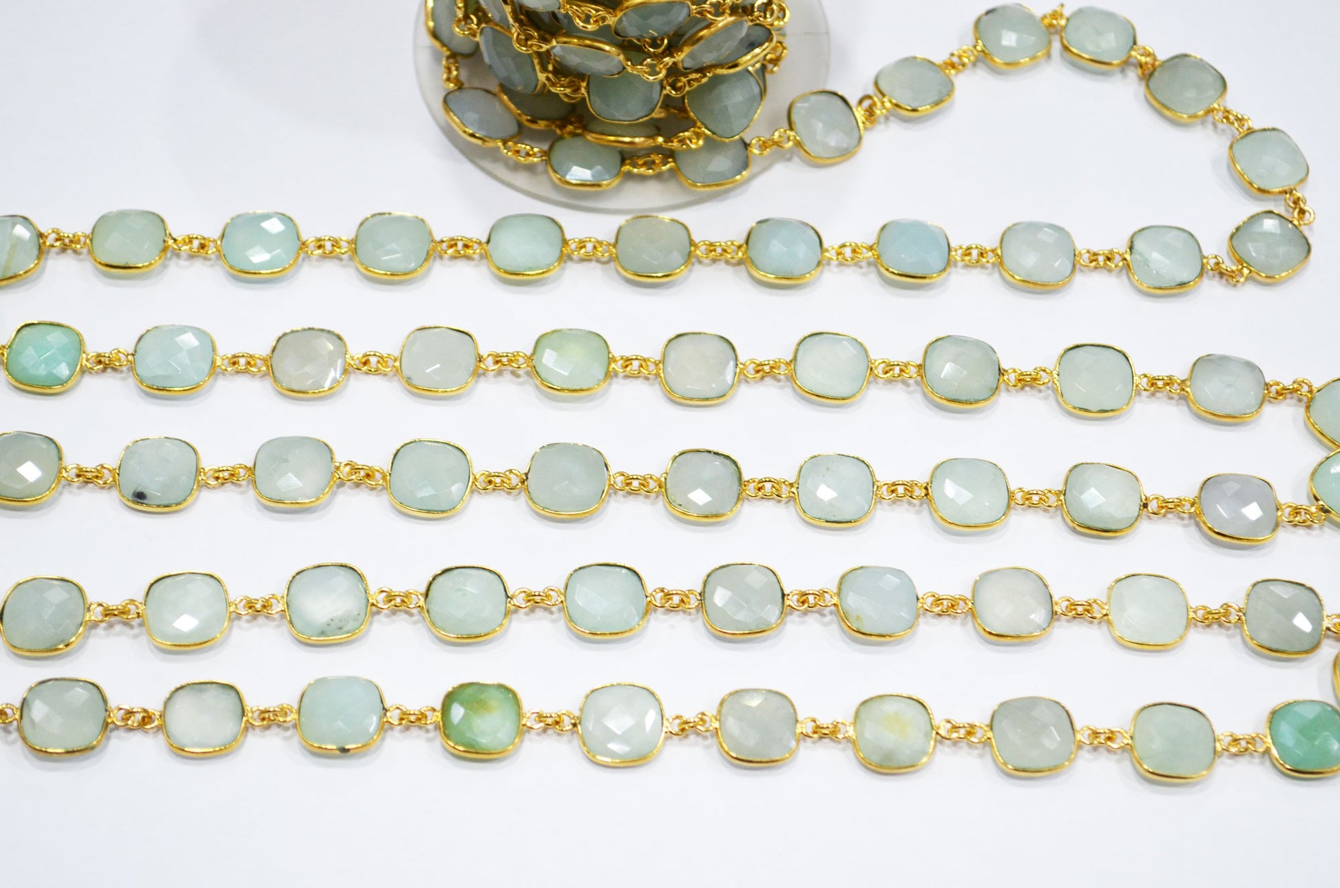 Aqua Chalcedony AB Coated Faceted Cushion Shape Connector Chain , Aqua Chalcedony AB Coated Bezel Link Chain , 12x12 mm , RB-7364