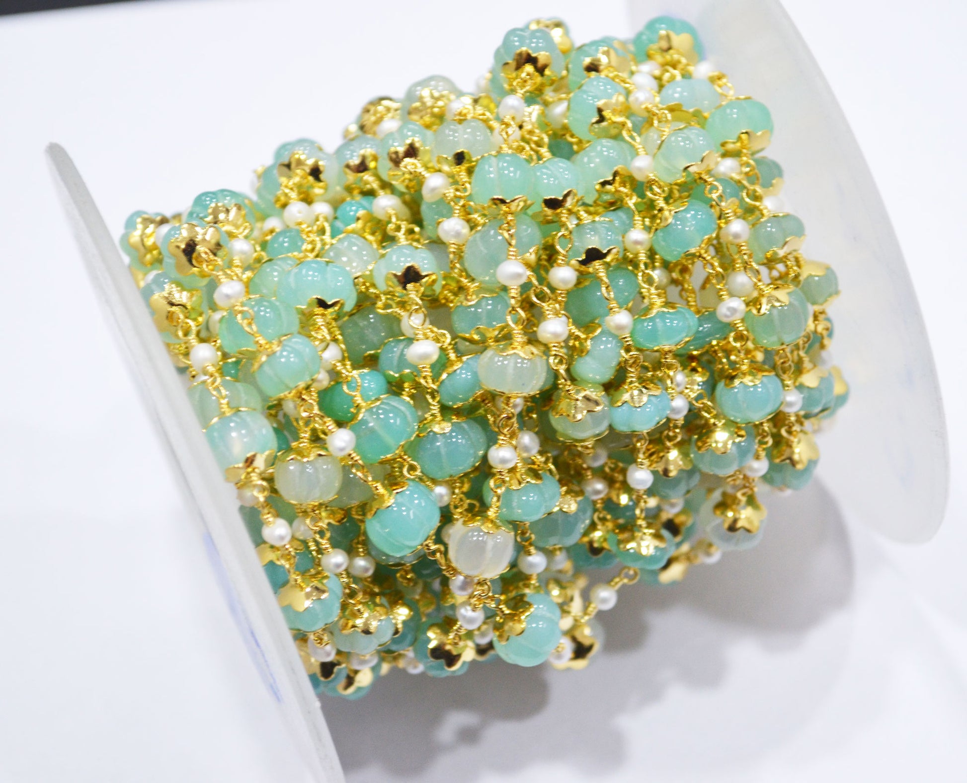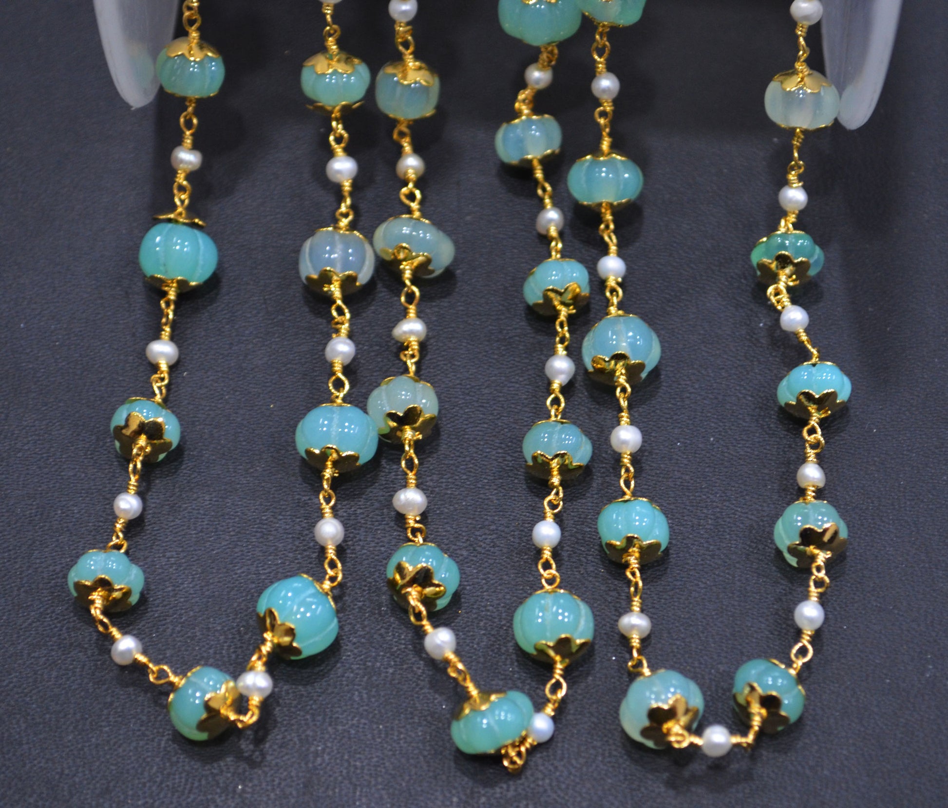 Aqua Chalcedony Carved Melons With Natural Pearl Smooth Rondelle Rosary Beaded Chain , 3 - 9 mm , 6708