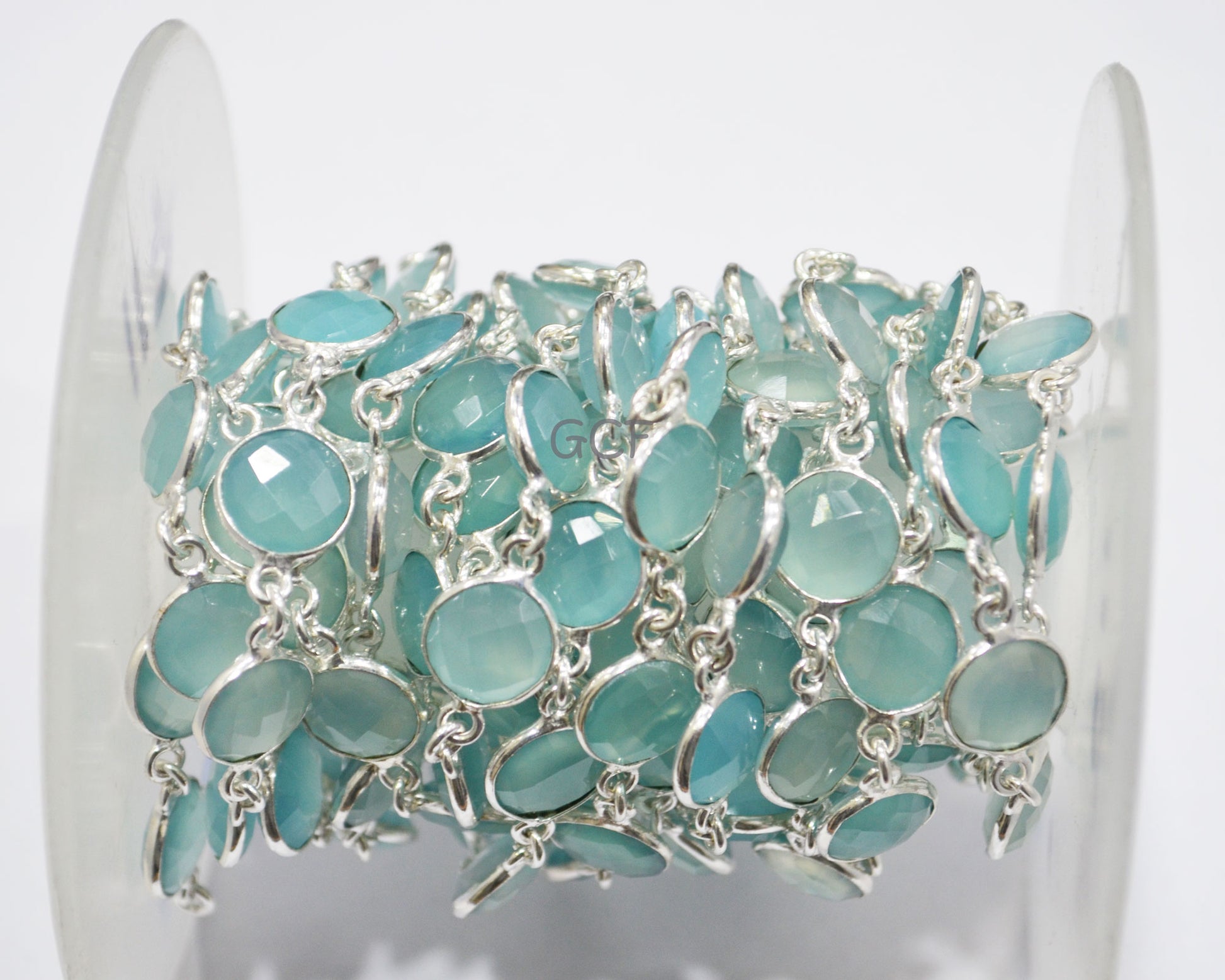 Aqua Chalcedony Faceted Coin Shape Connector Chain , Aqua Chalcedony Coin Bezel Link Chain , 12 mm , 6756