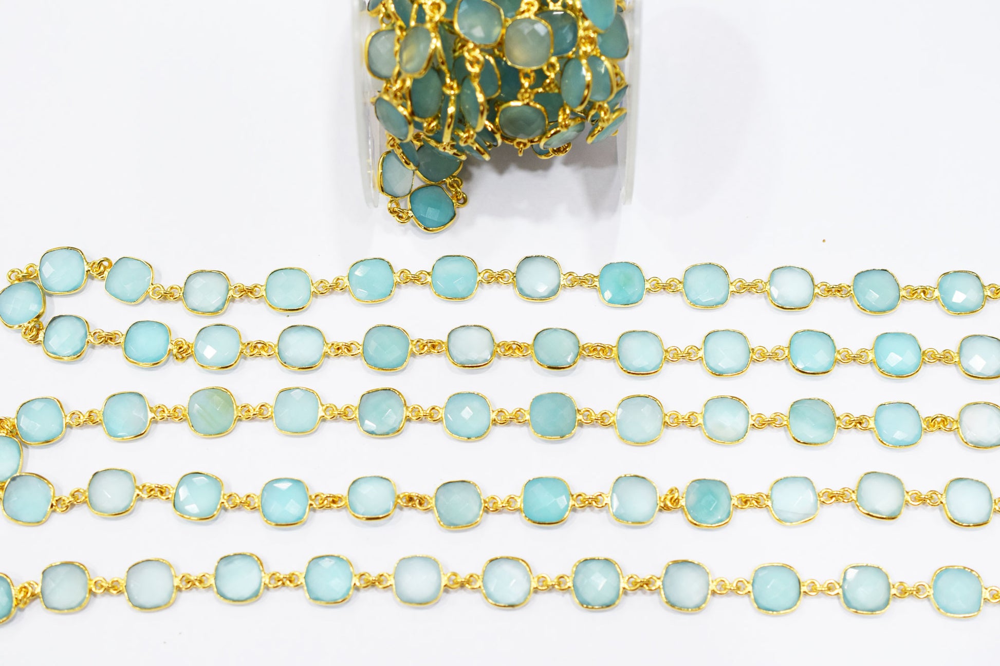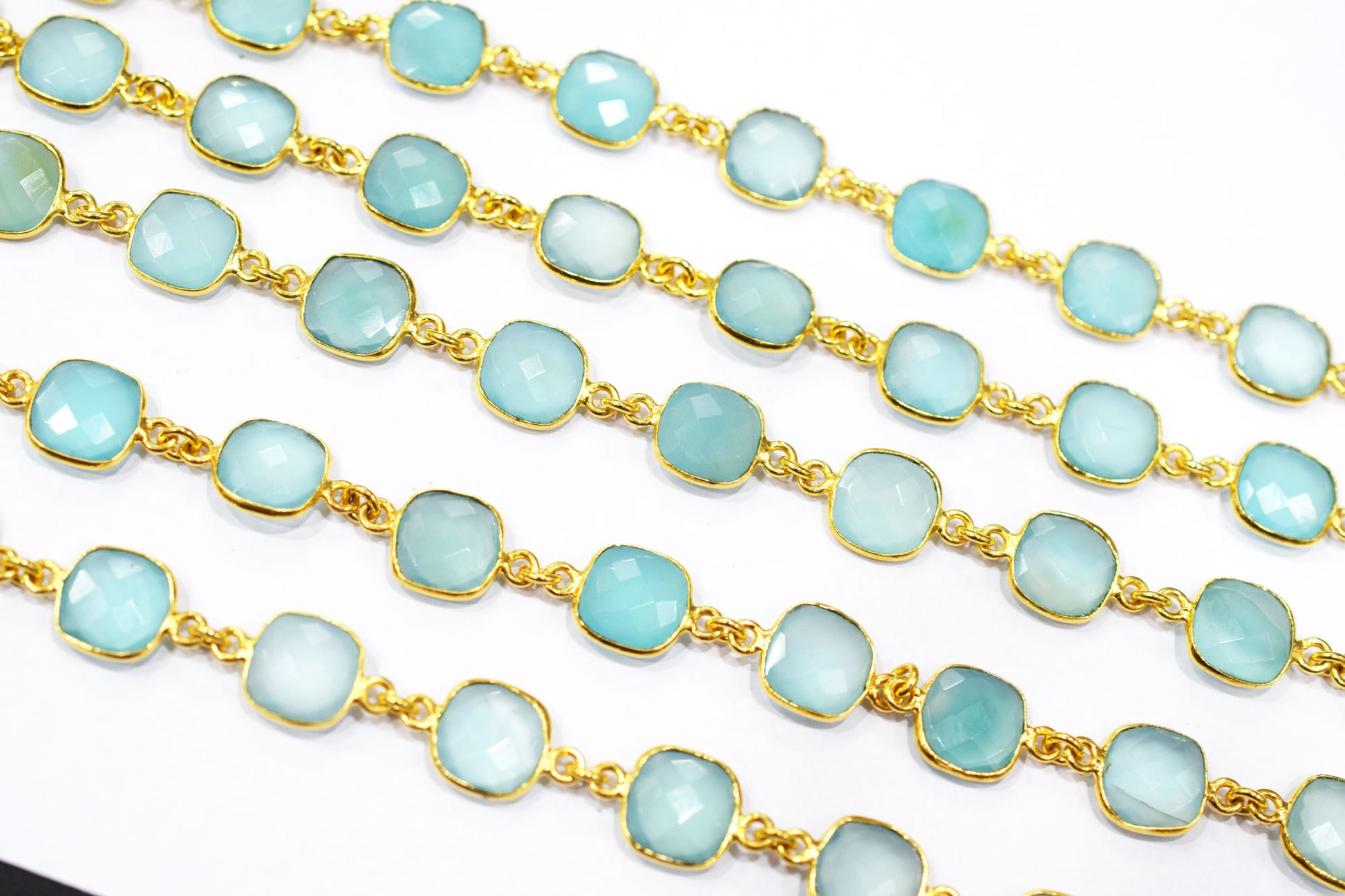 Aqua Chalcedony Faceted Cushion Shape Connector Chain , Aqua Chalcedony Cushion Shape Bezel Link ChainΒ , 12x12 mm , RB-6589