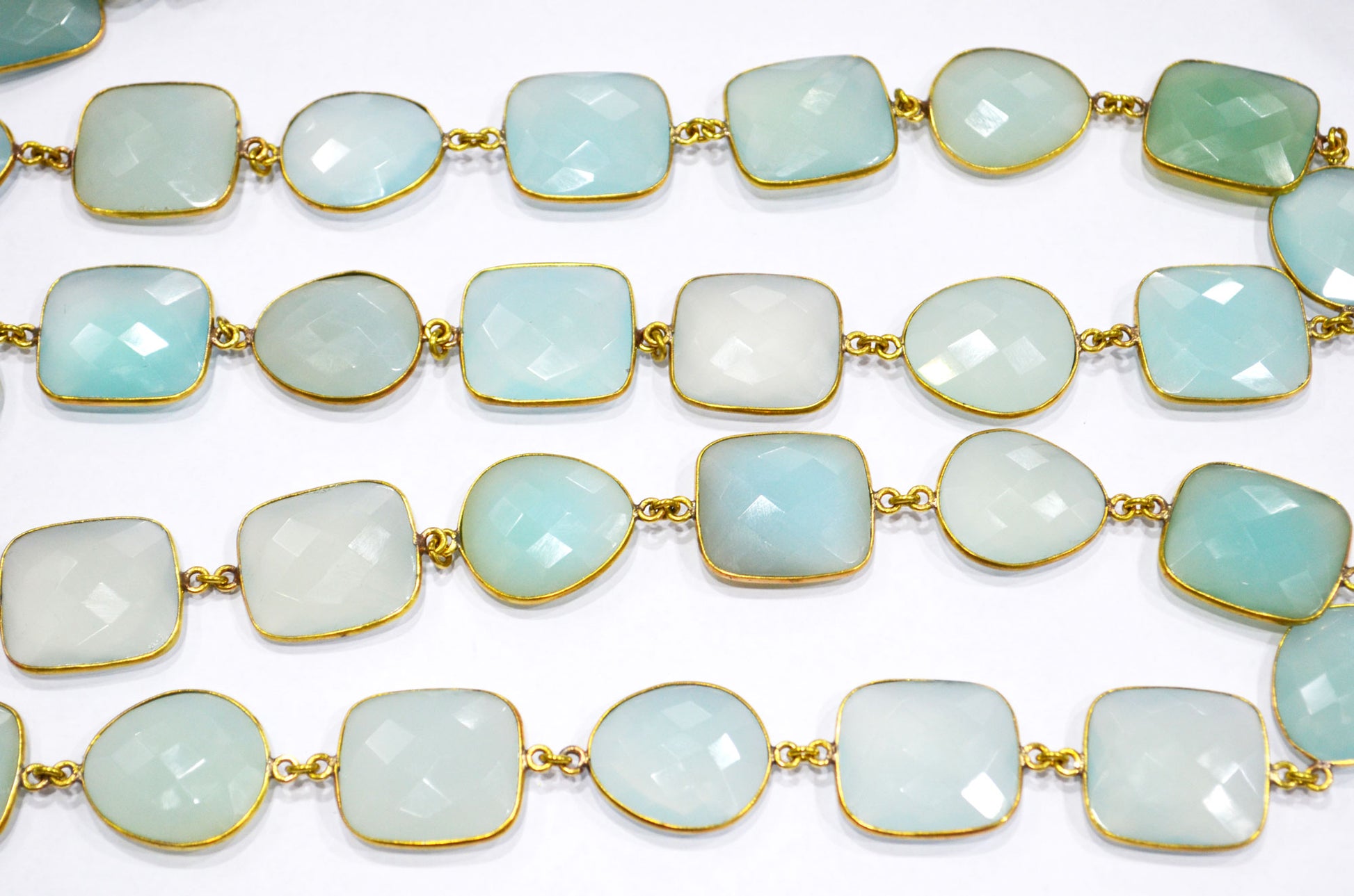 Aqua Chalcedony Faceted Cushion Shape Connector Chain , Aqua Chalcedony Egg Shape Bezel Link Chain , 22 - 24 mm , RB-5848