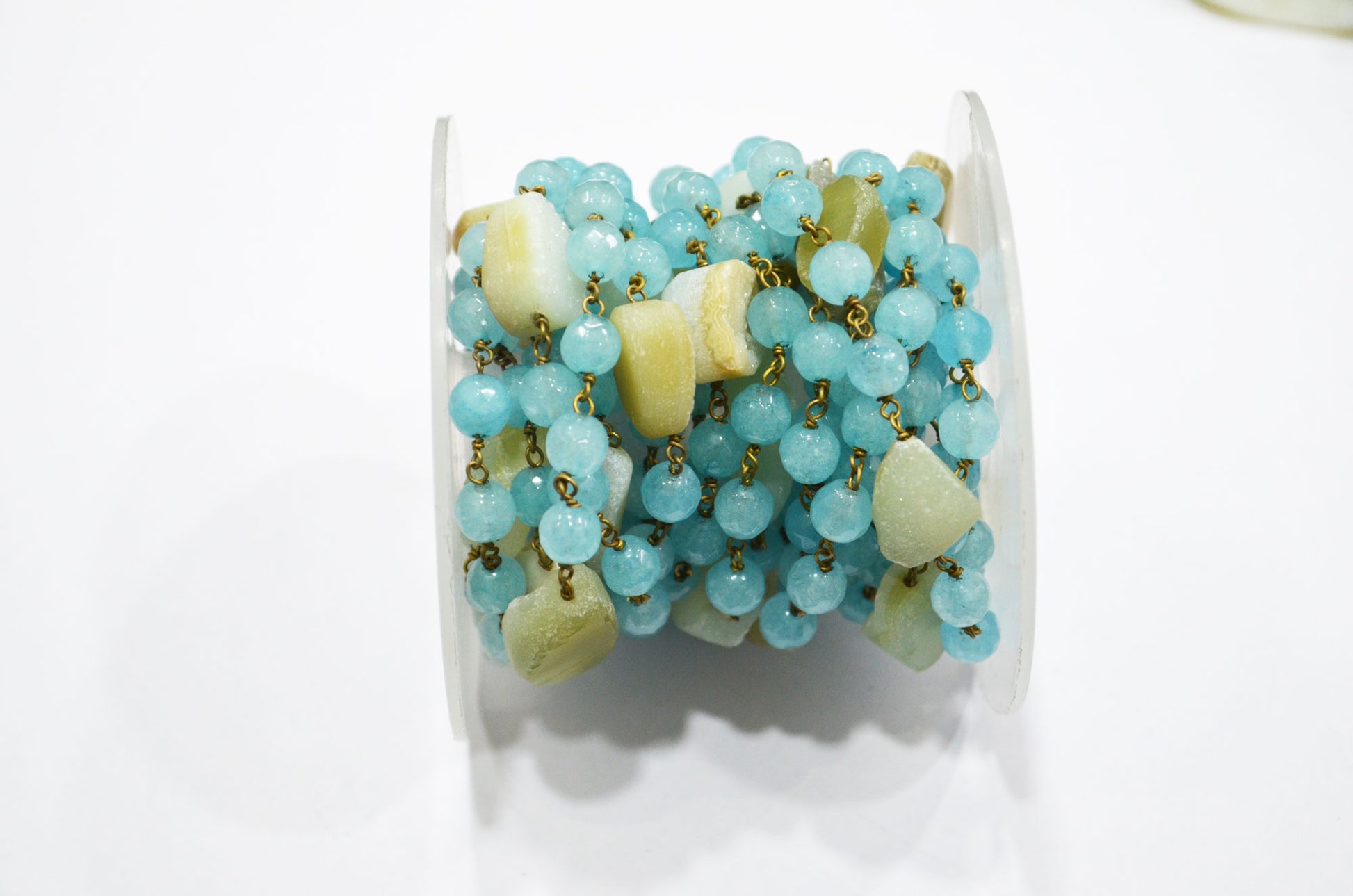 Aqua Chalcedony Faceted Round Shape Rosary Beaded Chain , Aqua Druzy Tumble Shape Wire Wrapped Chain , 6 mm , RB-6001