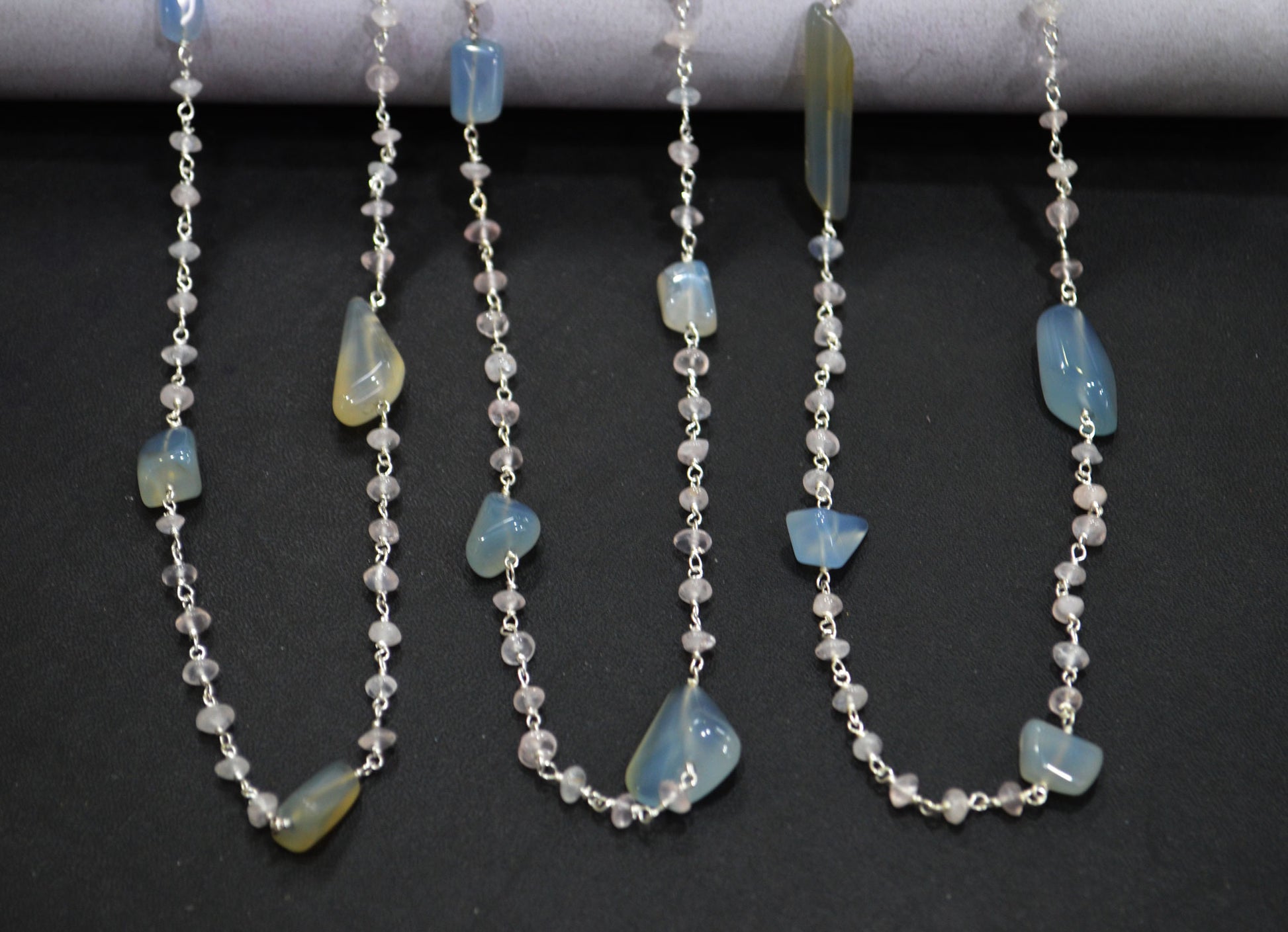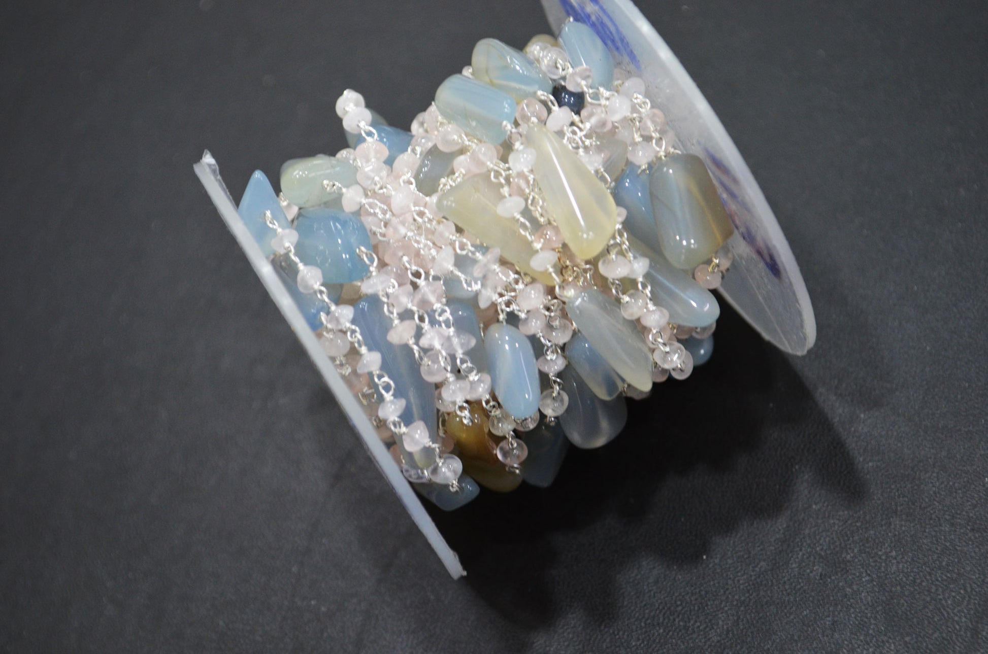 Aqua Chalcedony Smooth Nuggets Shape Rosary Beaded Chain , Rose Quartz Button Shape Wire Wrapped Chain , 3 - 4 mm , RB-6002