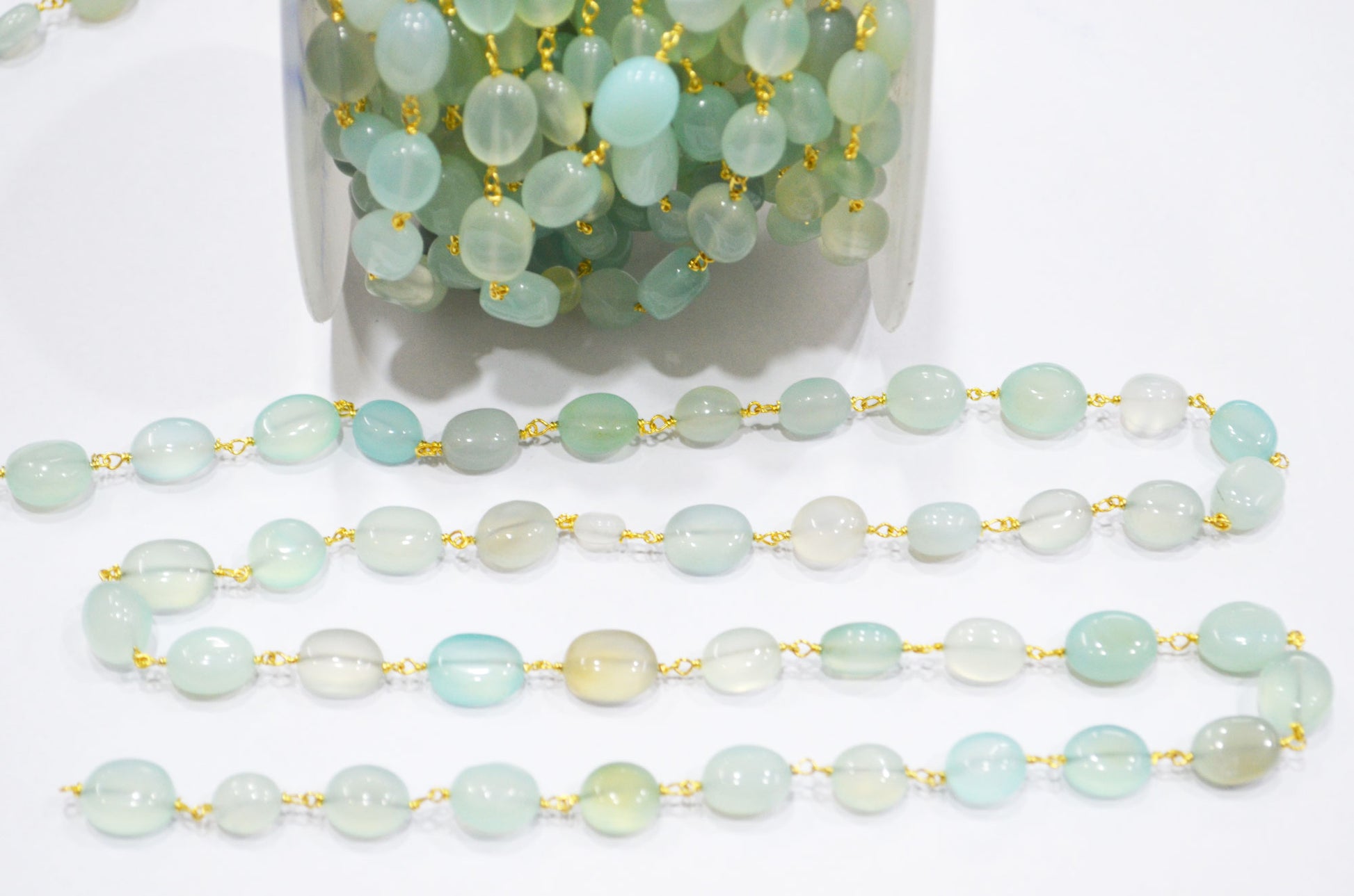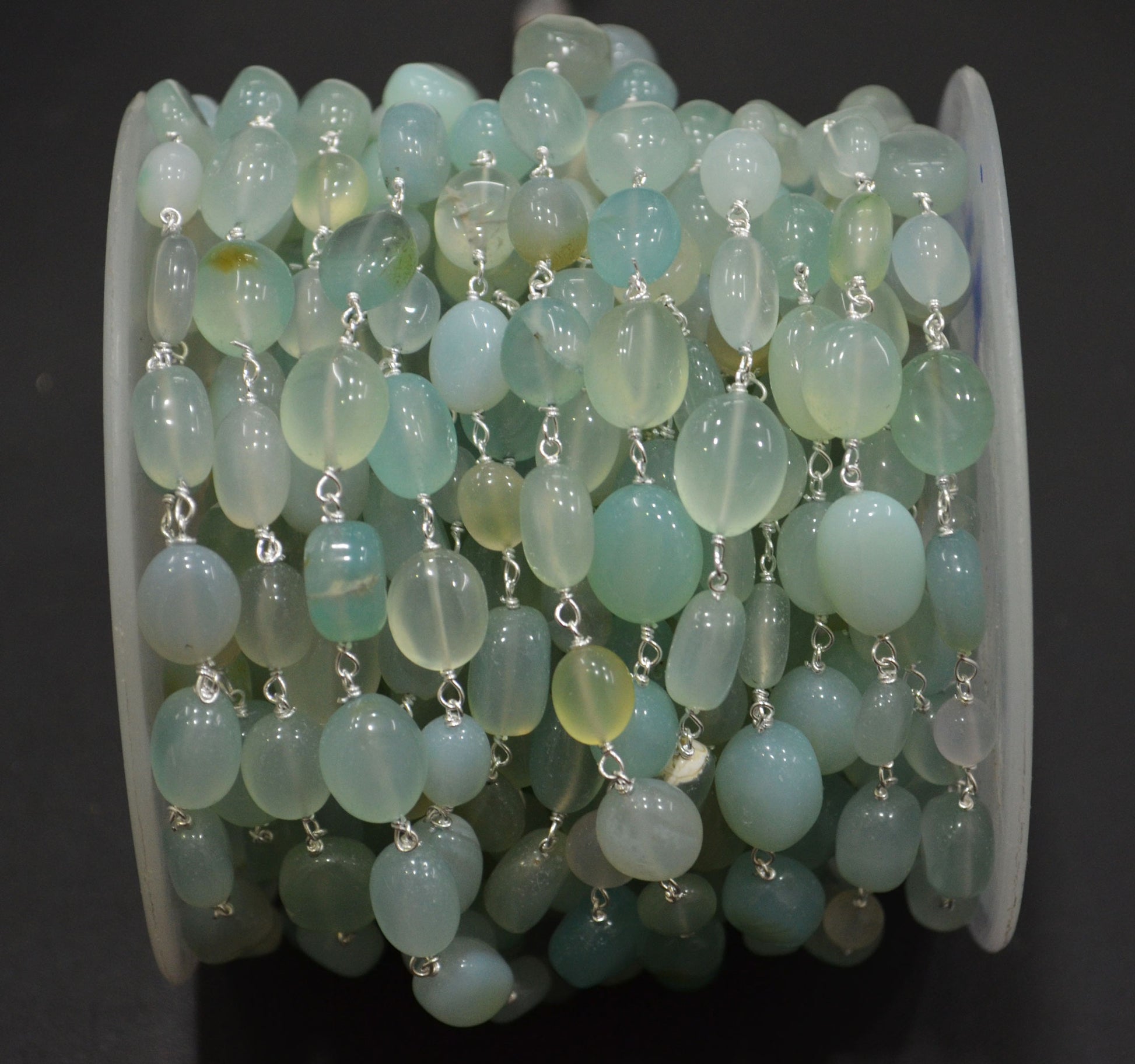 Aqua Chalcedony Smooth Oval Nuggets Rosary Beaded Chain , Aqua Chalcedony Wire Wrapped Chain , 7x8 - 9x11 mm , 6811