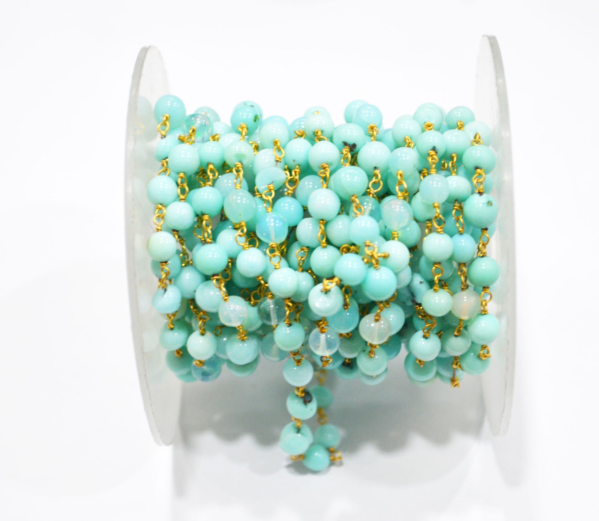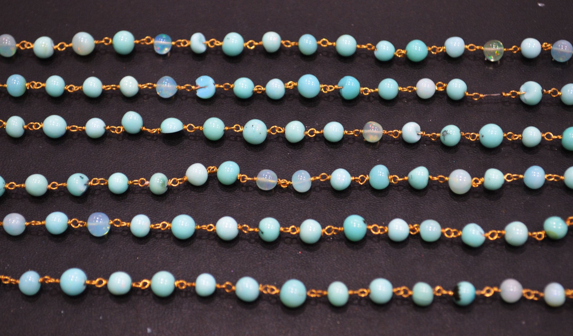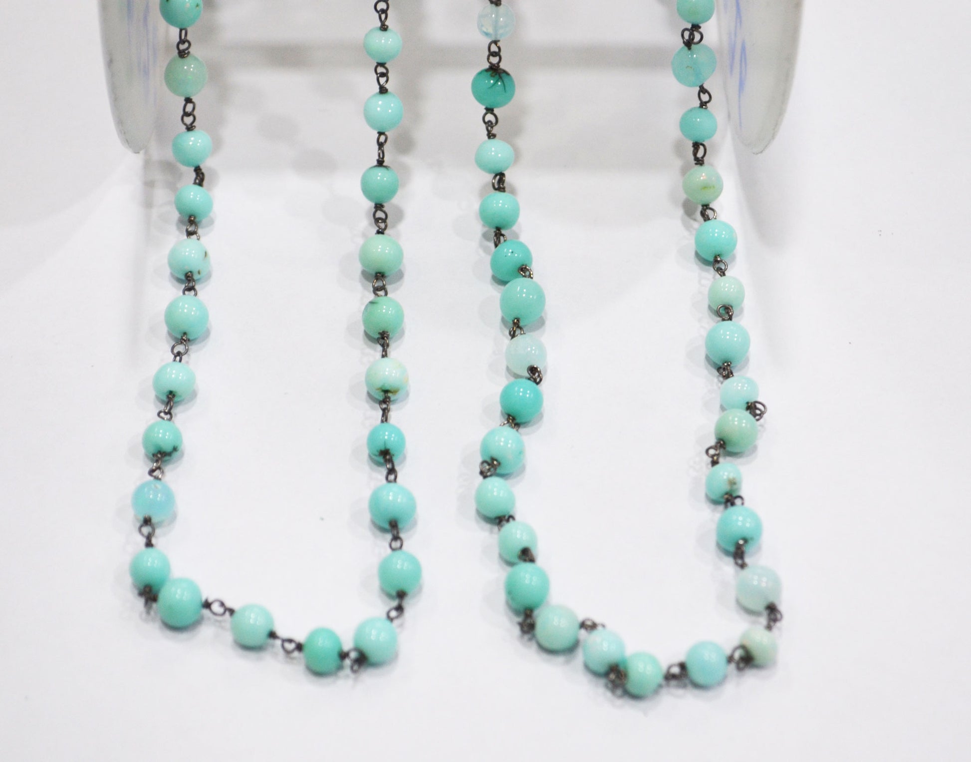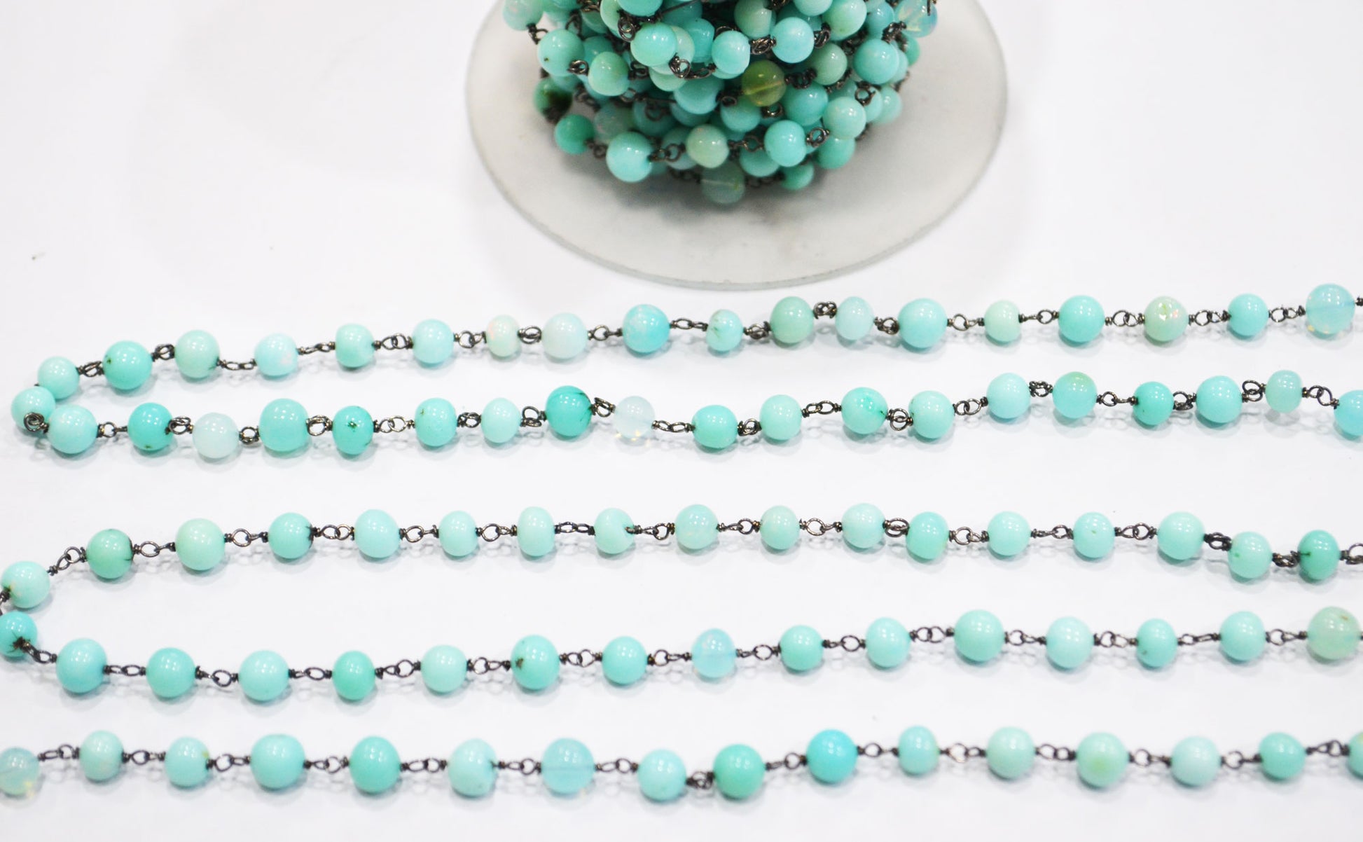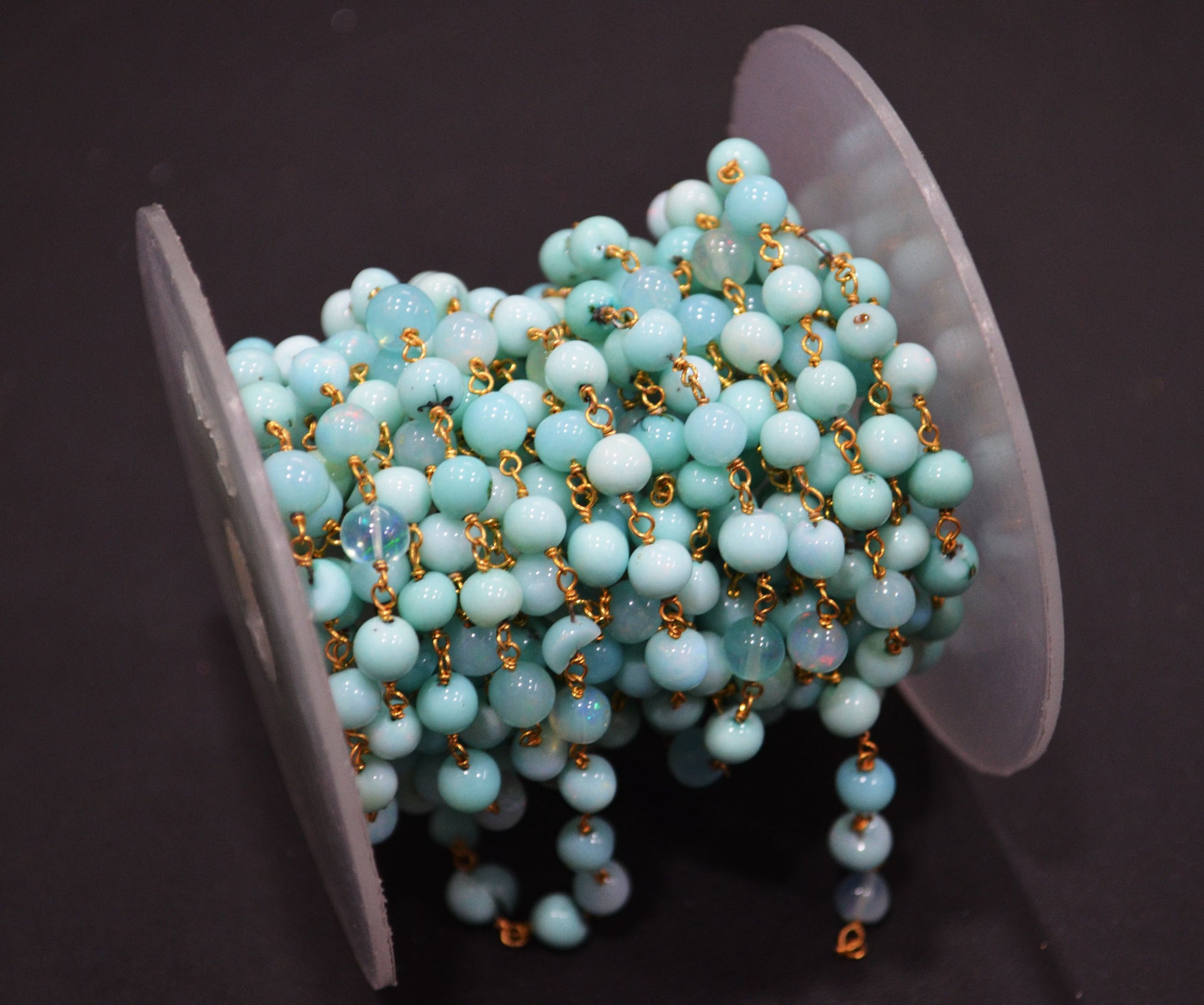 Aqua Ethiopian Opal Smooth Round Shape Rosary Beaded Chain , Aqua Ethiopian Opal Wire Wrapped Chain , 5 - 6 mm , 6704