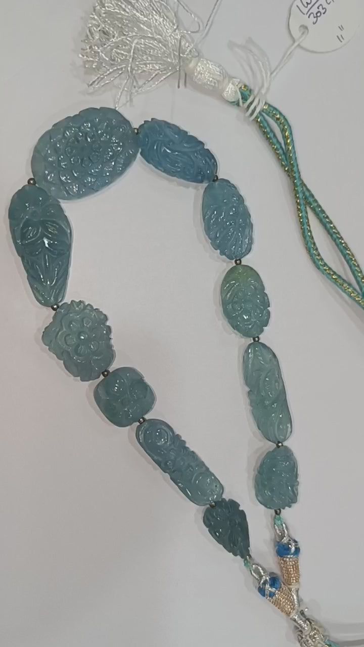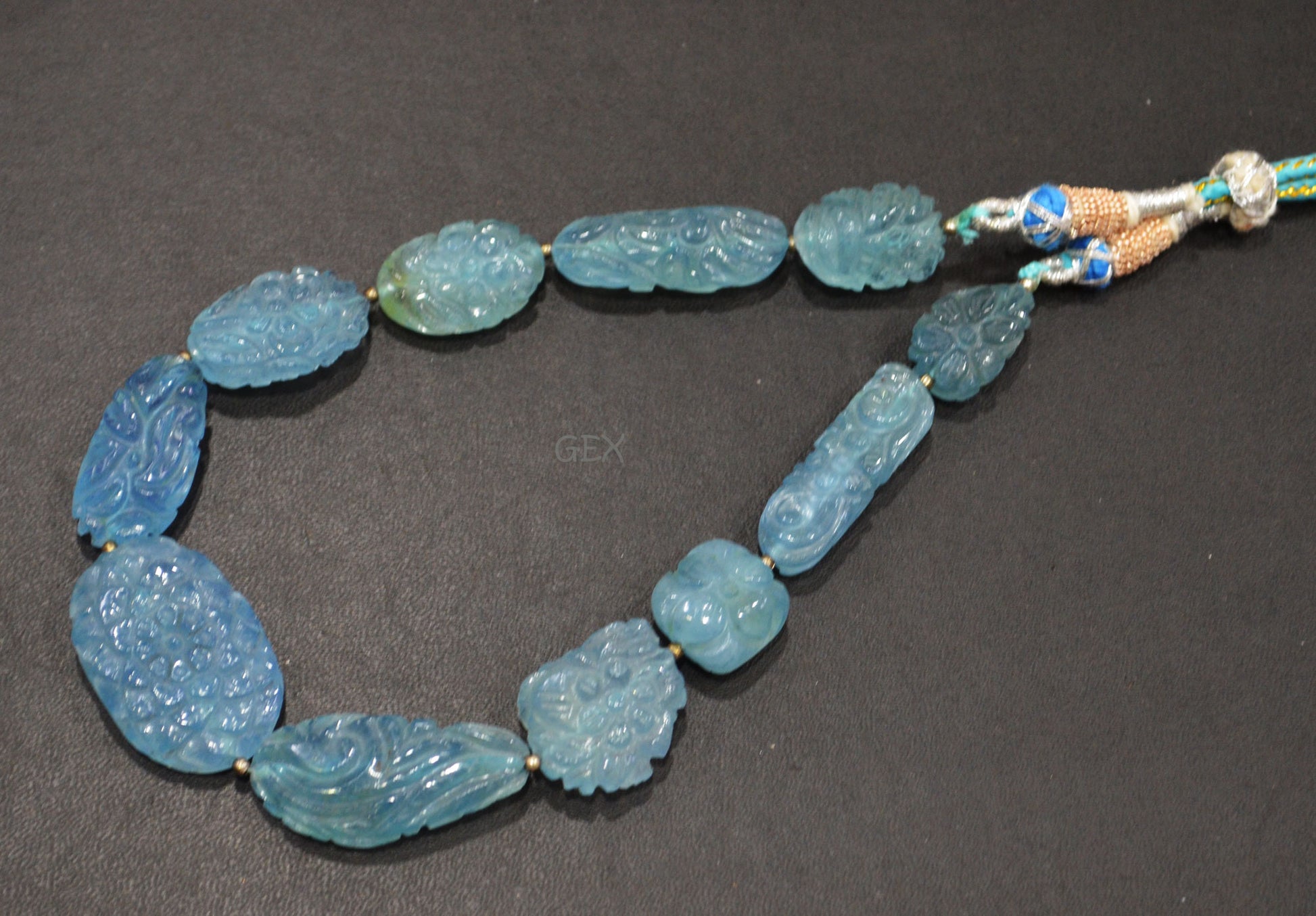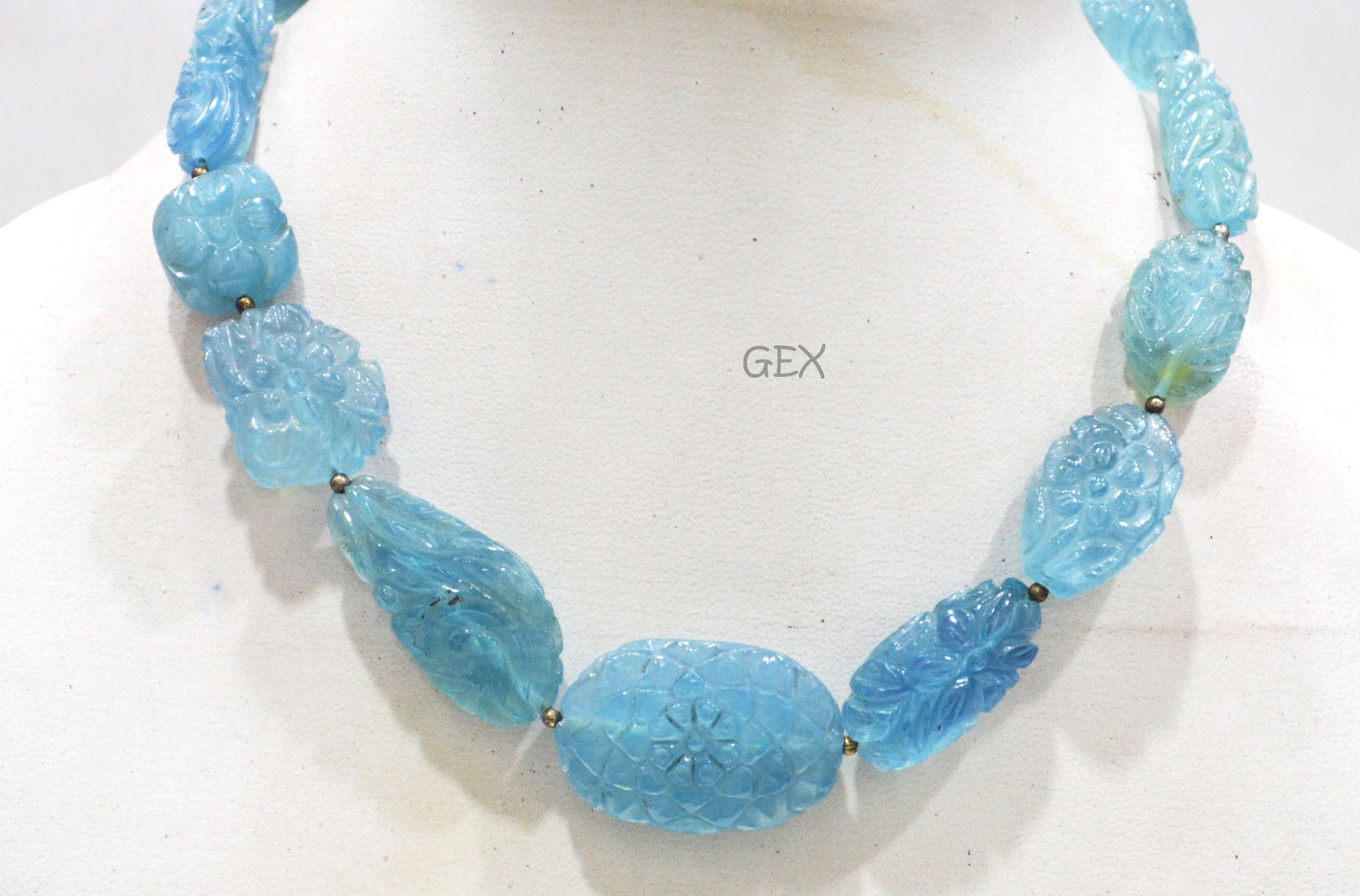 Aquamarine Carved Nuggets Shape Necklace , Aquamarine 1 Line Necklace 11 Inches Long With Adjustable Tussle , 13x19 - 22x32 mm , 31885