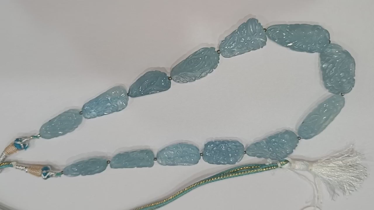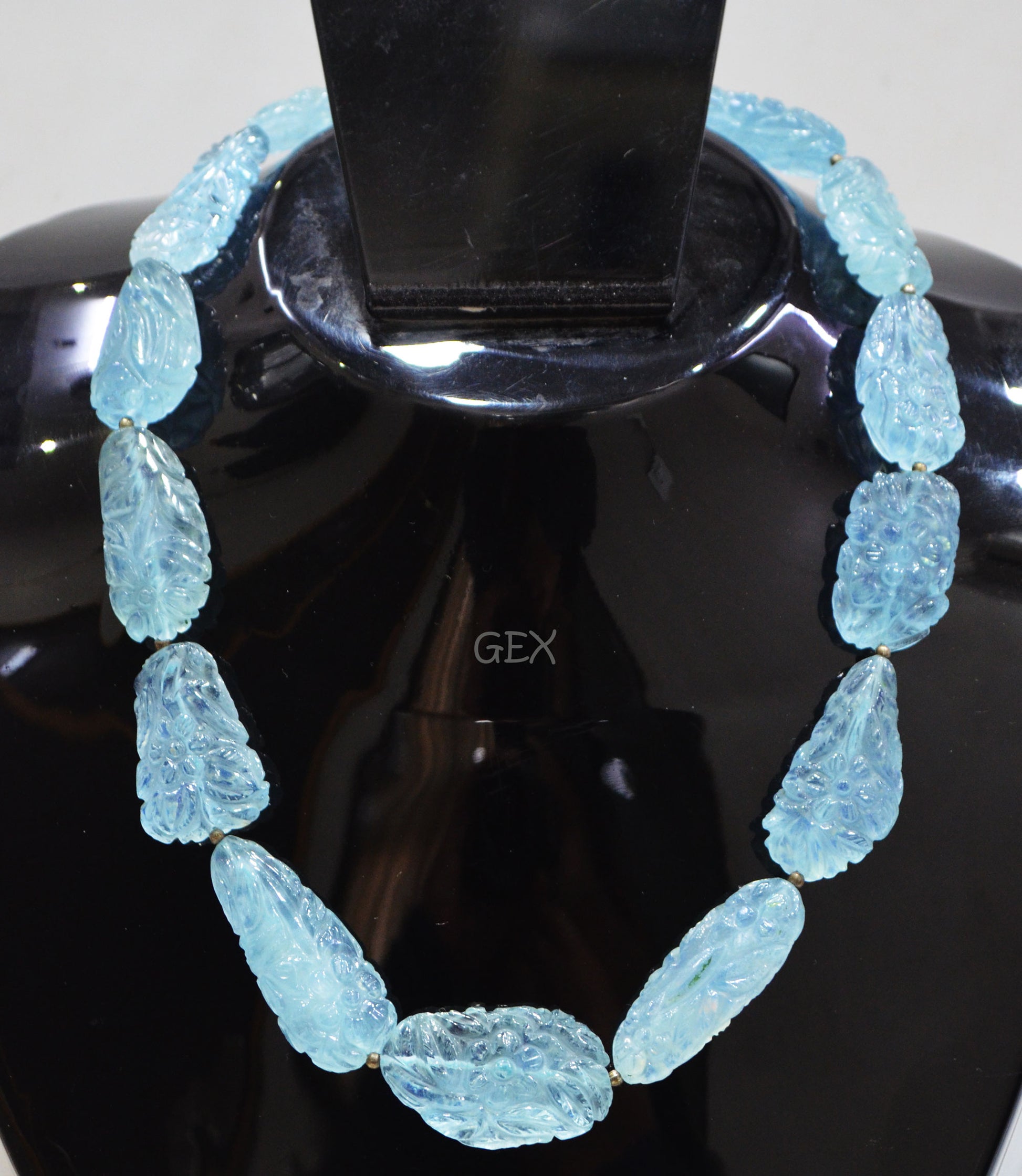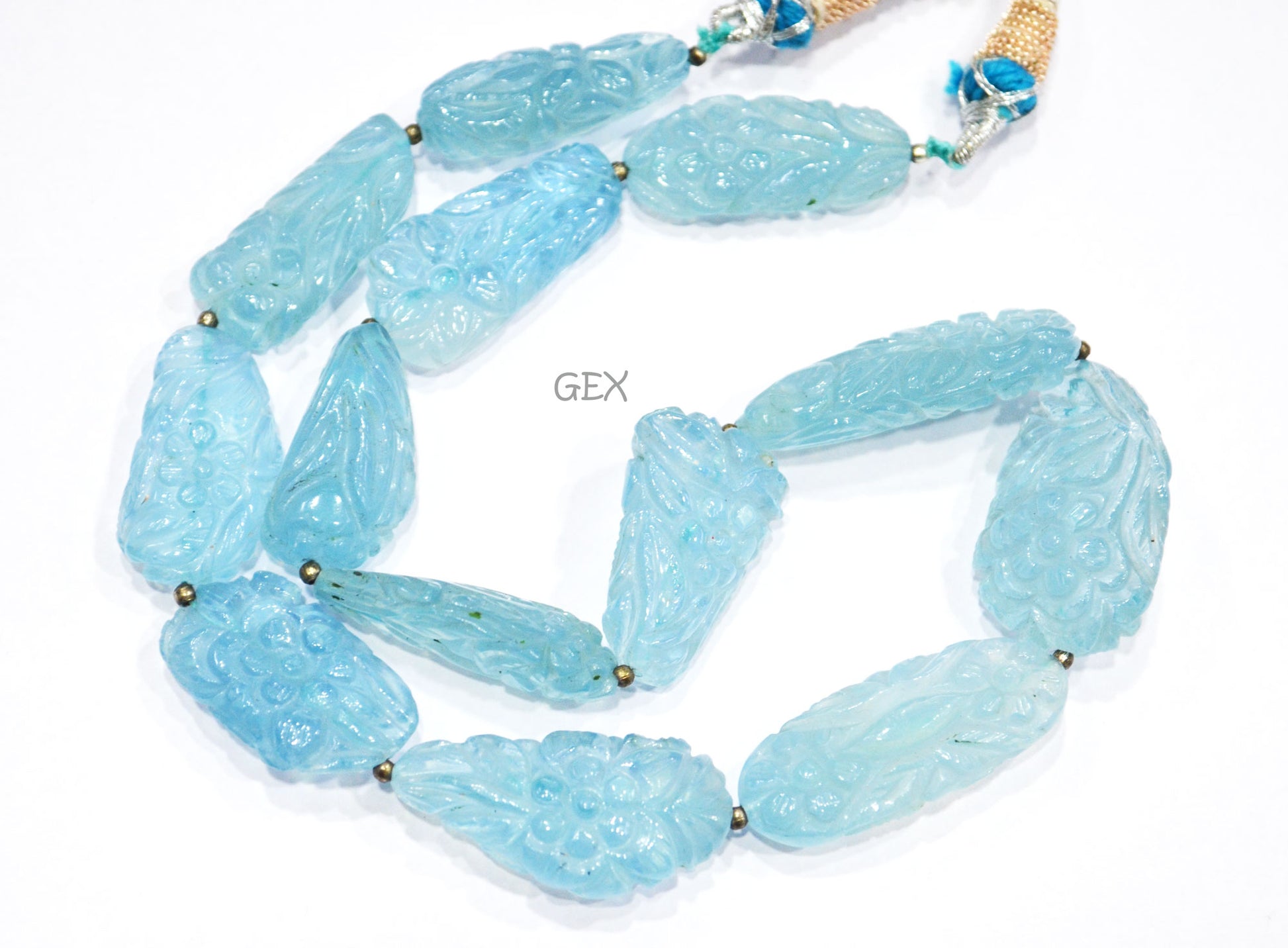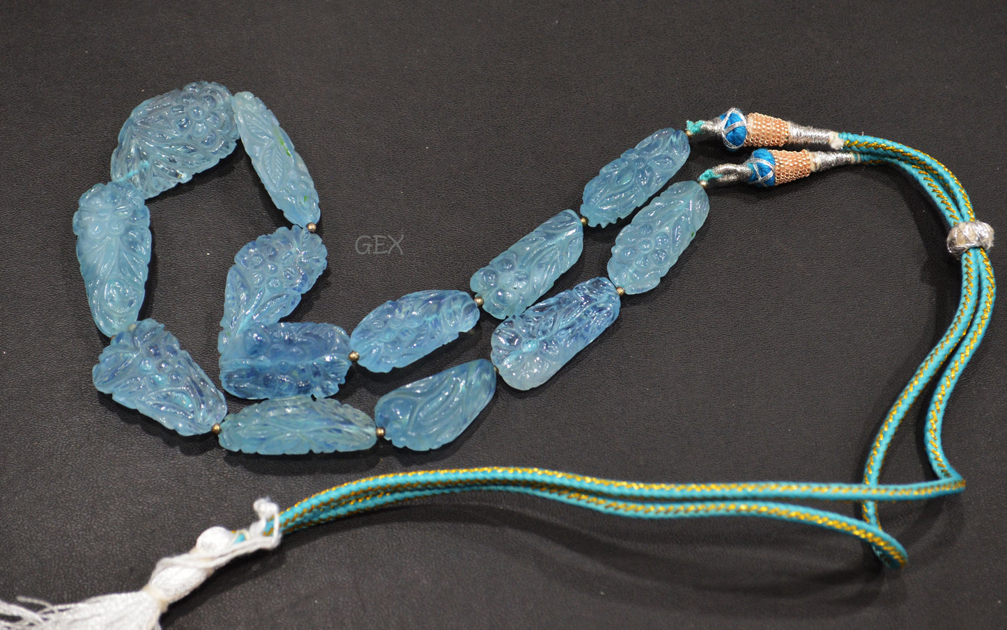Aquamarine Carved Nuggets Shape Necklace , Aquamarine 1 Line Necklace 15.5 Inches Long With Adjustable Tussle , 16x26 - 20x41 mm , 31891