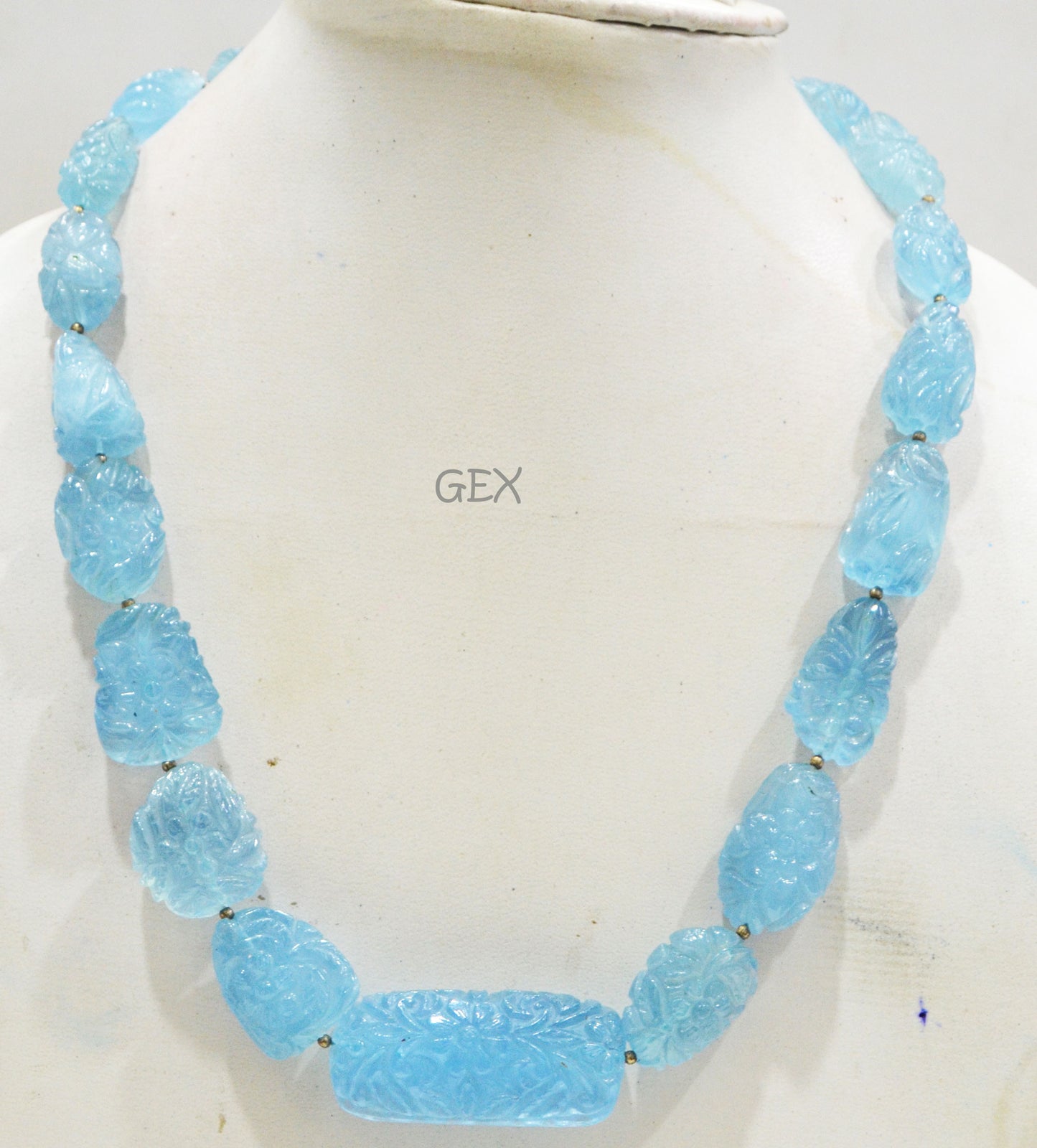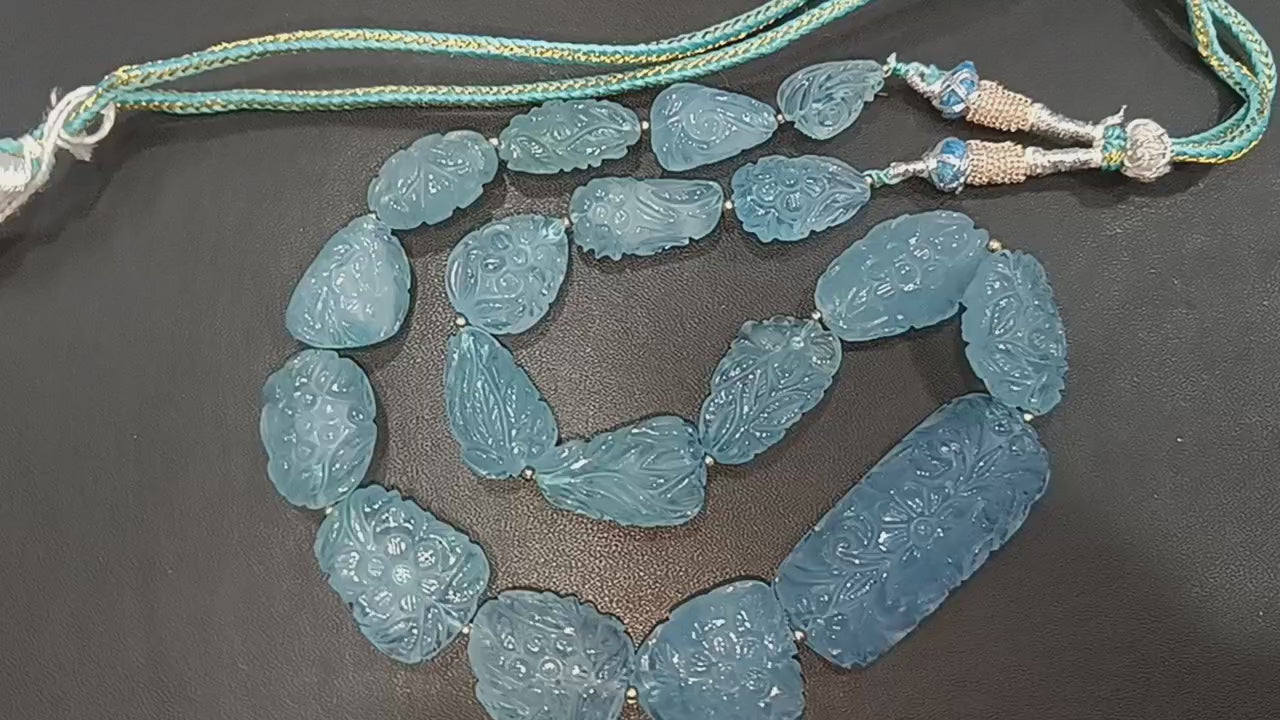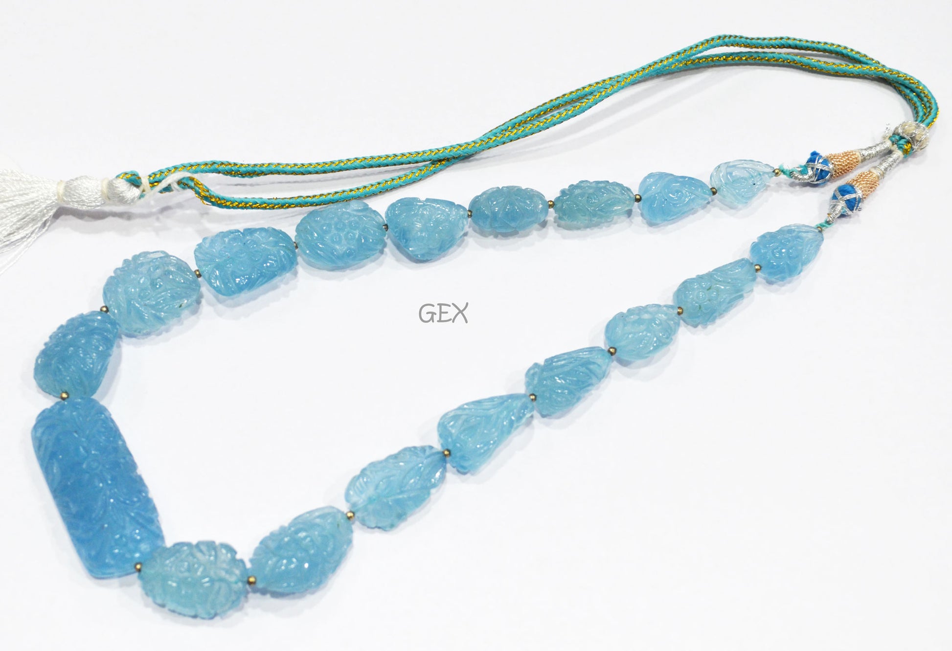 Aquamarine Carved Nuggets Shape Necklace , Aquamarine 1 Line Necklace 17 Inches Long With Adjustable Tussle , 13x18 - 21x46 mm , 31887