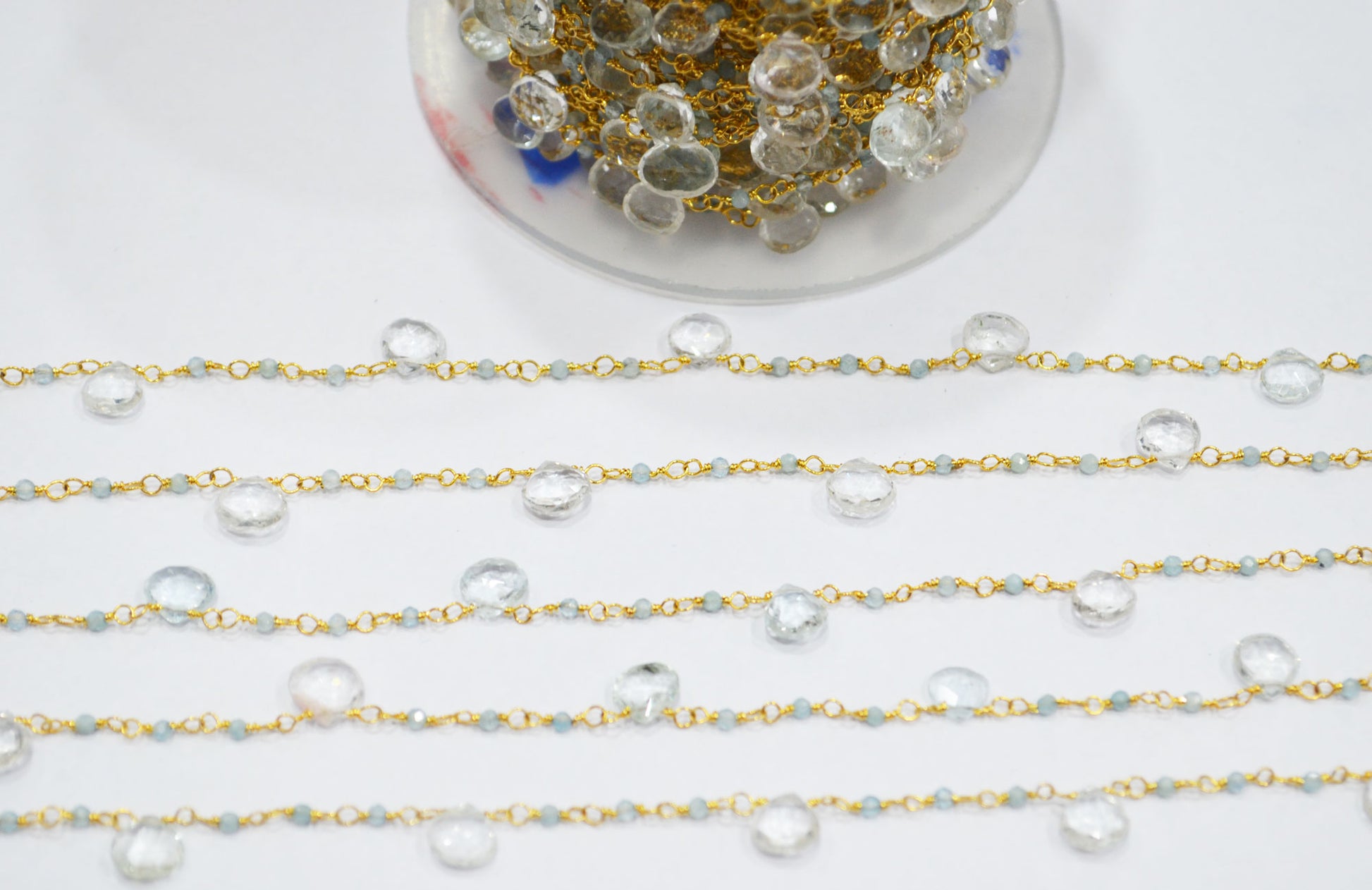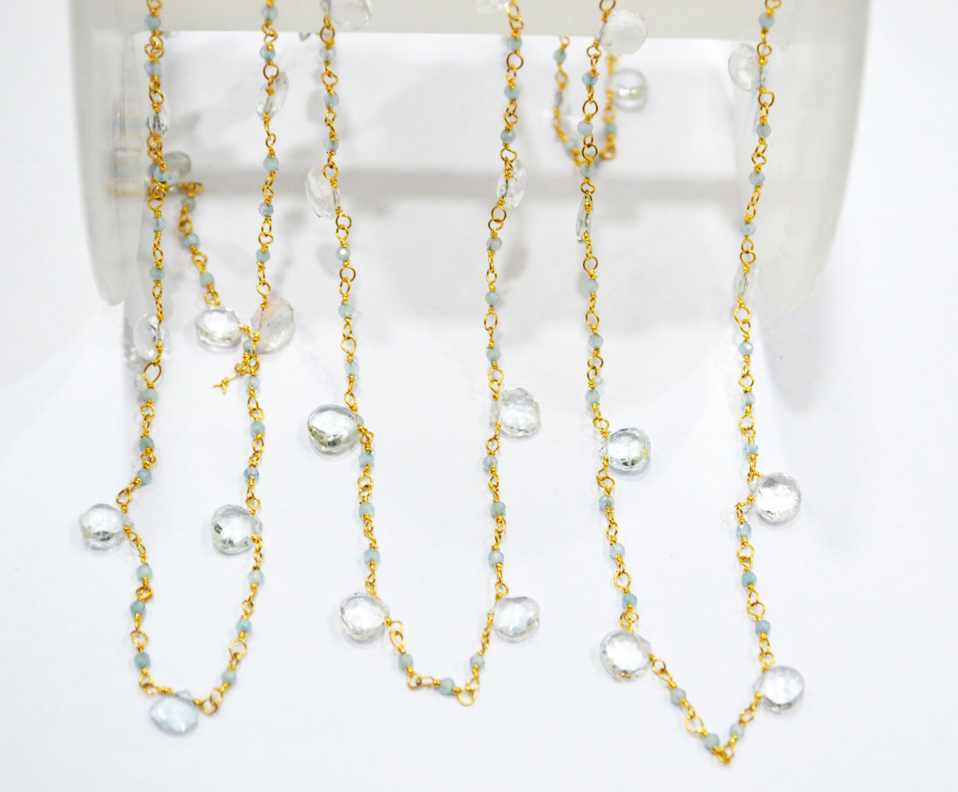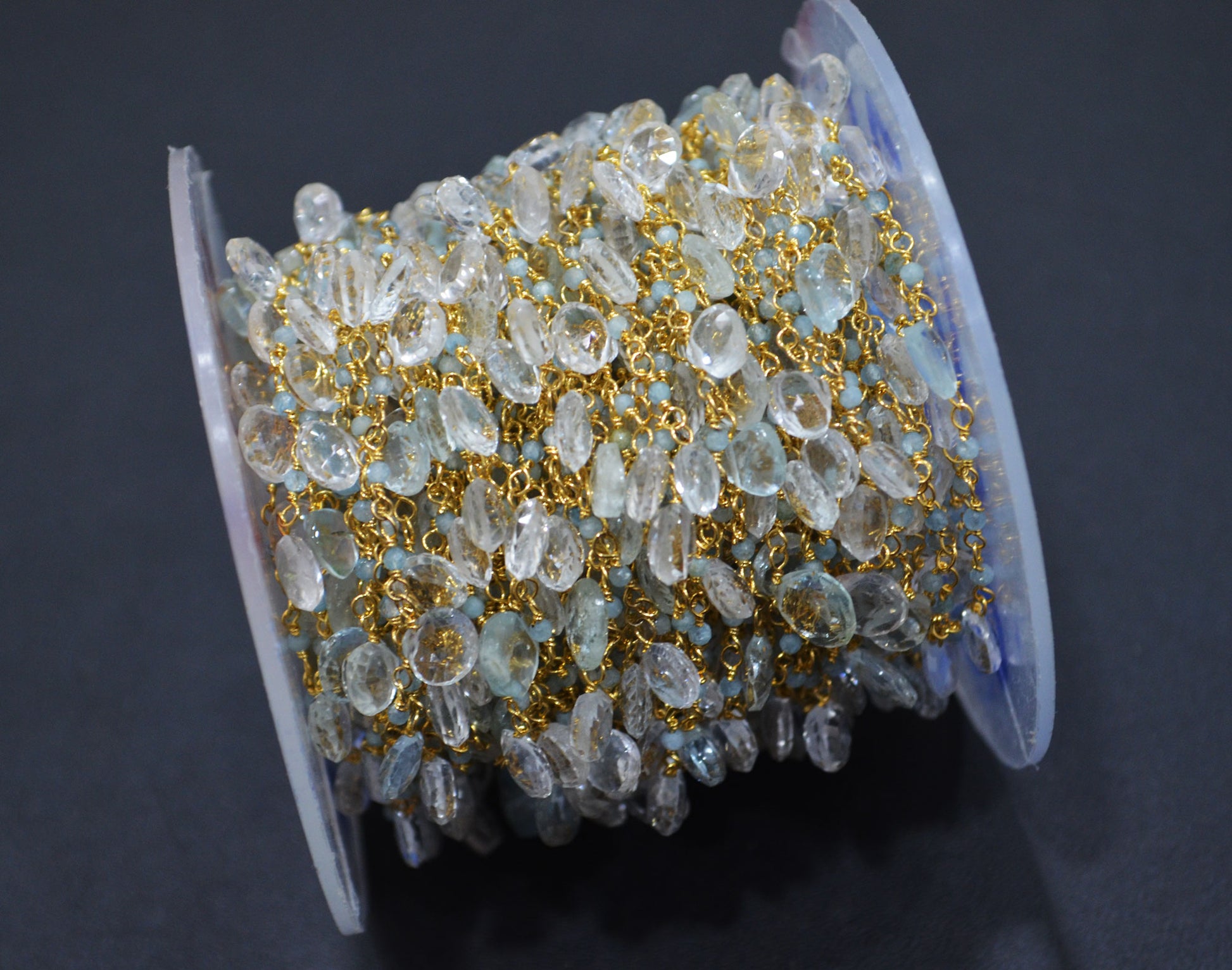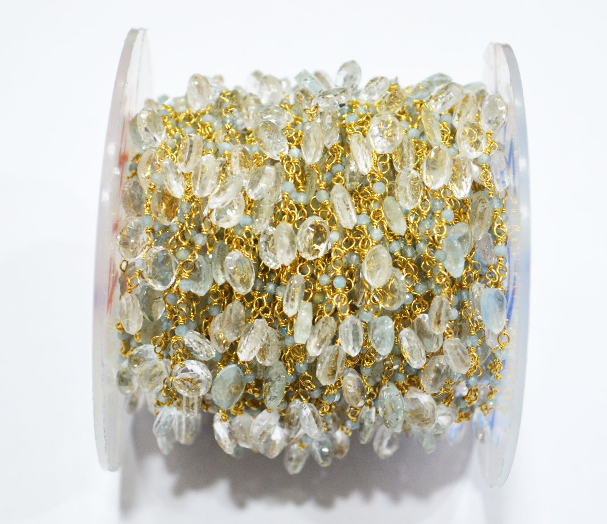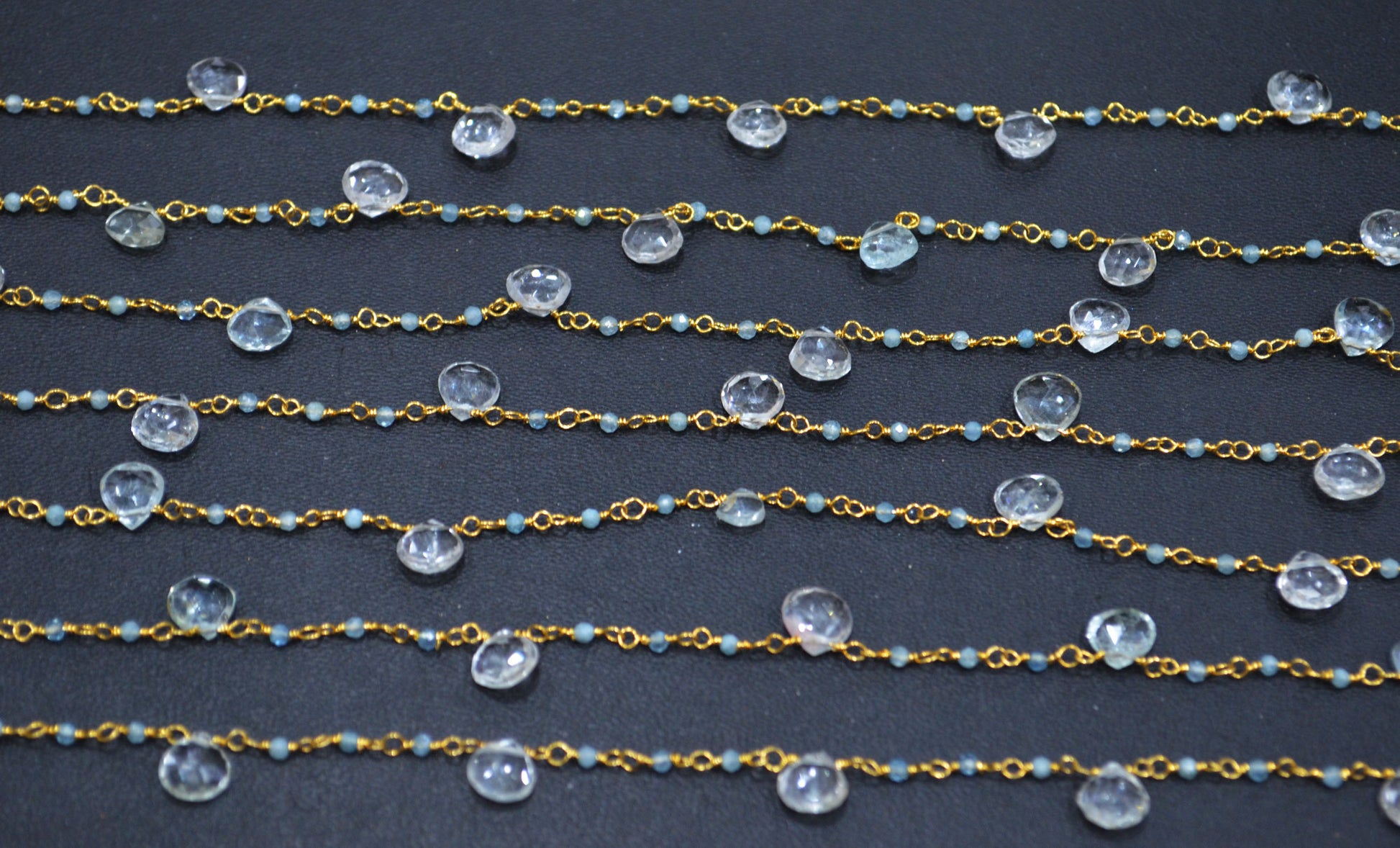 Aquamarine Faceted Round Shape Rosary Beaded Chain , Aquamarine Heart Shape Wire Wrapped Chain , 2 - 5 mm , 6717