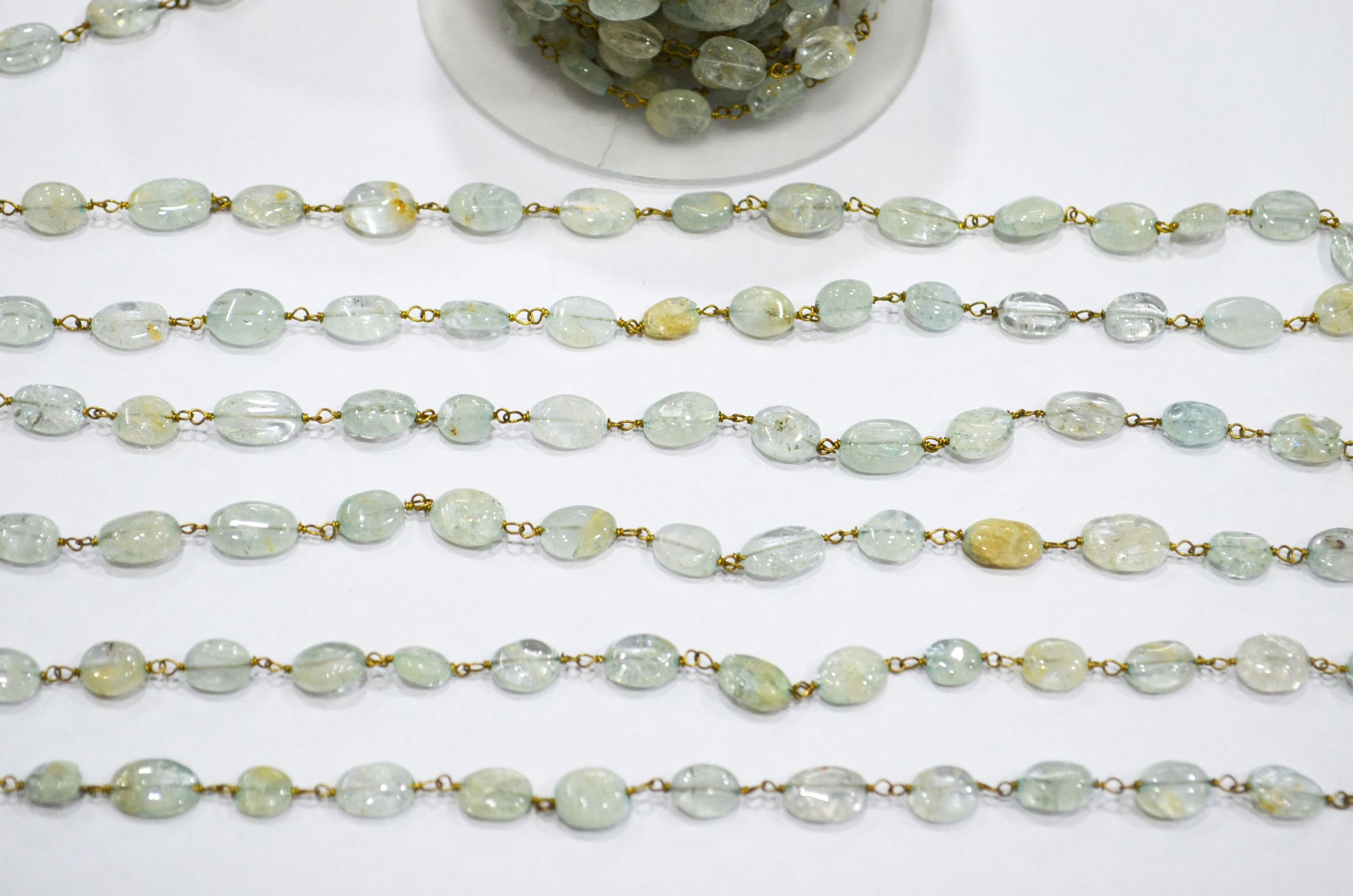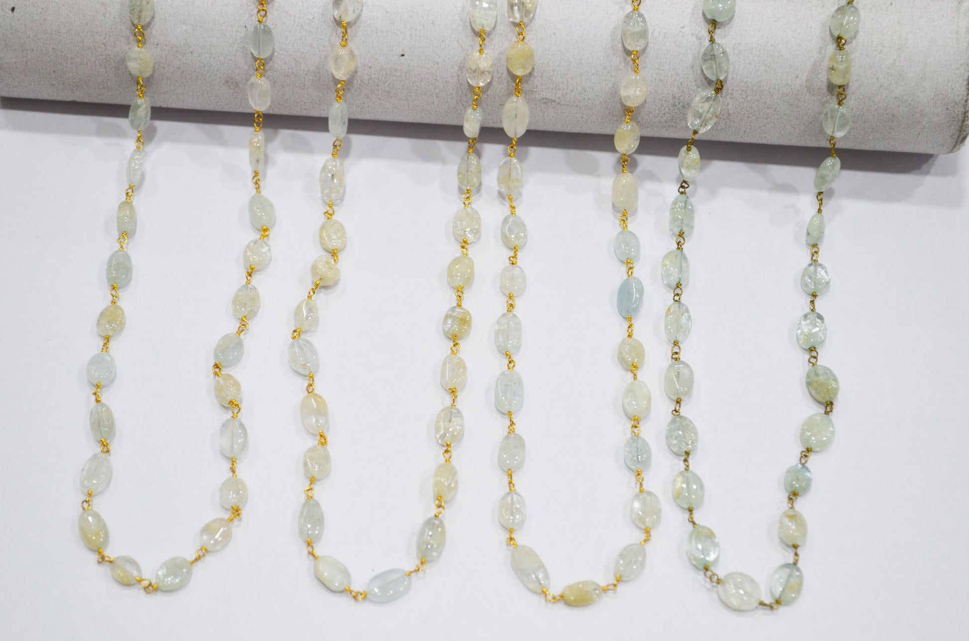 Aquamarine Smooth Oval Shape Rosary Beaded Chain , Aquamarine Wire Wrapped Chain , 7 - 10 mm , RB-5748