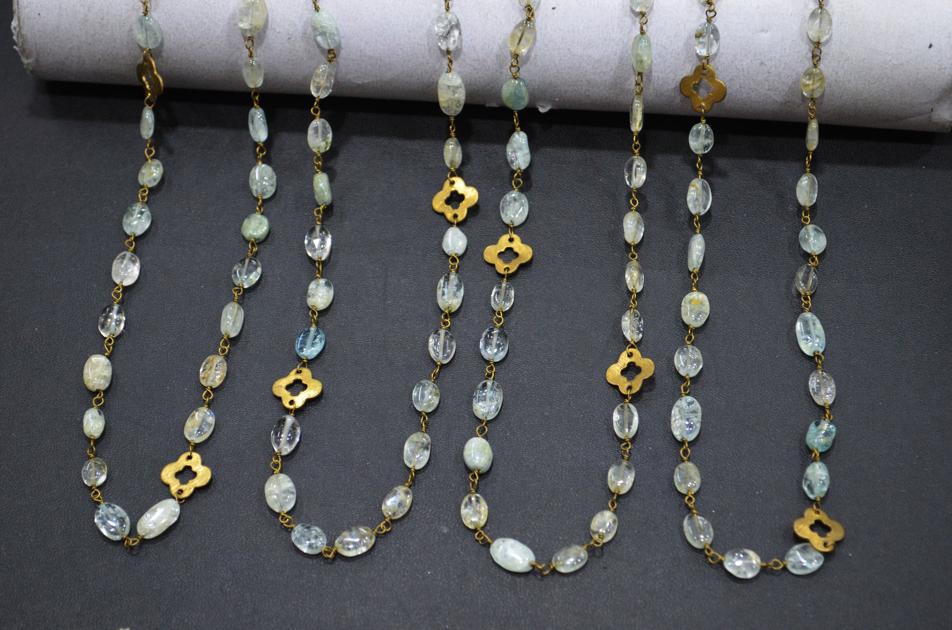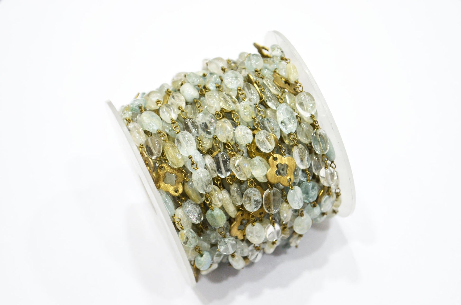 Aquamarine Smooth Oval Shape Rosary Beaded Chain , Aquamarine Oval With Quatrefoil Clover Wire Wrapped Chain , 6 - 9 mm , RB-5750