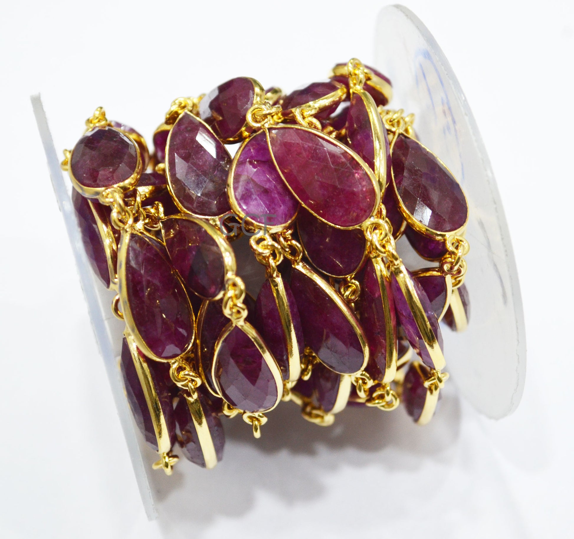 Beryl Ruby Faceted Pear Shape Connector Chain , Beryl Ruby Pear Shape Bezel Link Chain , 11x20 mm , 6824