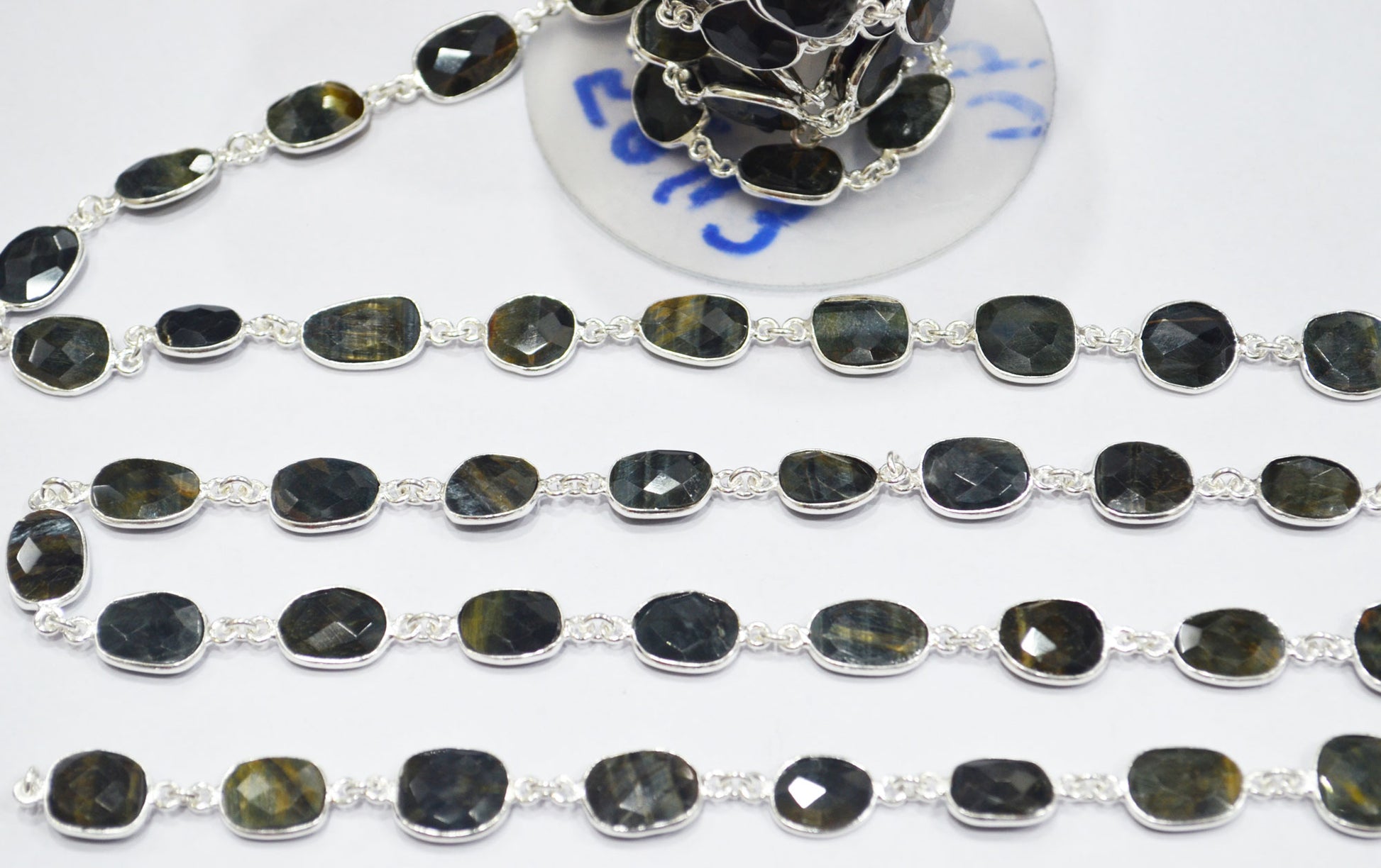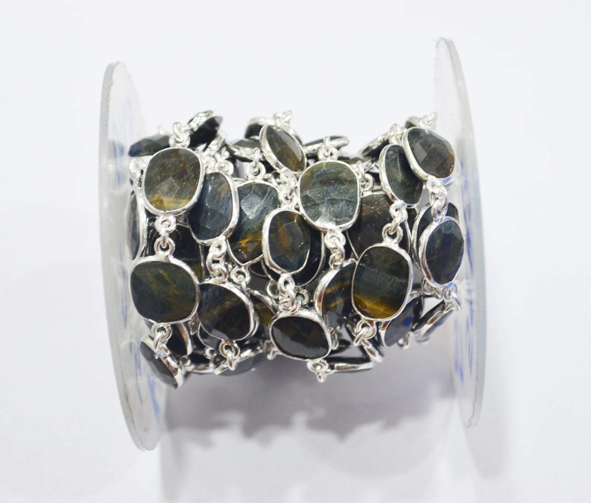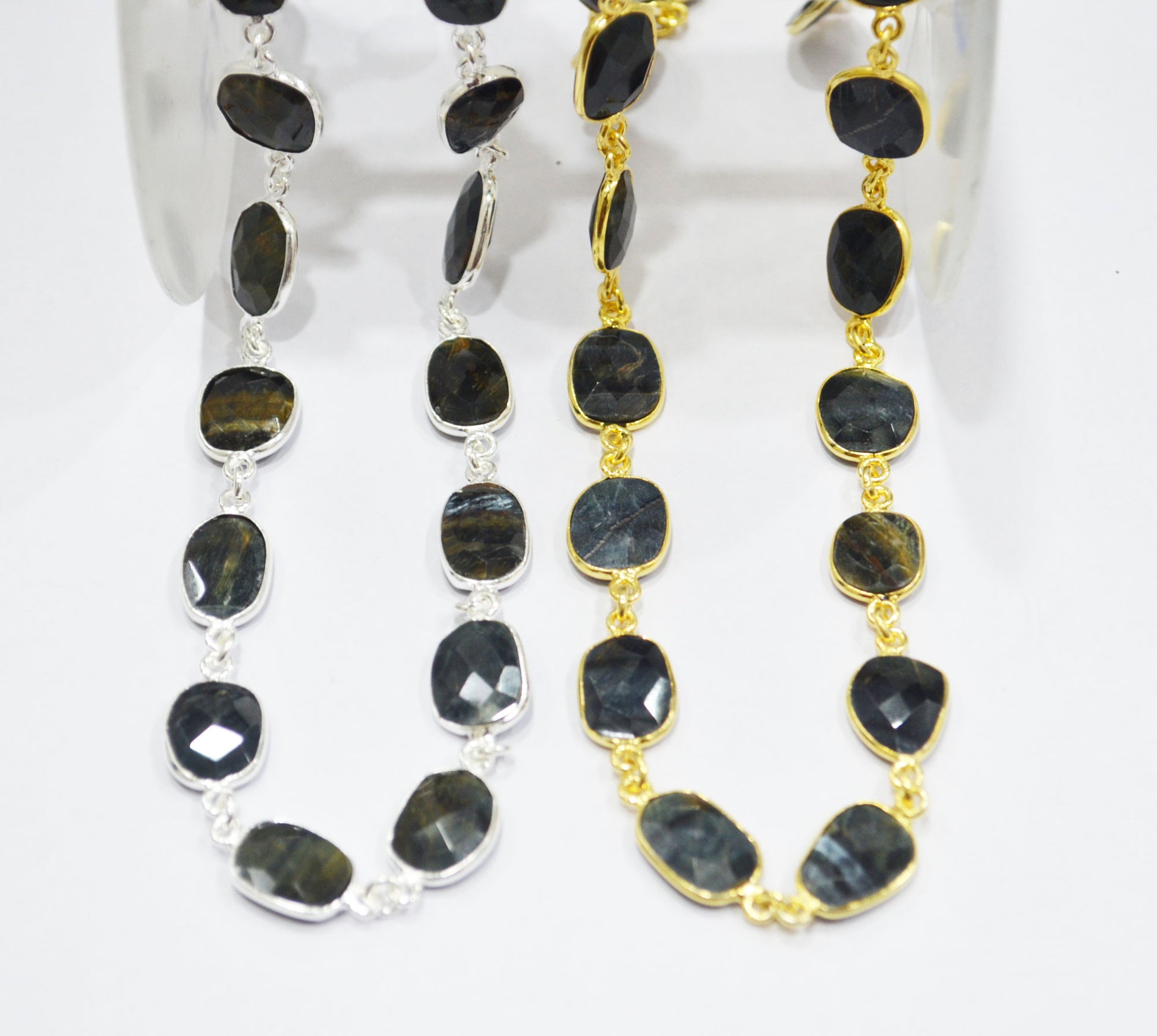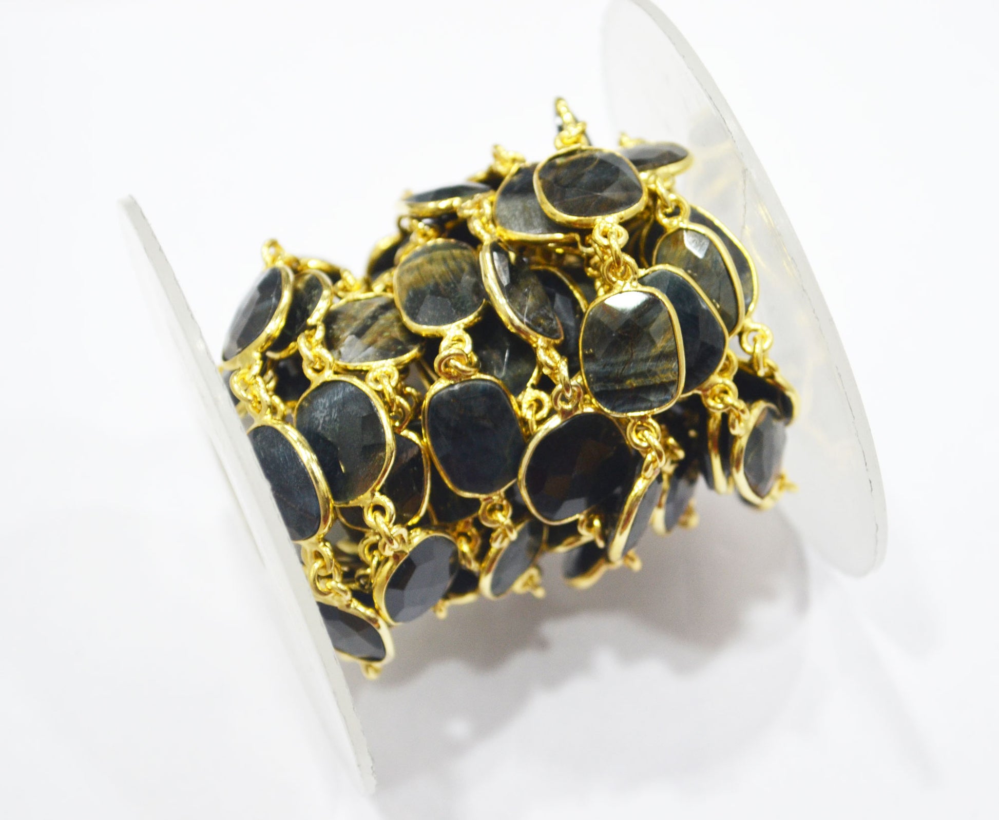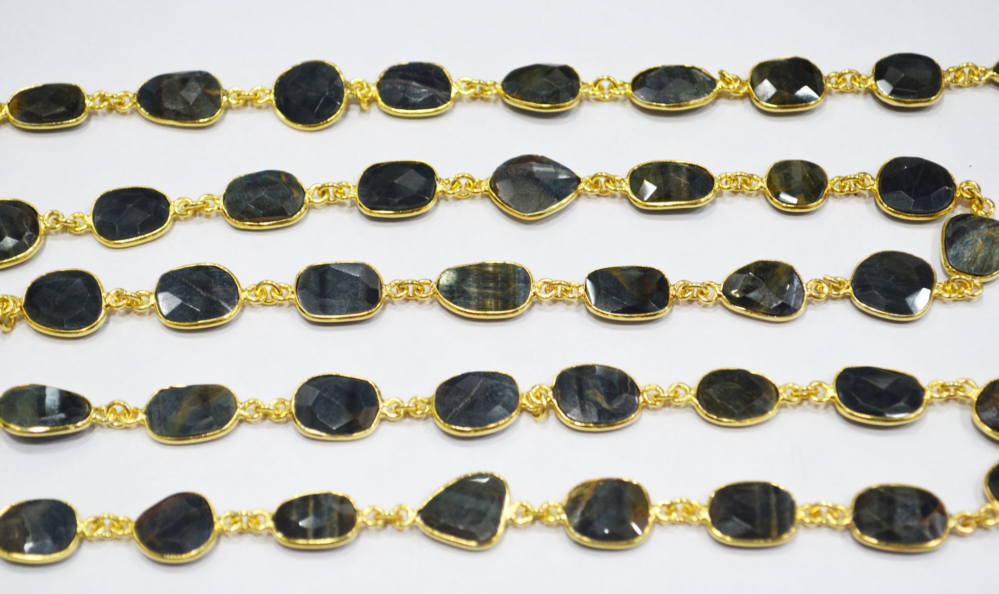 Black Iron Tiger Eye Slice Shape Connector Chain , Black Iron Tiger Eye Faceted Free Form Shape Bezel Link Chain , 11 - 14 mm , RB-6340