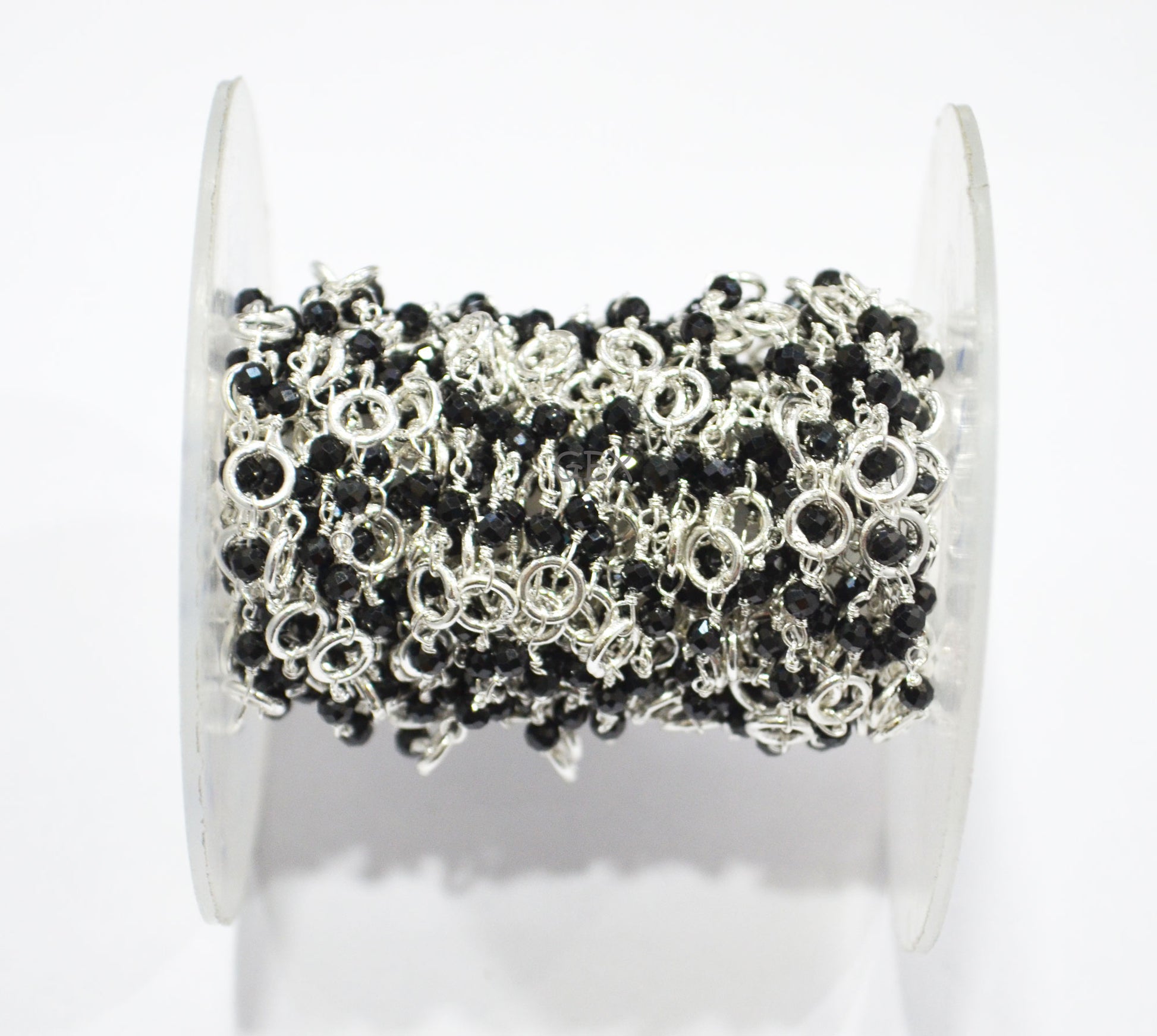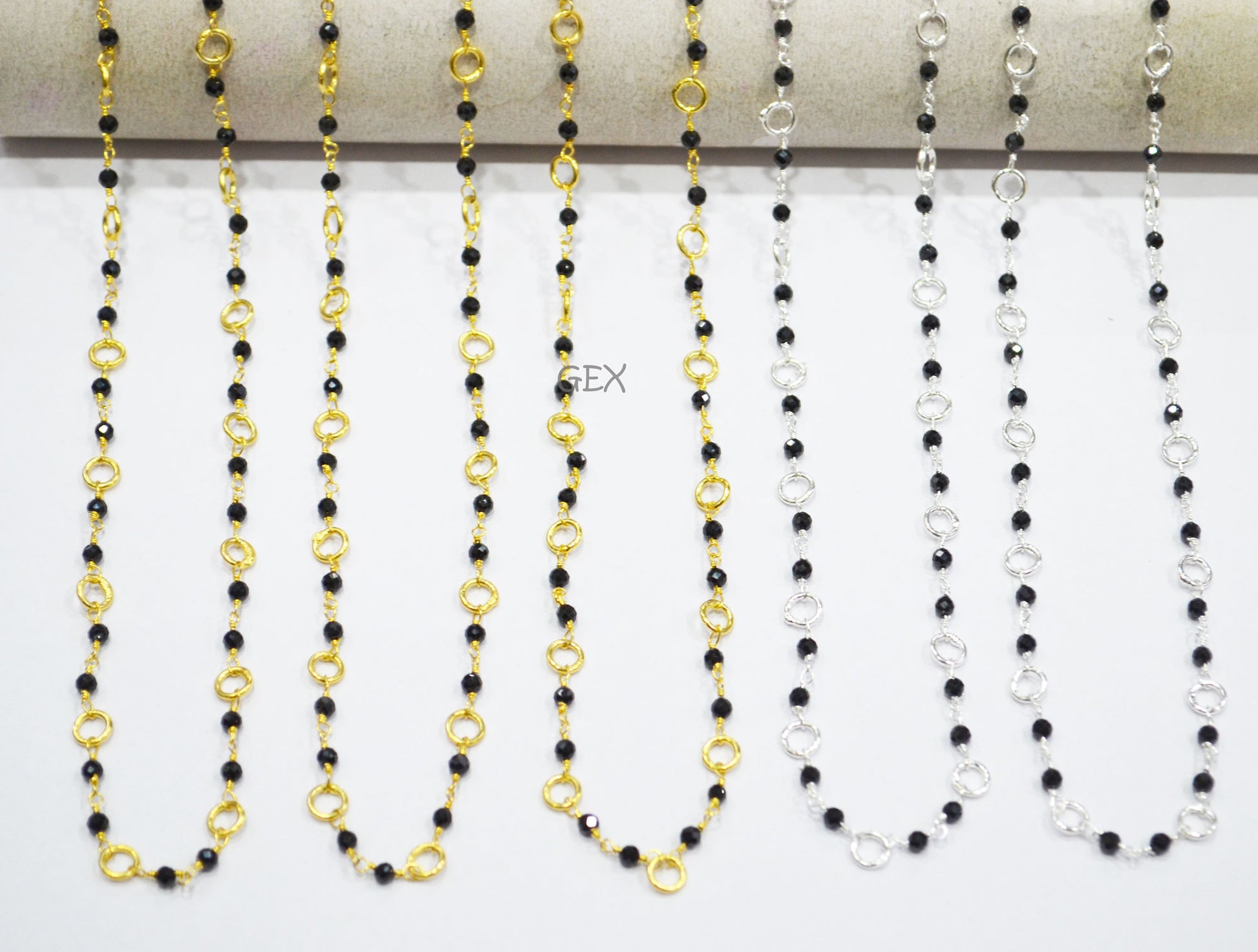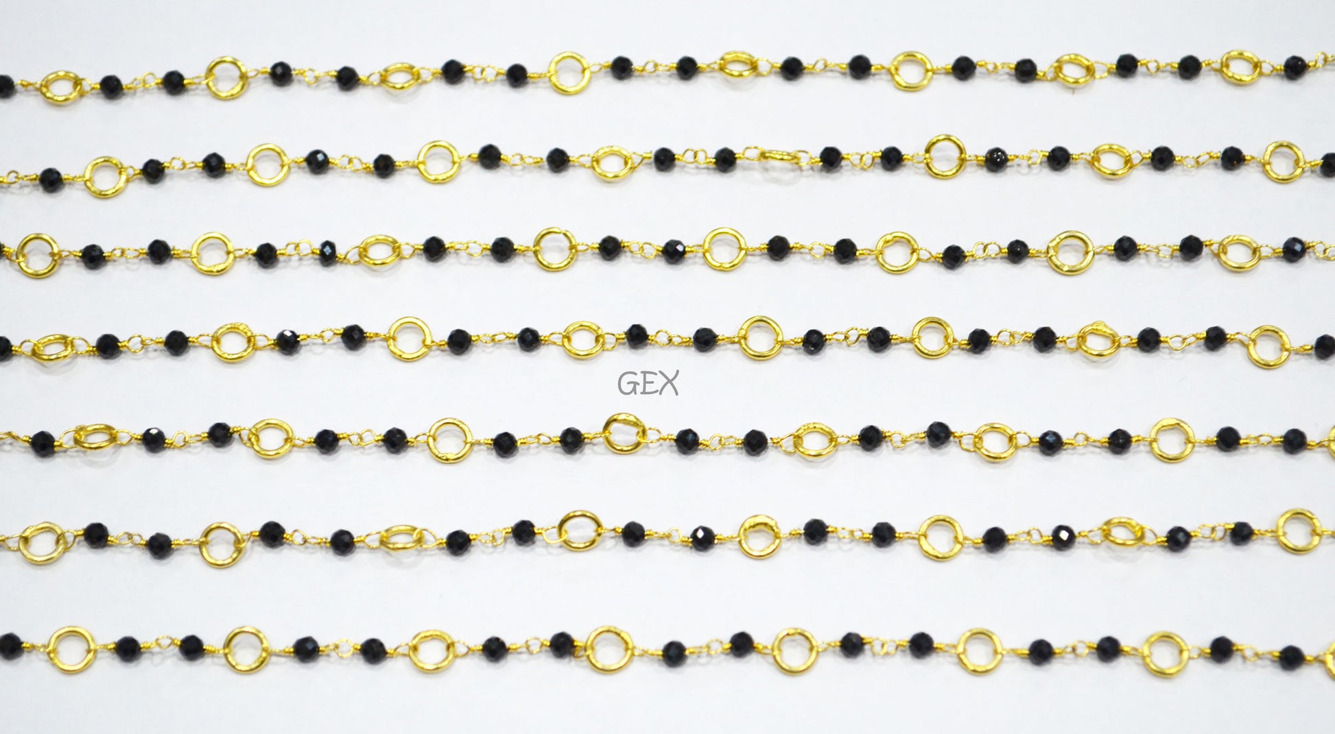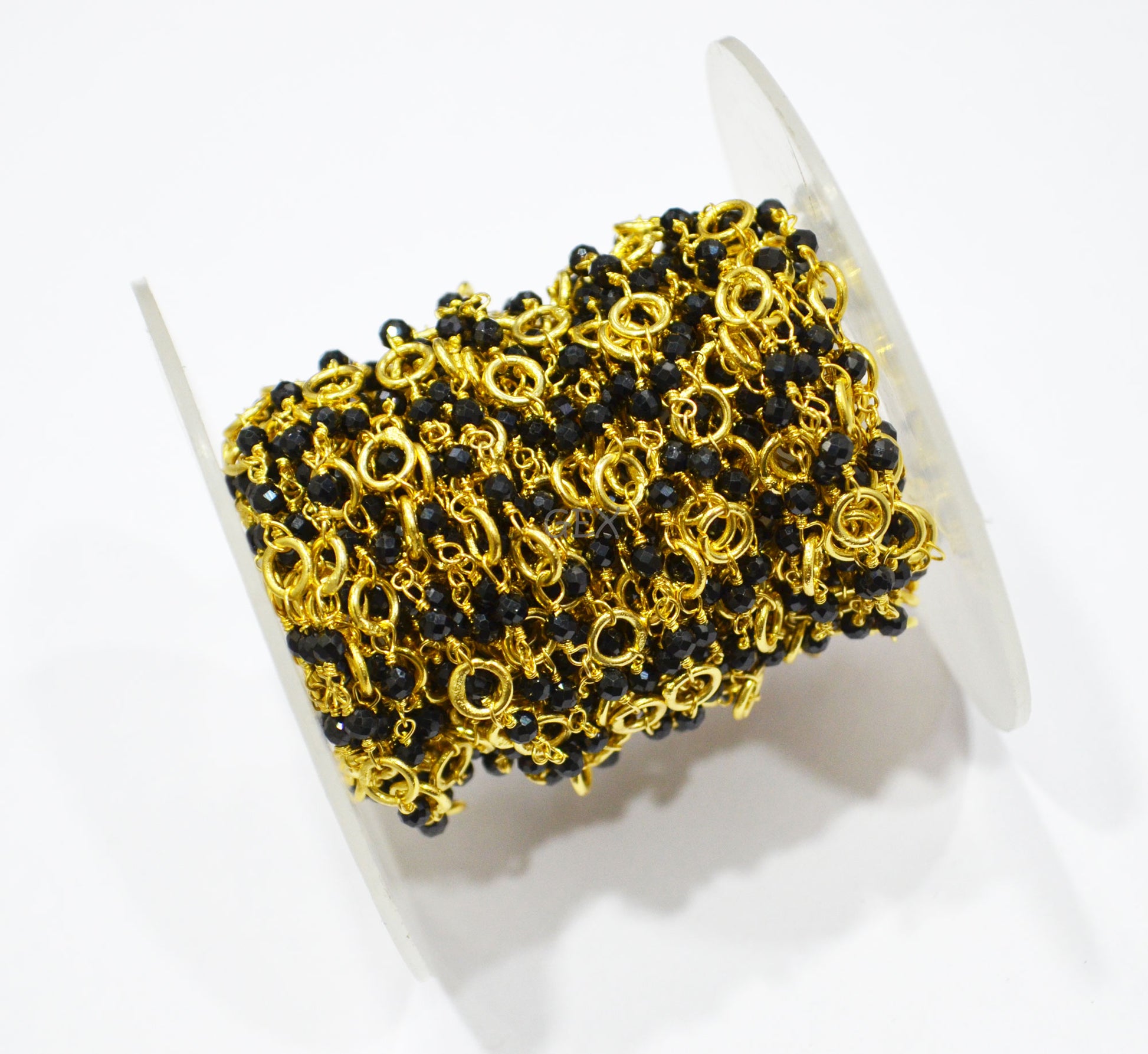 Black Spinel Faceted Round Shape Rosary Beaded Chain , Black Spinel With Brass Rings Round Shape Wire Wrapped Chain , 3 mm , 7221