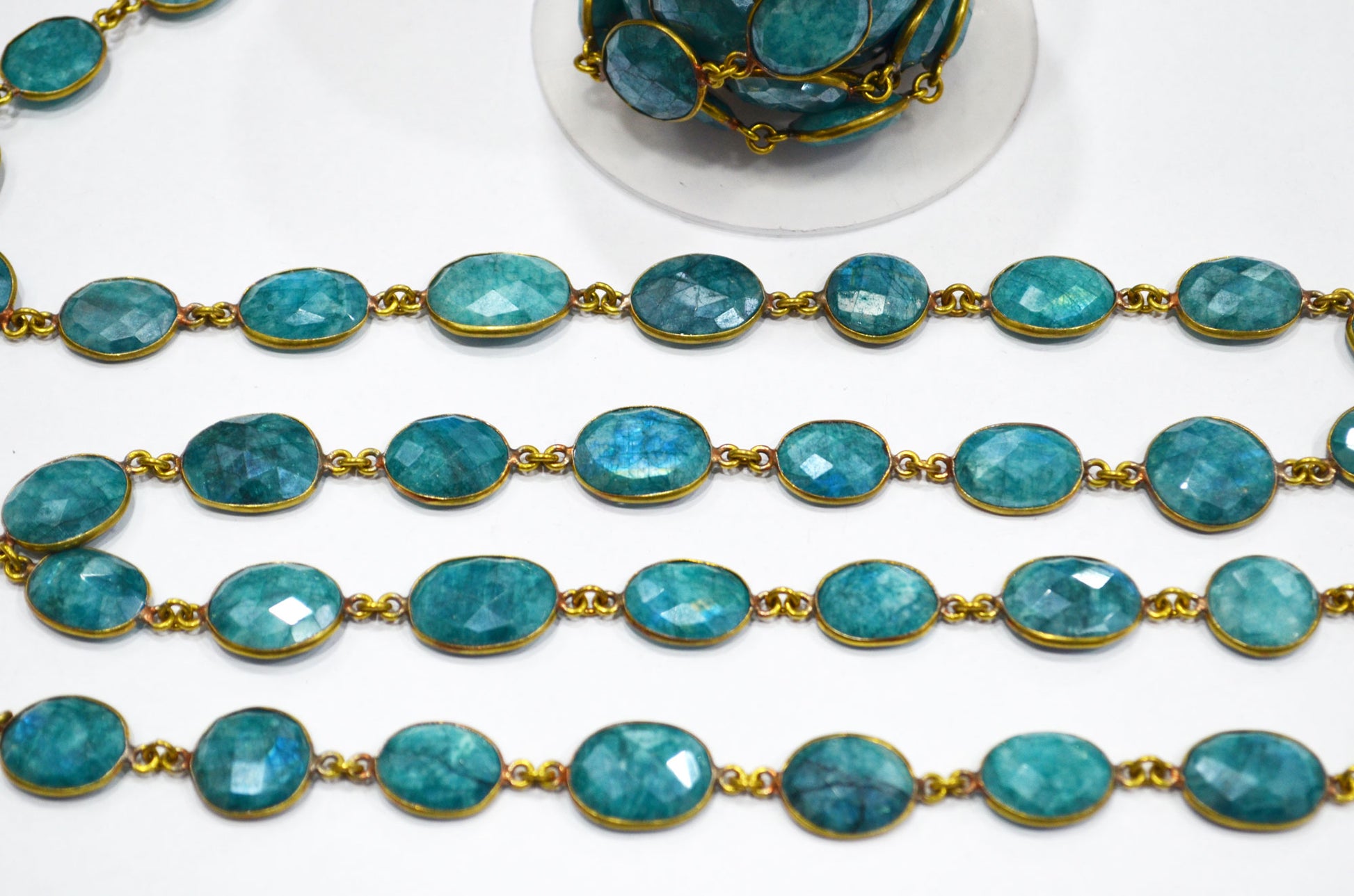 Blue Chrysocolla Colored Rainbow Moonstone Slice Shape Connector Chain , Blue Chrysocolla Colored Rainbow Moonstone Free Form Shape Bezel Link Chain , 12 - 17 mm , RB-6037